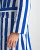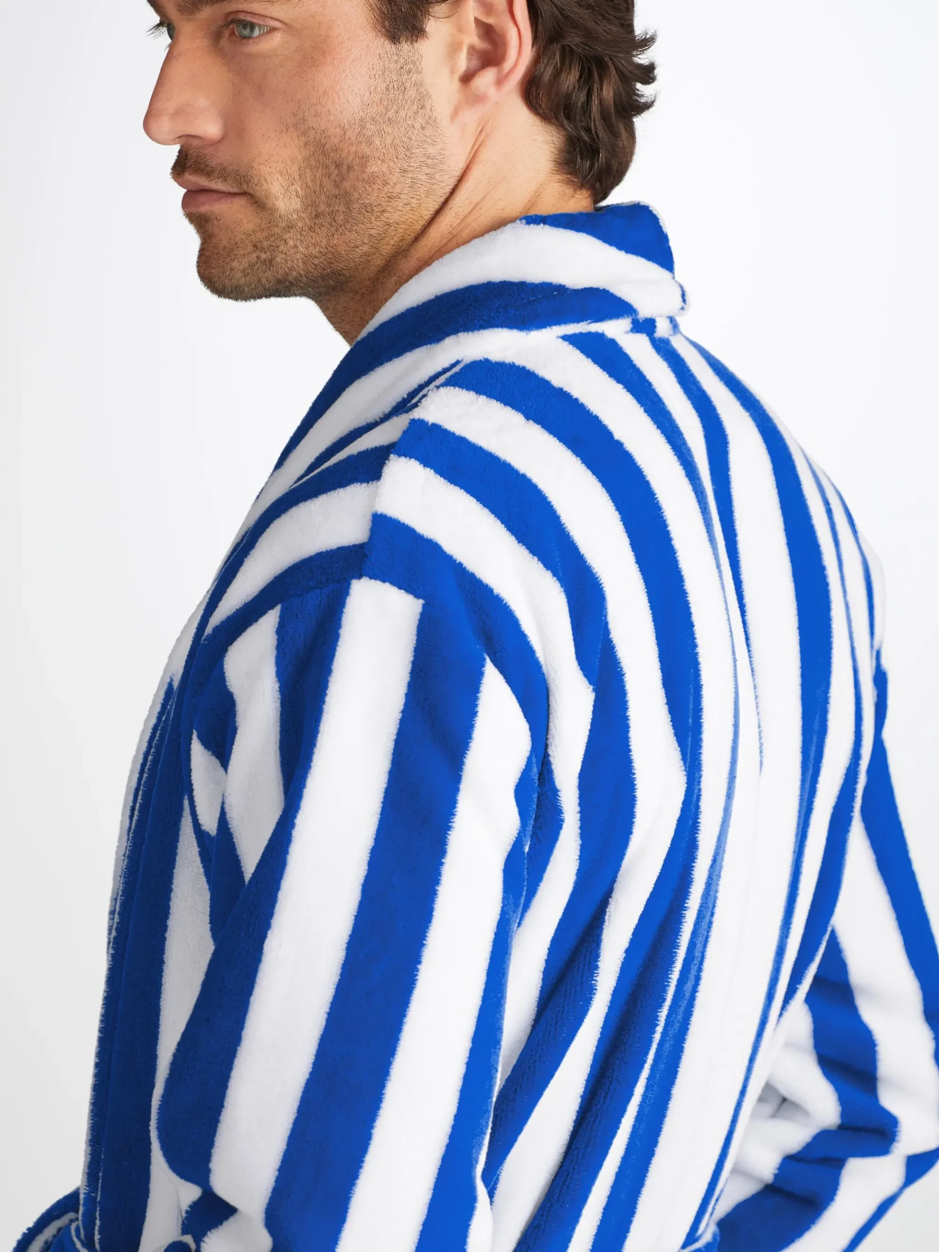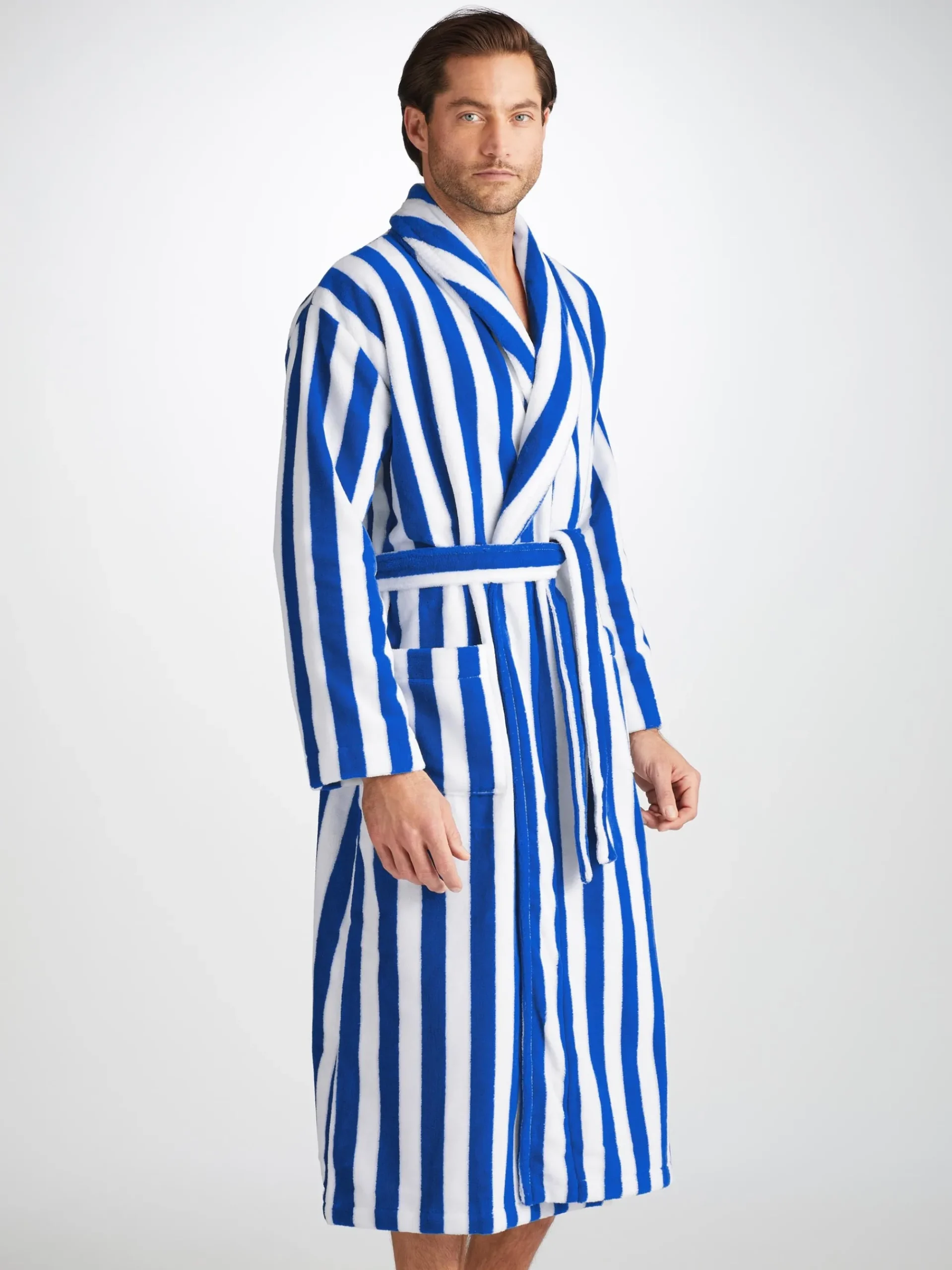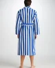 Our Aston bathrobe is a customer favourite, seen here with classic blue and white stripes, it features a classic shawl collar and two side pockets for practicality while around the house. It’s fastened with a fabric tie belt for the perfect fit.