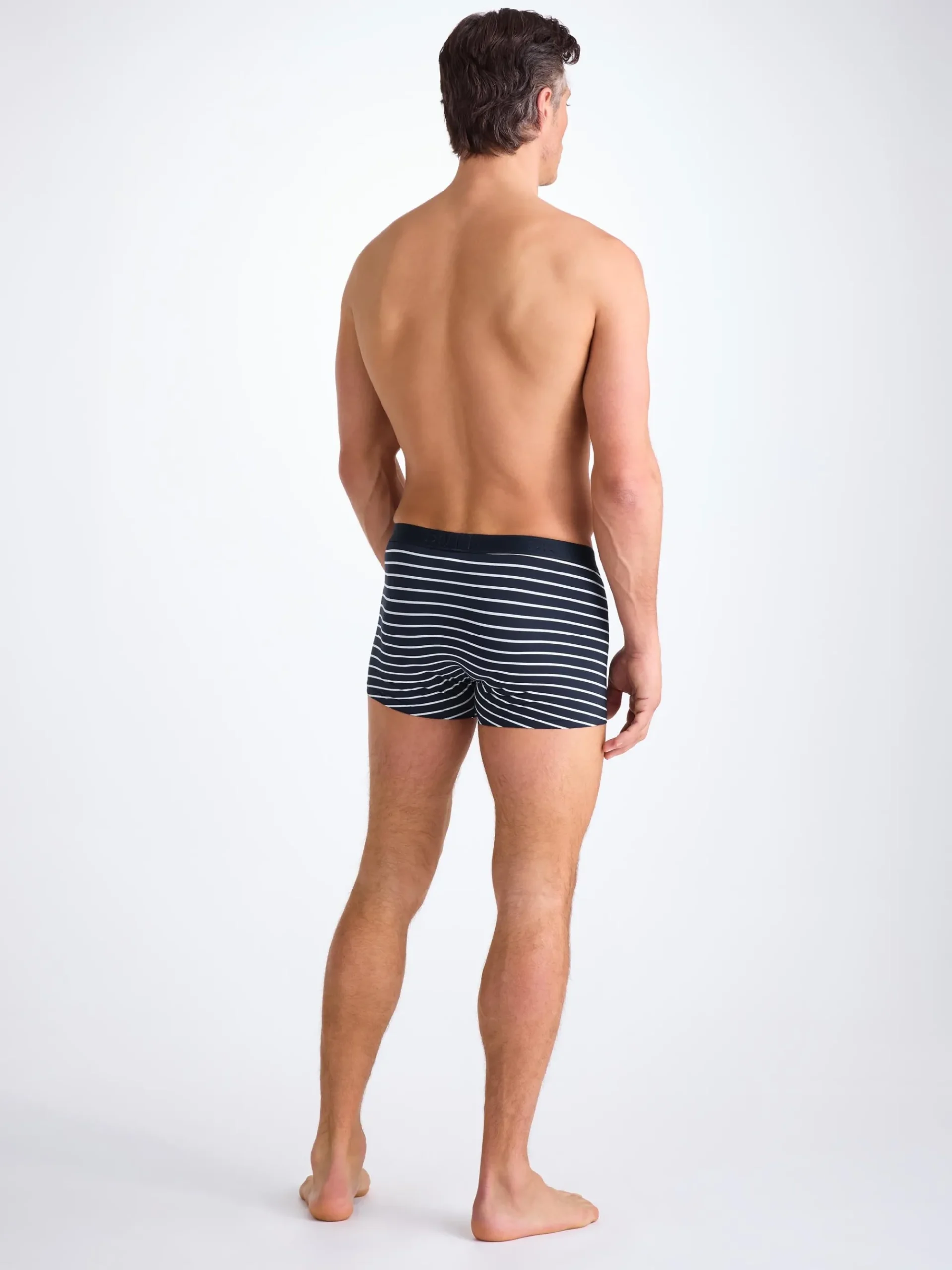 For those who prefer their boxer briefs with shorter legs, our cotton stretch boxer briefs combines a closed front with a streamlined, shorter leg. Featuring a classic navy and white toned stripe print.