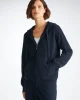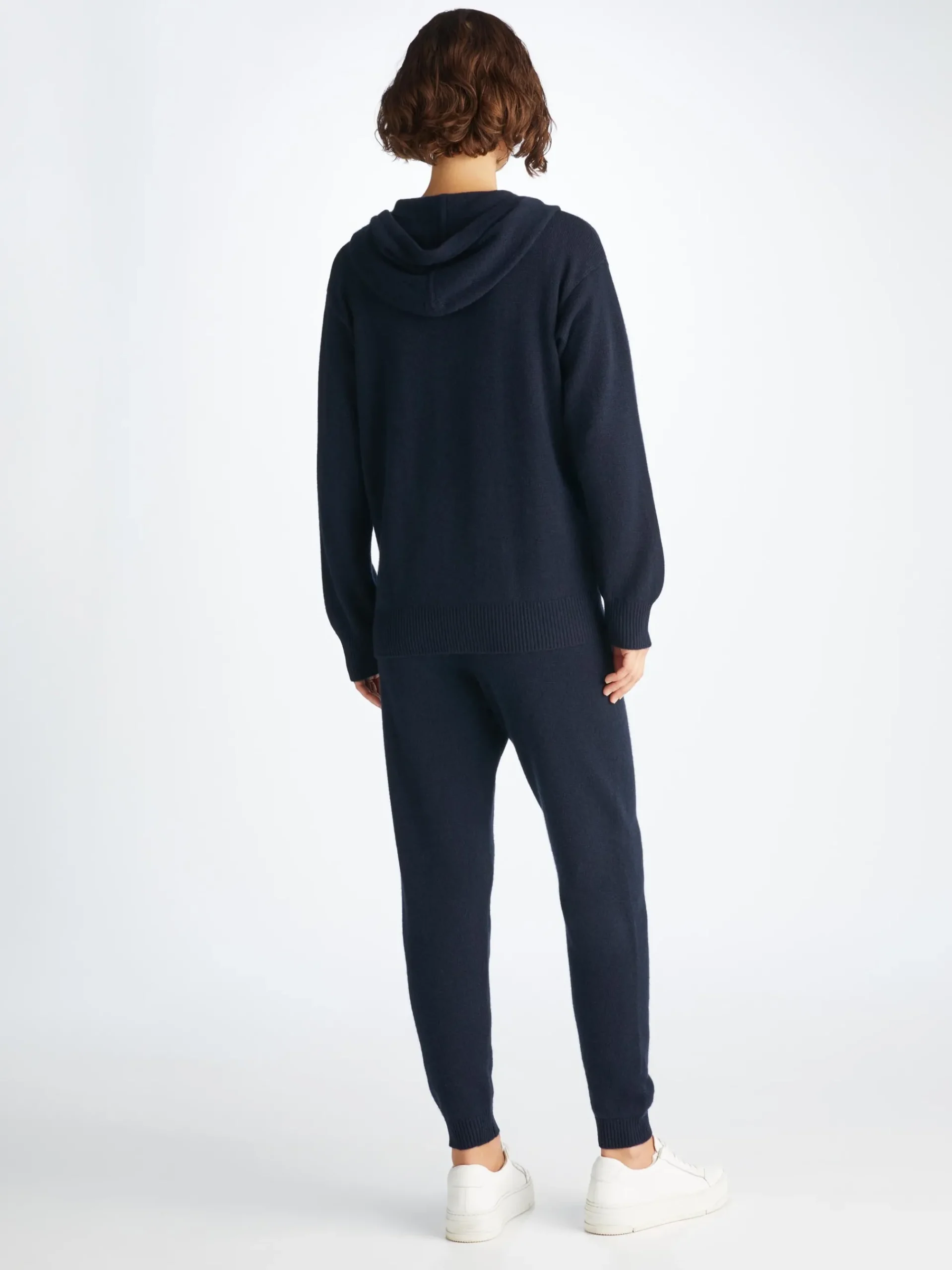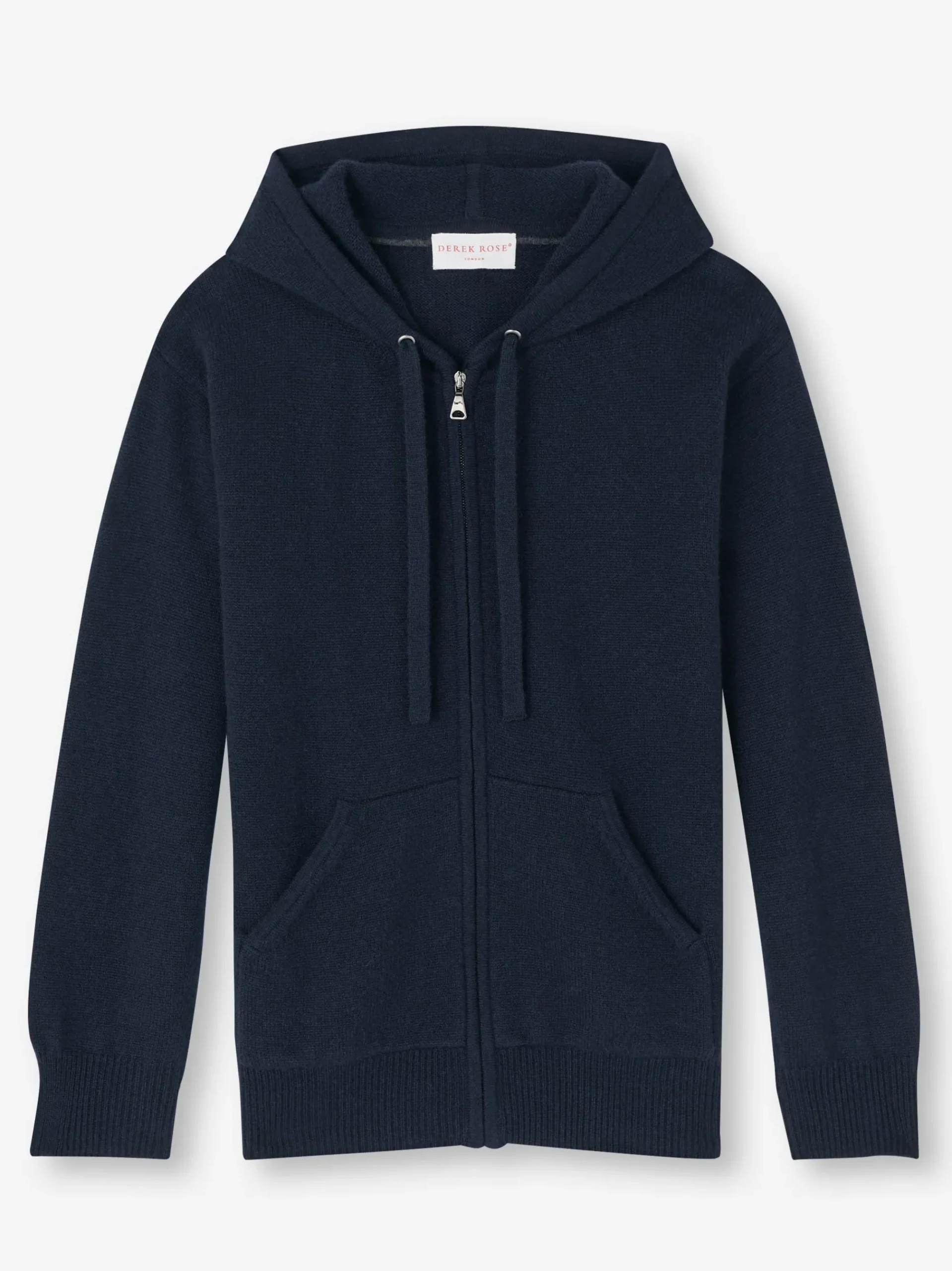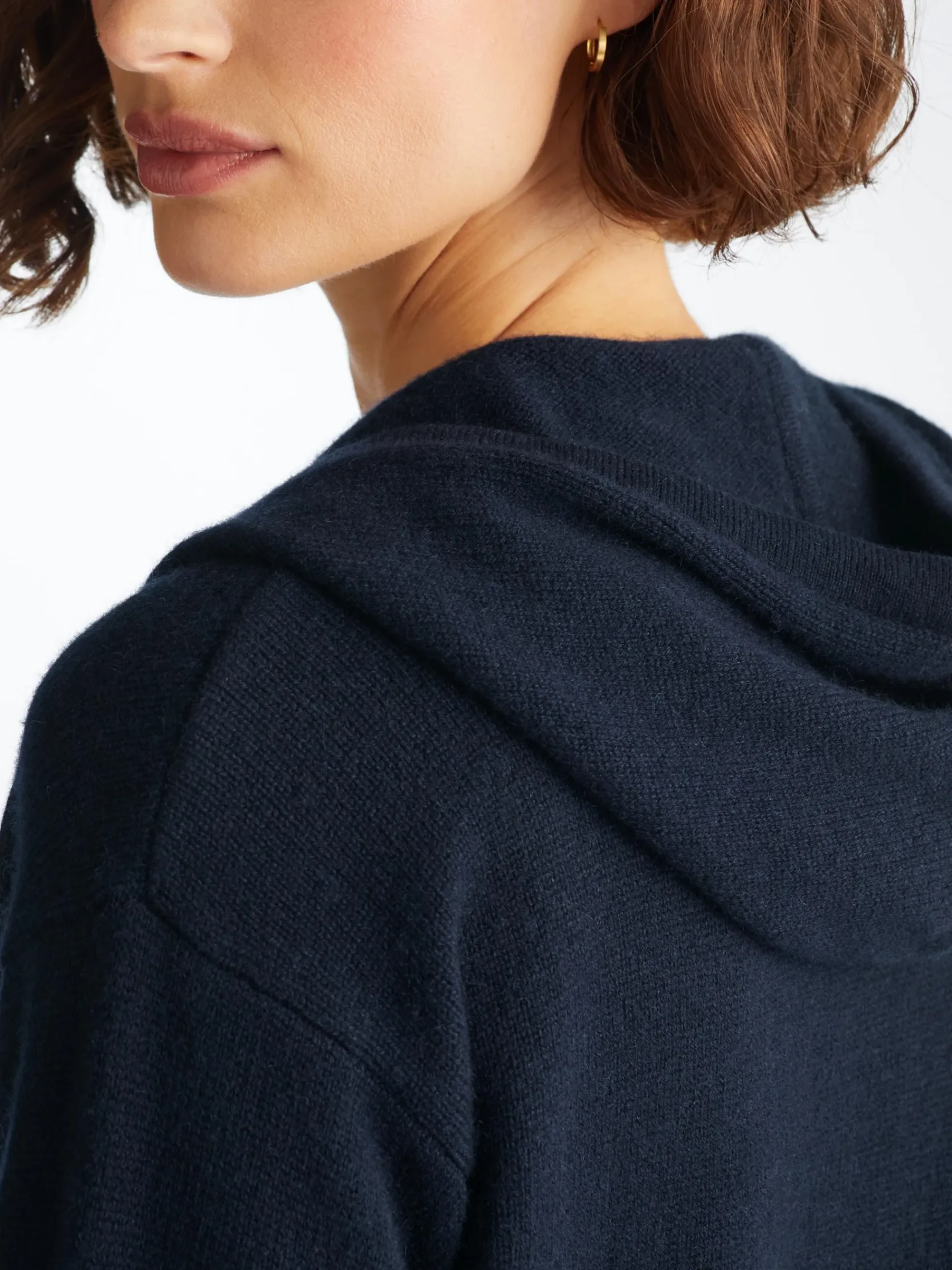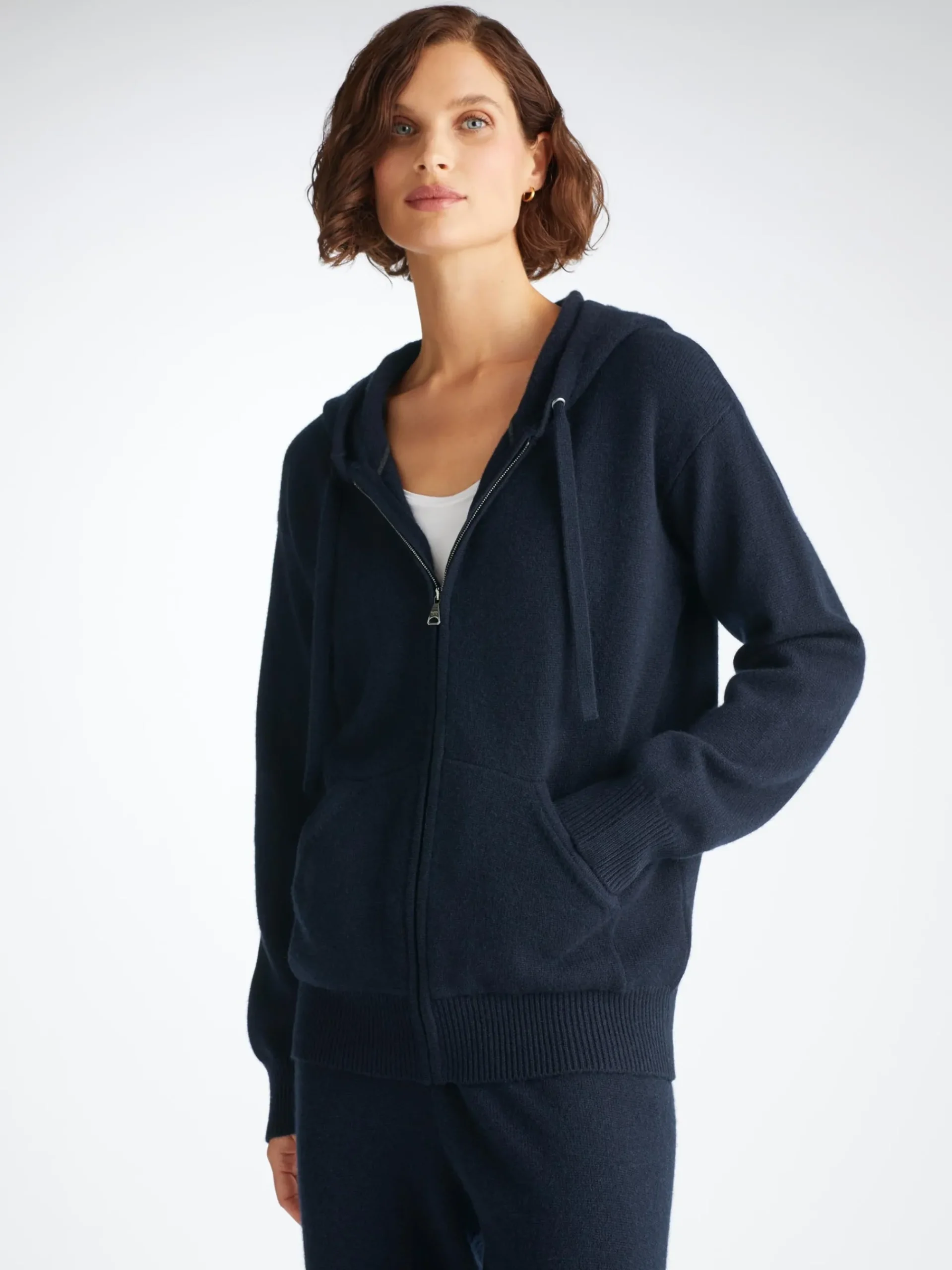 Our new Daphne women’s relaxed cashmere hoodie in classic navy has a flattering but relaxed fit. With details such as front patch pockets, dropped shoulders, ribbed cuffs and hem – for ease of movement, and a drawstring hood to keep you warm should you need it.