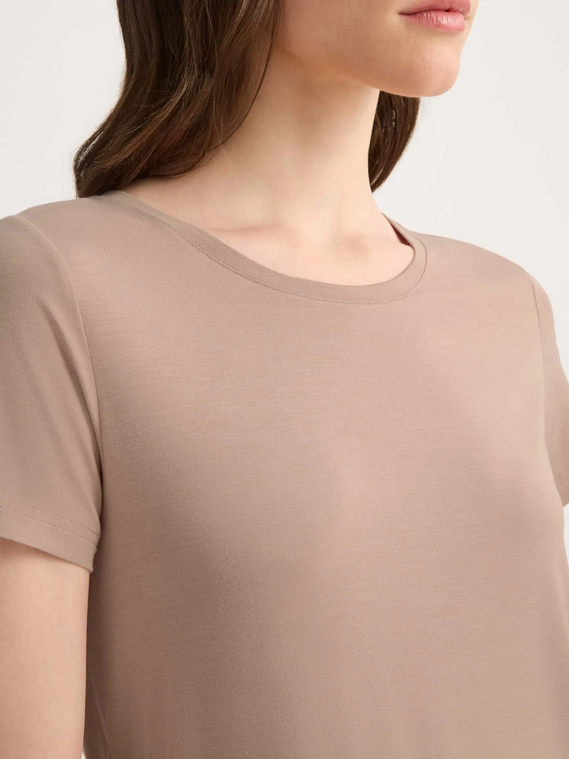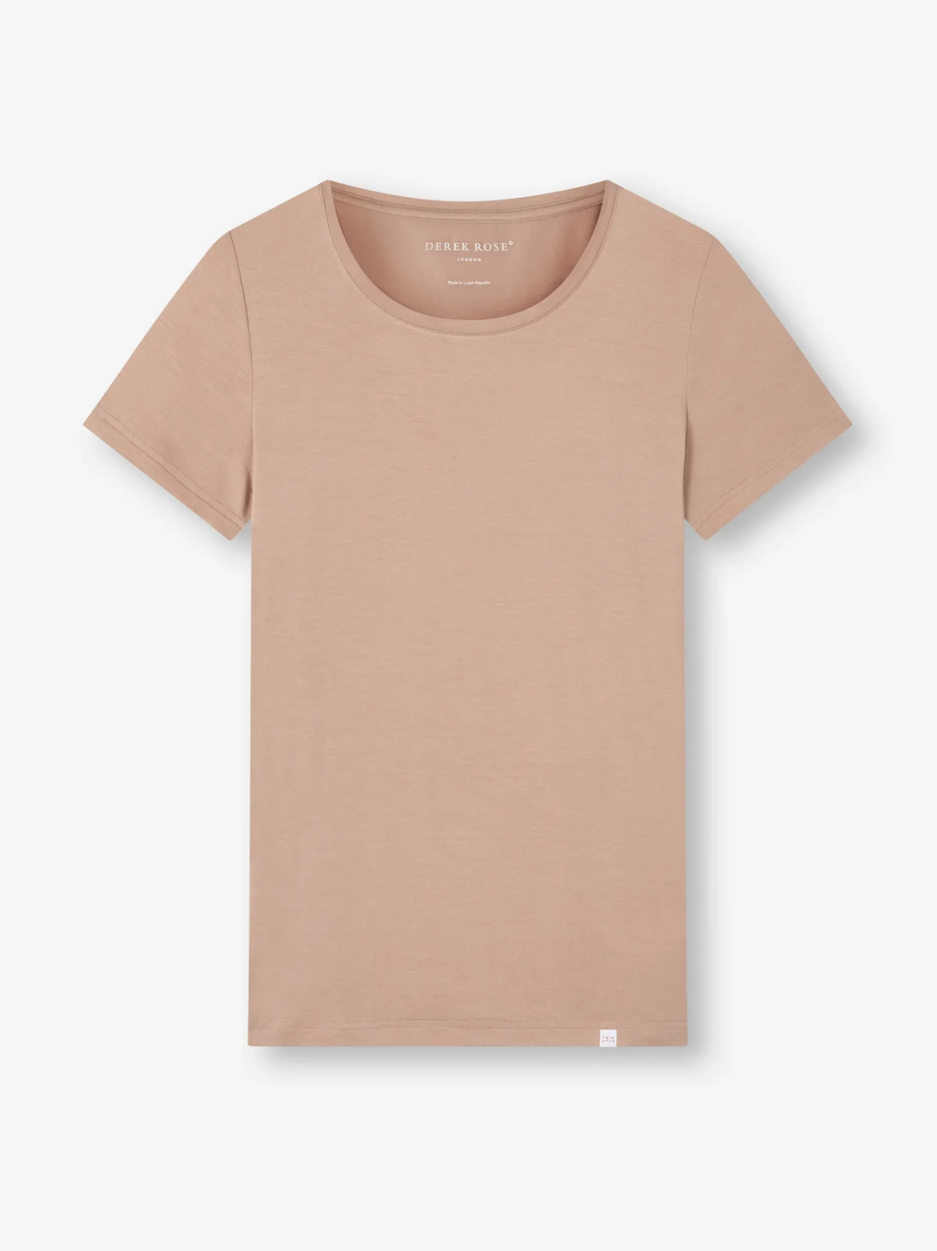 Soft, breathable, and effortlessly comfortable, the Lara t-shirt in almond is a wardrobe favourite that transitions seamlessly from daywear to nighttime. With its classic crew neckline and gently flattering modern silhouette, it’s a versatile piece that works beautifully on its own, layered under a blazer, or with matching pyjamas.