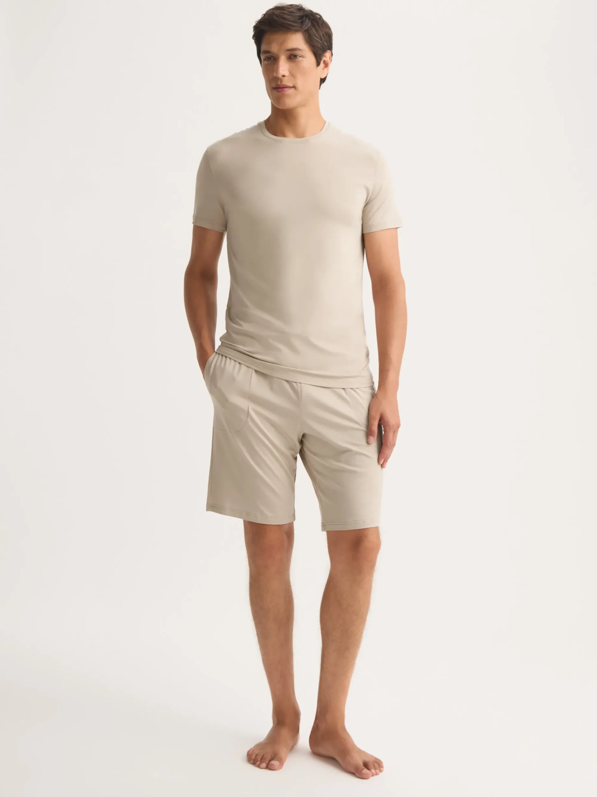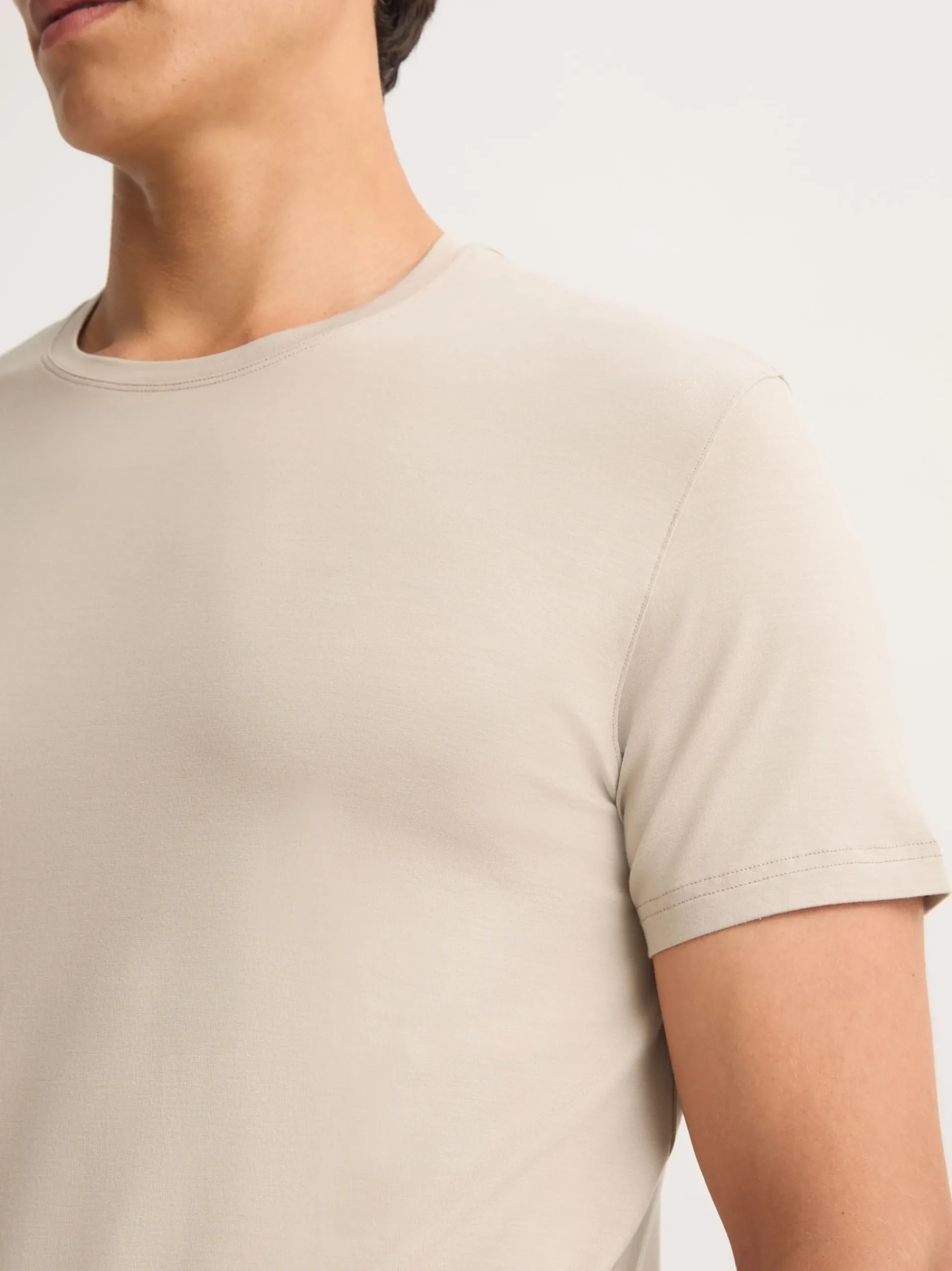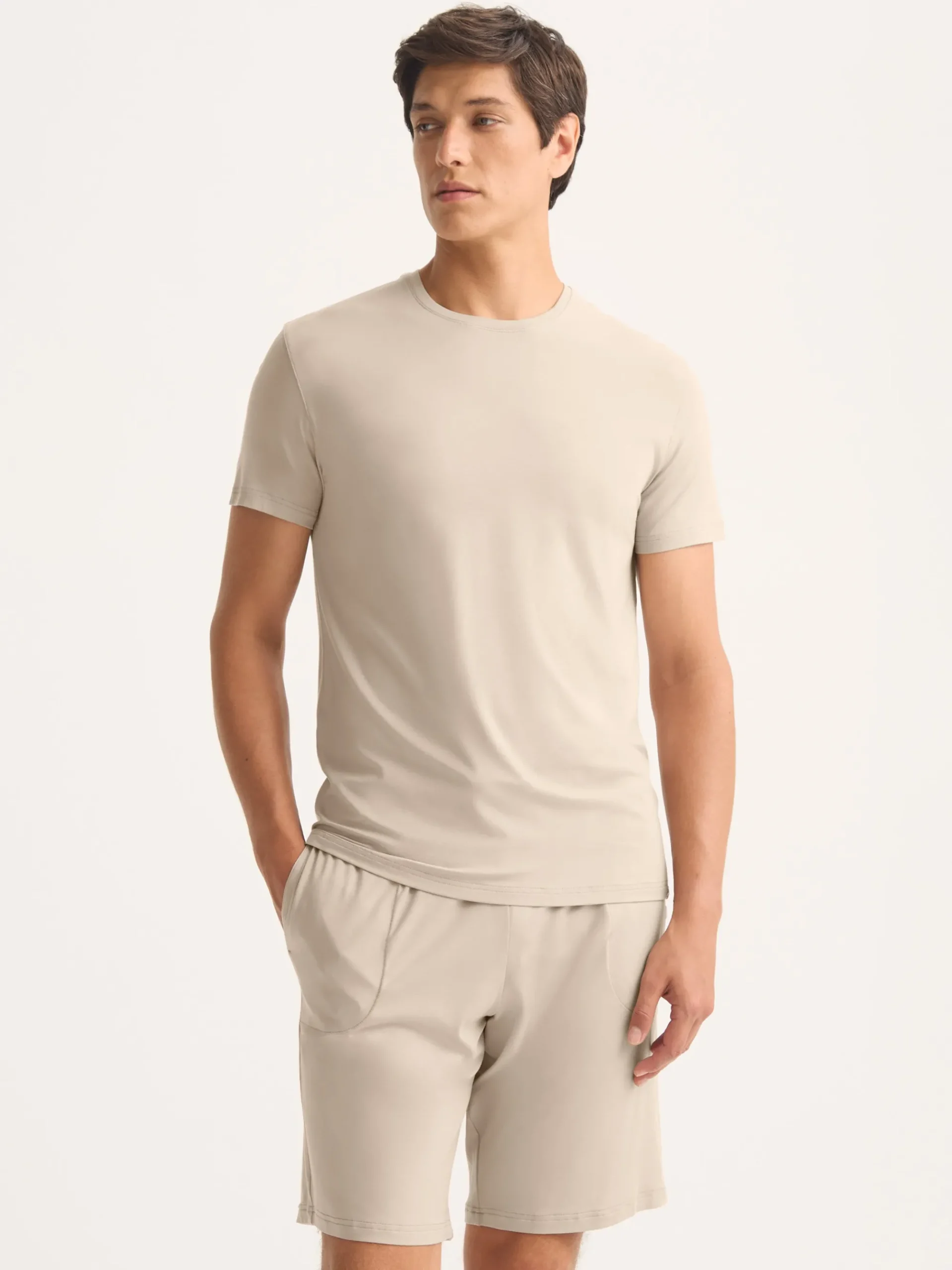 Our signature Basel menâs t-shirt in light stone is the perfect blend of style and easeâlightweight, breathable and exceptionally soft. Made from stretch micro modal, it moves with you and adapts to your bodyâs temperature, keeping you cool or warm as needed. Ideal for lounging, sleeping or travelling in comfort, itâs a wardrobe essential youâll reach for again and again.