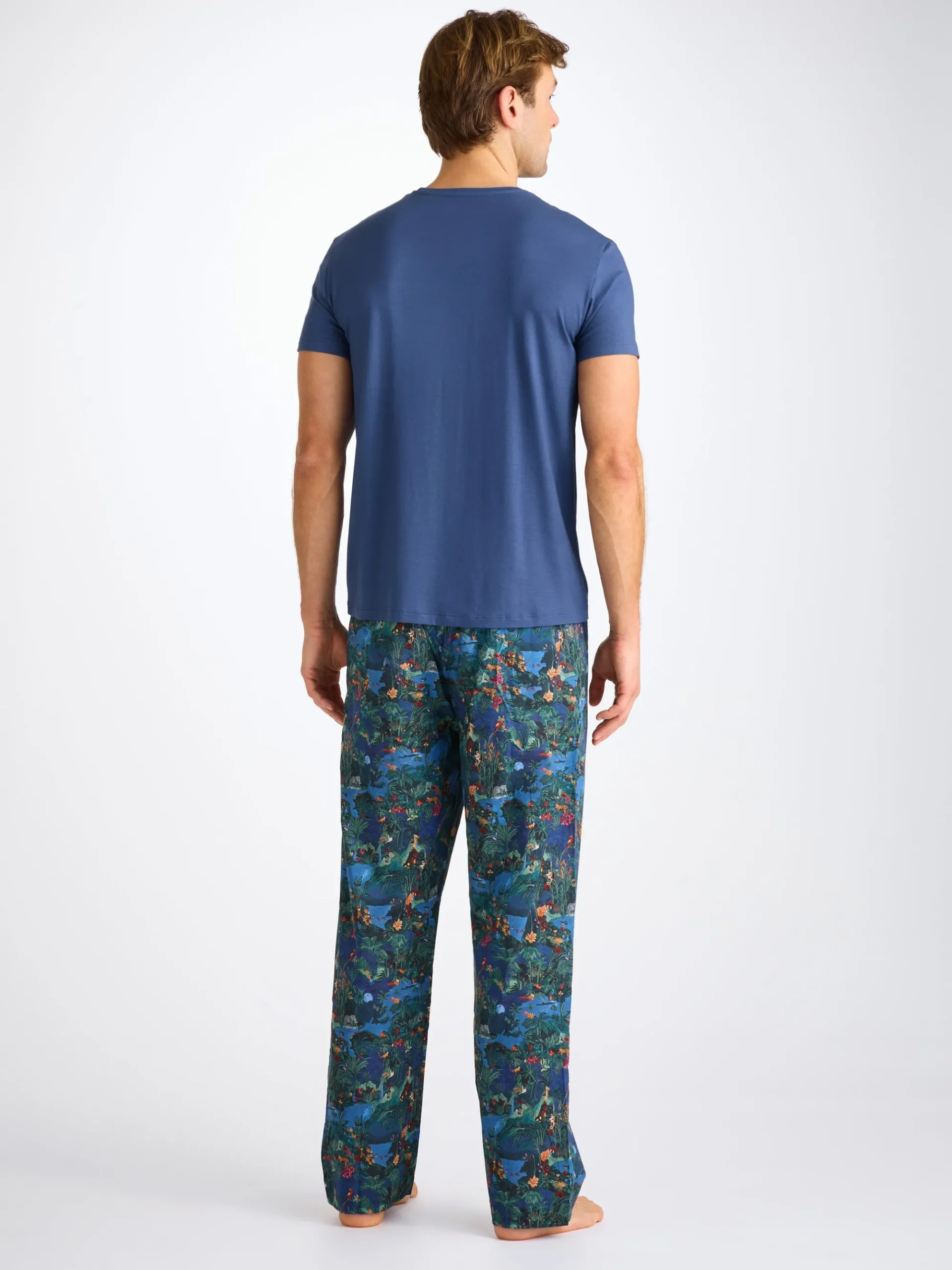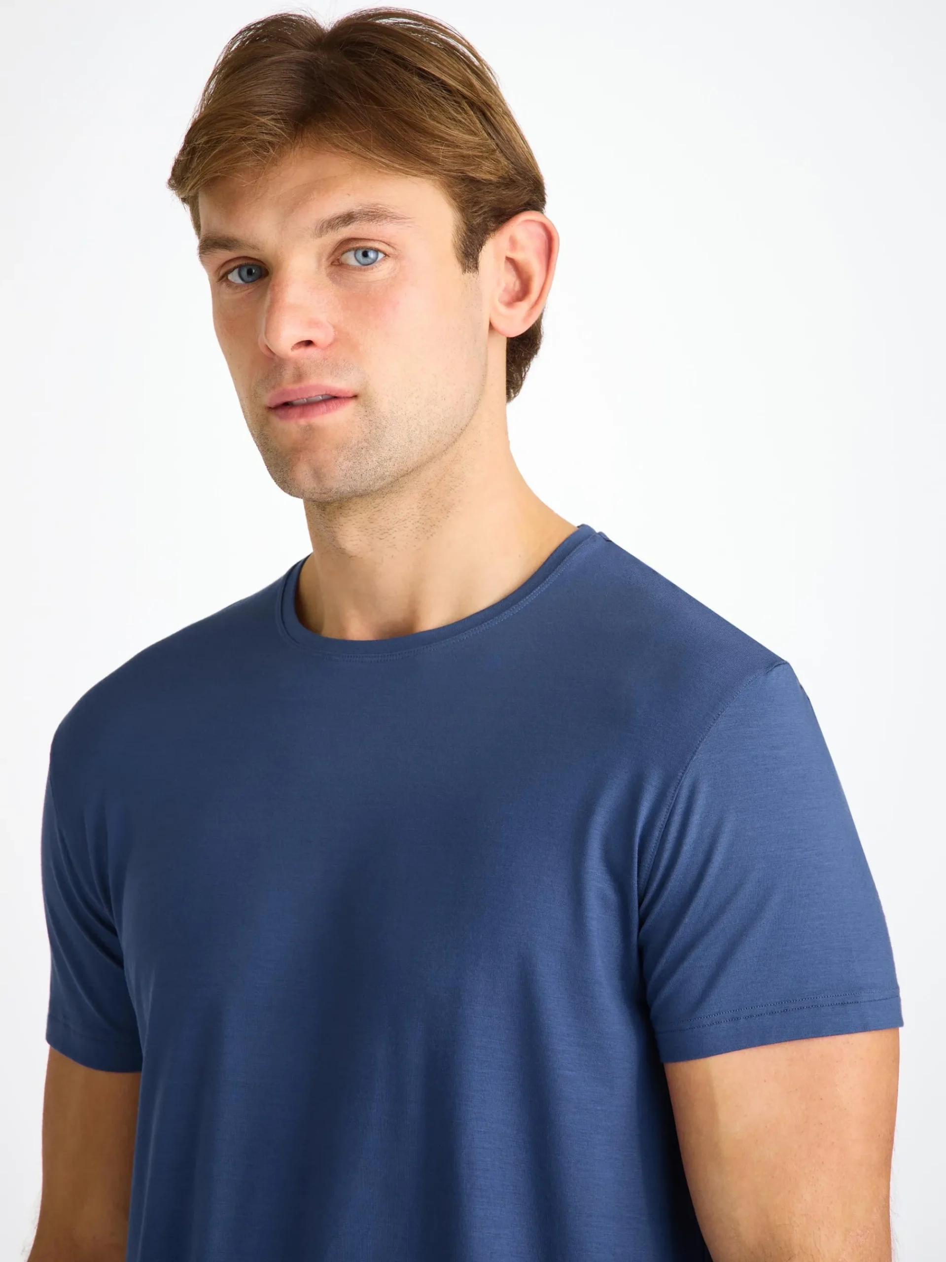 Our Basel menβs T-shirt in sapphire brings a vivid, modern tone to our signature softness. Made from stretch micro modal, it offers a fluid drape and gentle comfort ideal for sleep, lounging or long travel days.