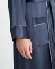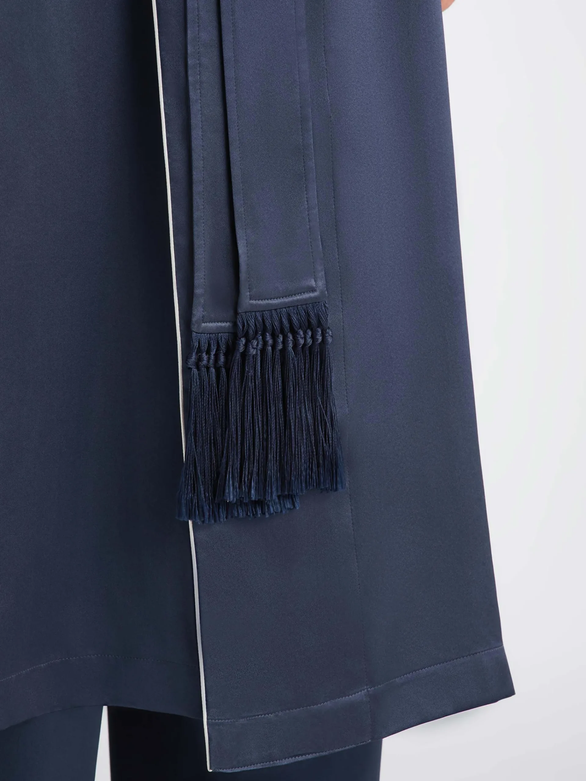 This garment has also been fully piped by hand in a complementary light grey silk piping and finished with a navy tasselled belt for an added touch of luxe.