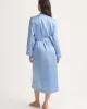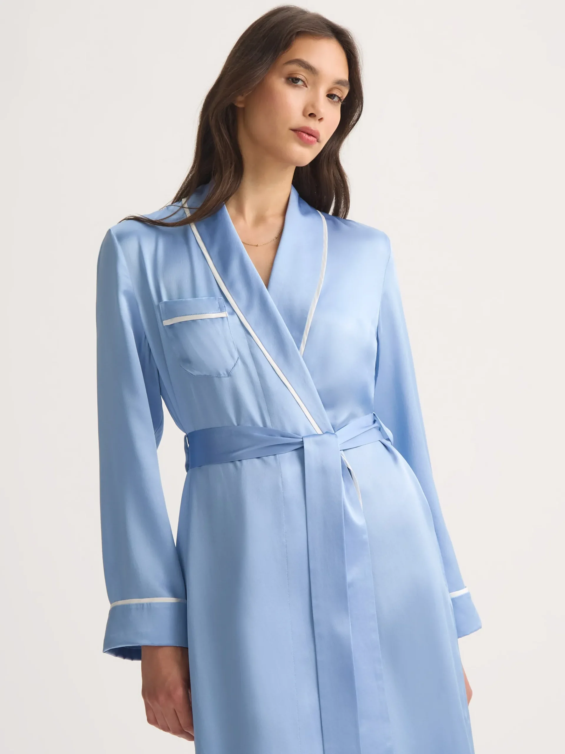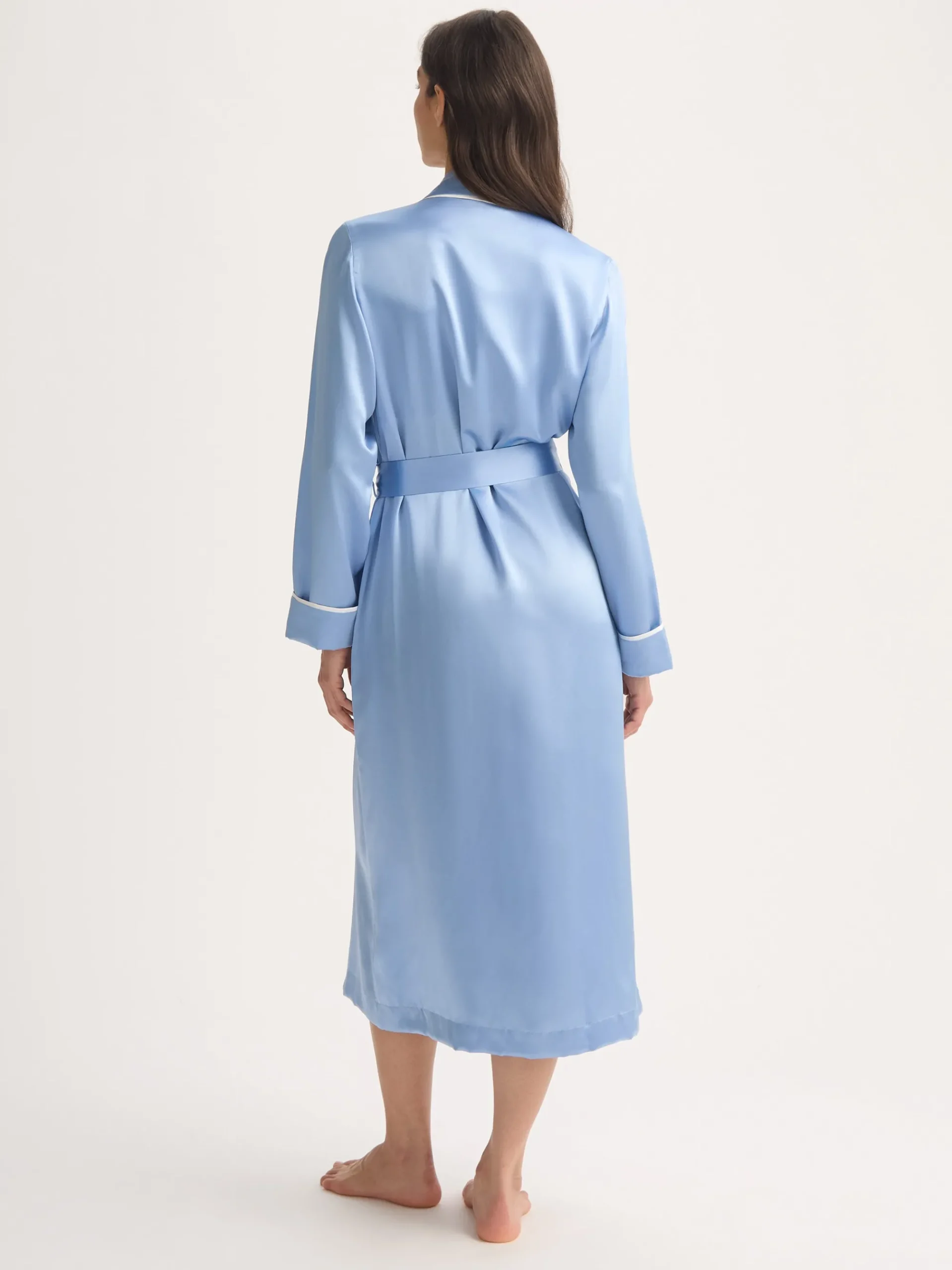 The women’s Bailey long dressing gown is crafted from 100% pure silk in a serene cloud blue, offering a smooth satin finish and an elegant drape. Produced in limited quantities at our silk studio in Cheshire, England, each gown is the result of hours of dedicated craftsmanship.