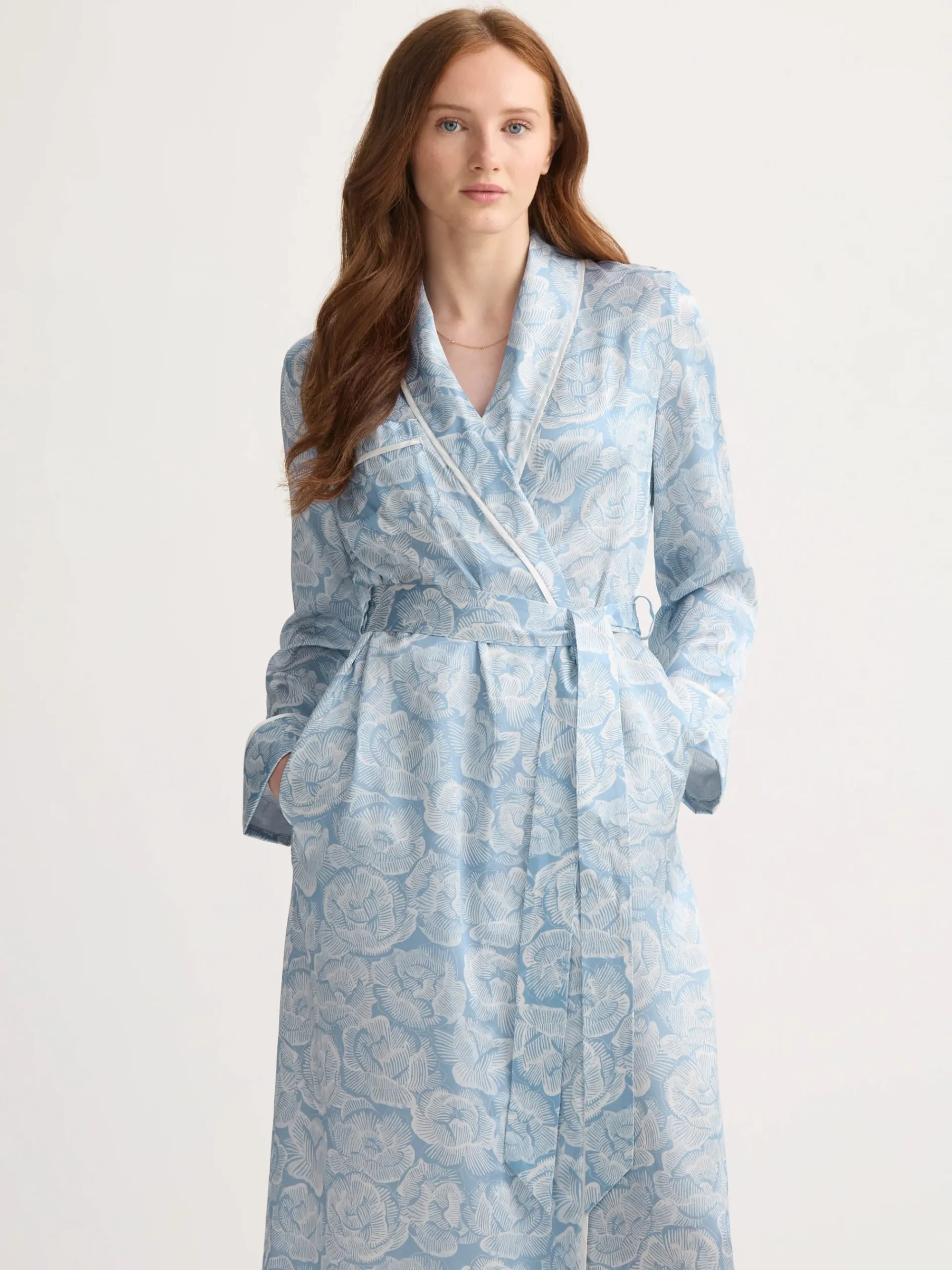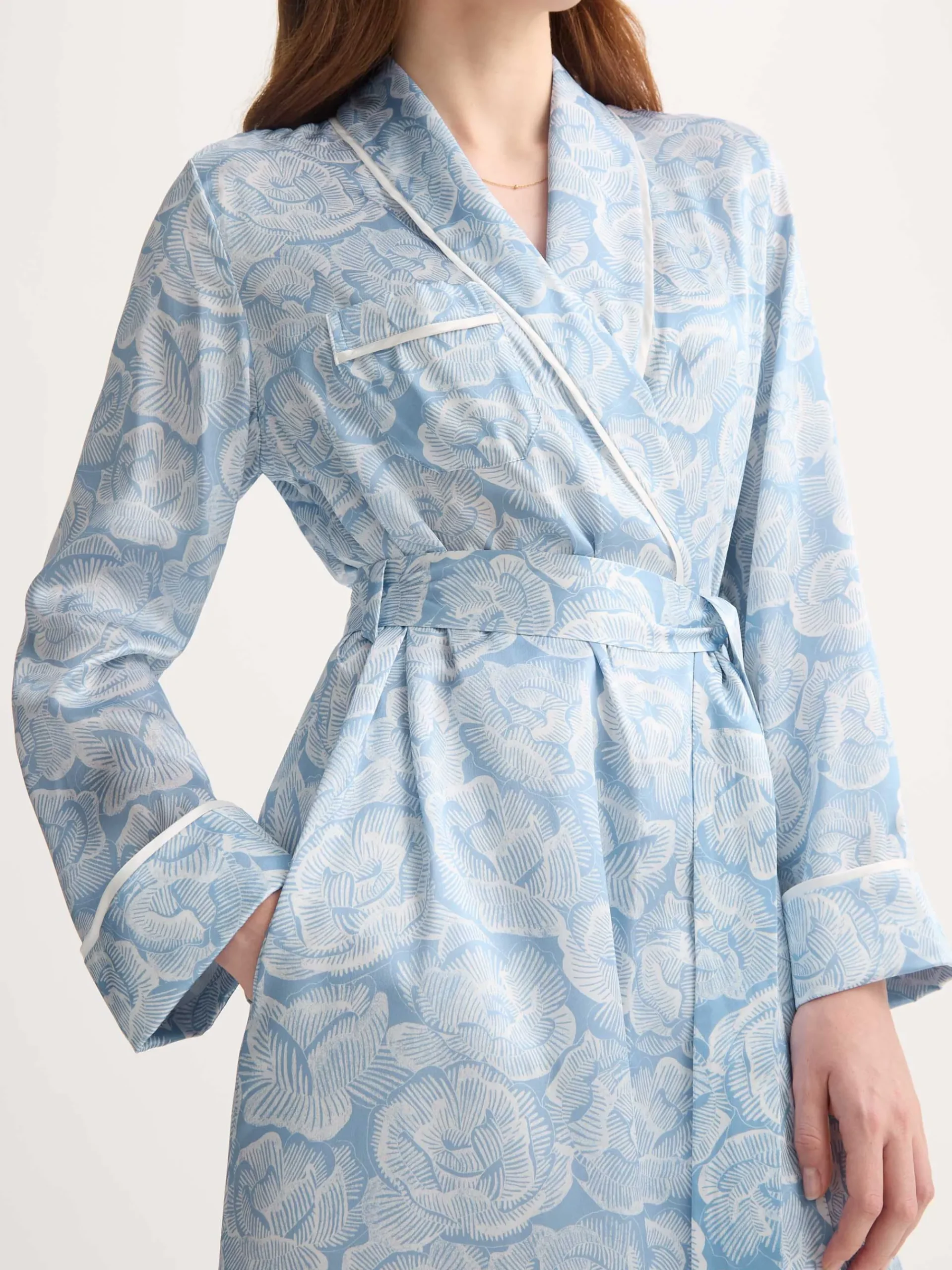 Crafted from the finest 100% Mulberry silk, this long dressing gown combines timeless elegance with exceptional comfort. The delicate light blue and white rose print celebrates the heritage of Derek Rose, reimagined in a soft, romantic palette that feels as serene as it looks.