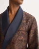 From its origins as a practical cover-up to its status as an icon of gentlemanly style, the men’s smoking jacket remains the epitome of elegant loungewear. Our version honours this heritage with a modern, minimalist cut while showcasing a luxurious silk jacquard in navy blue and antique gold paisley.