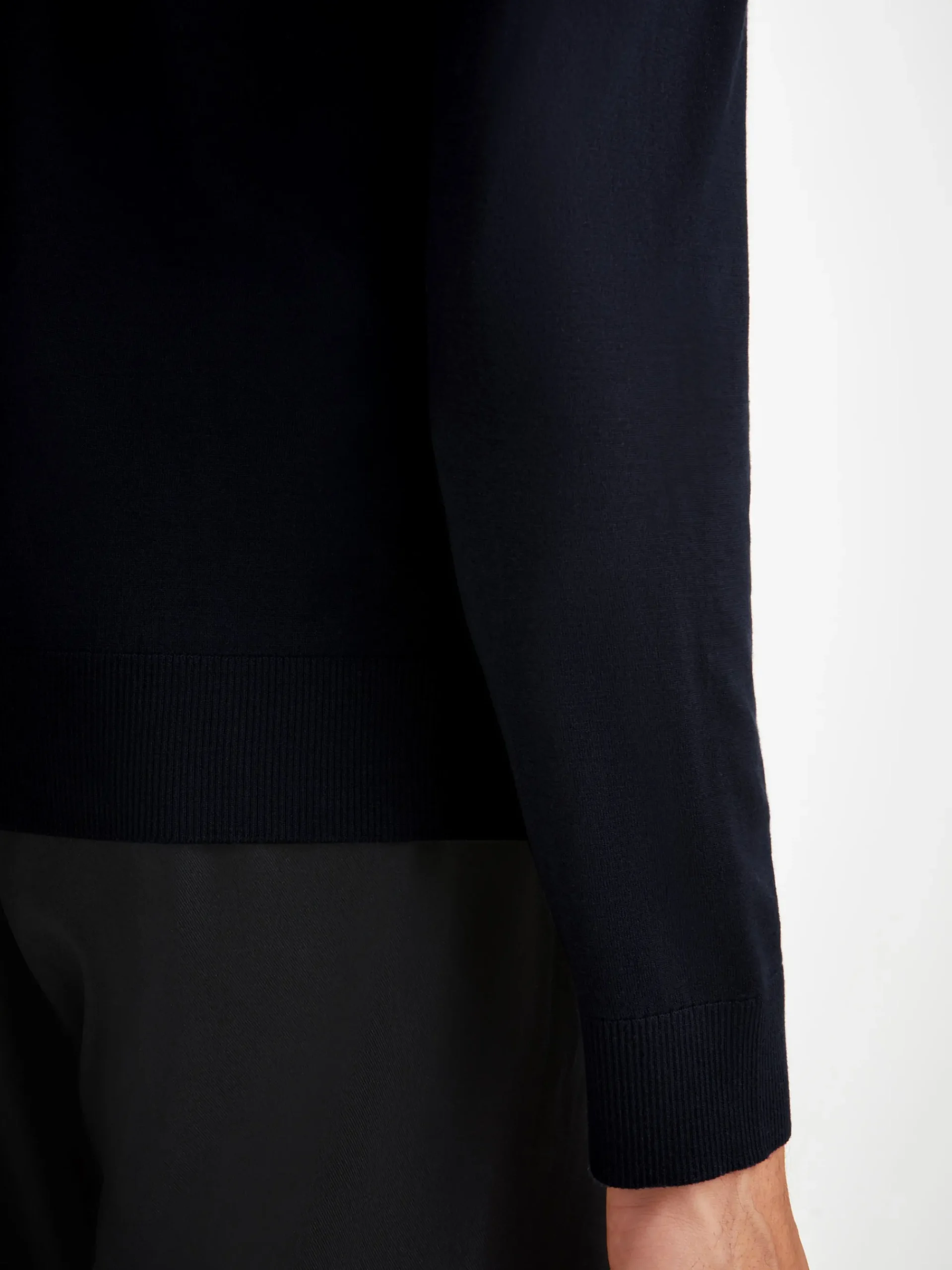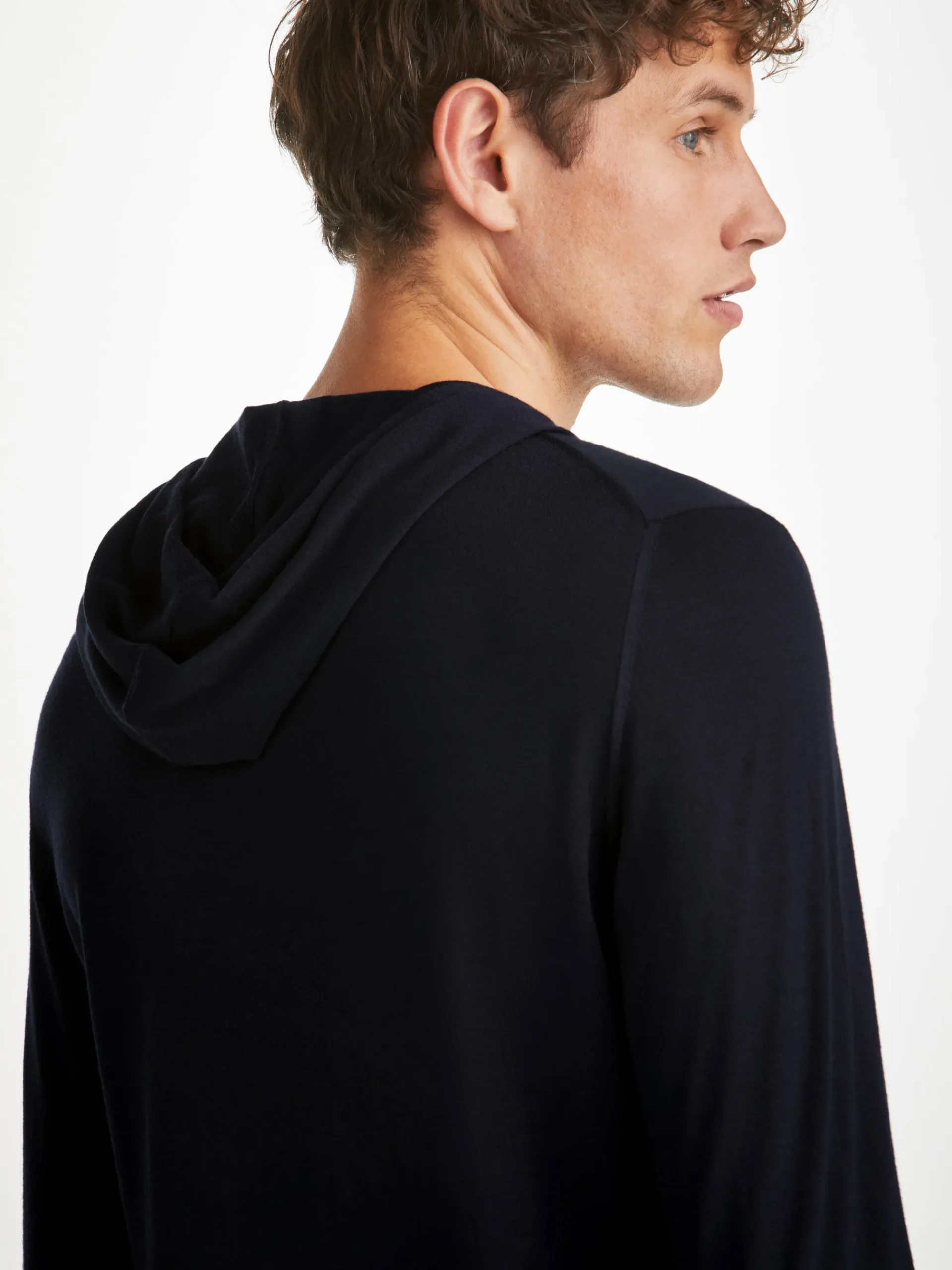 Designed with 100% merino wool, our Orson navy hoodie has been created with a ribbed neckline and cuffs as well as a practical hood.