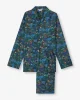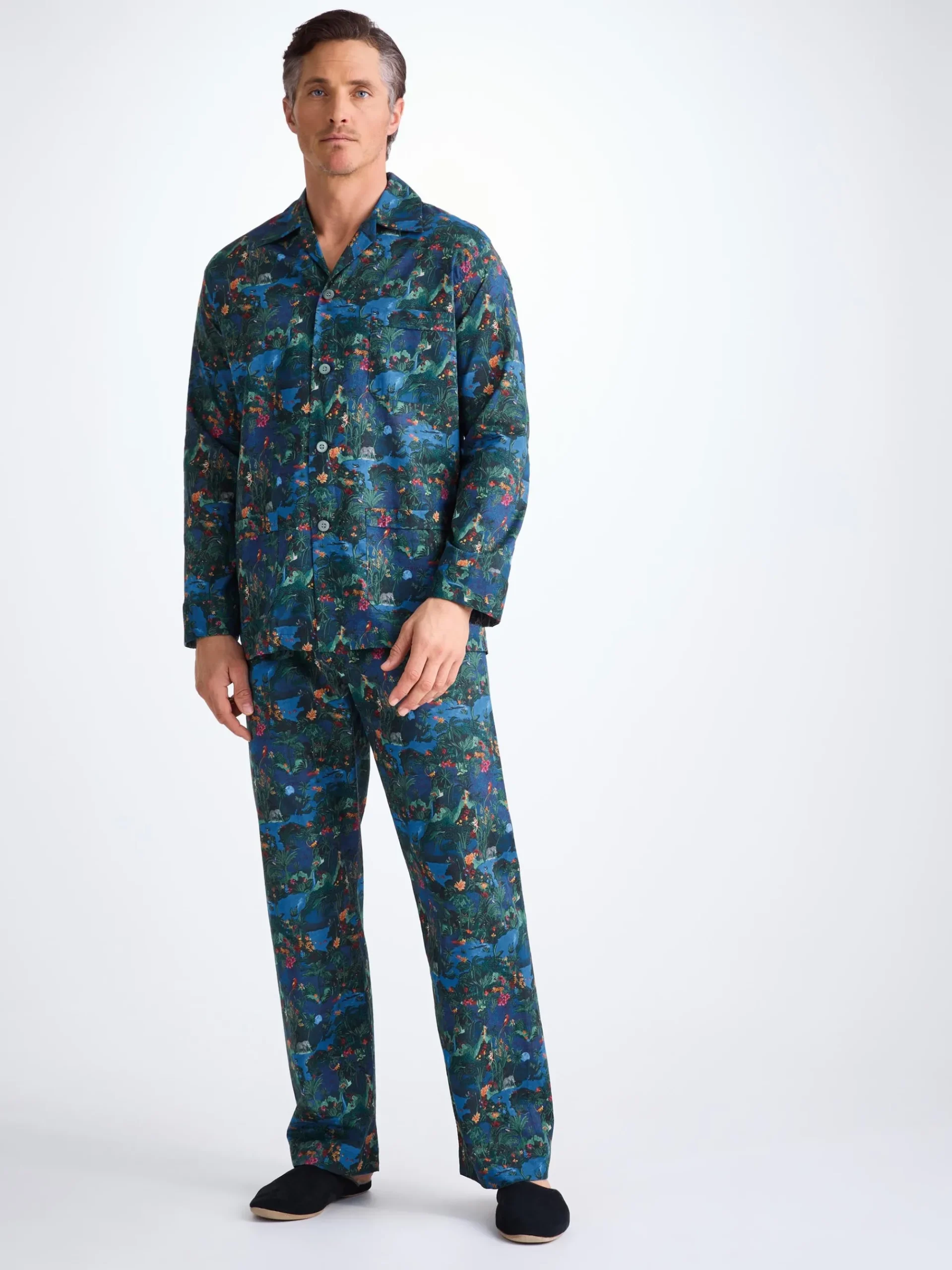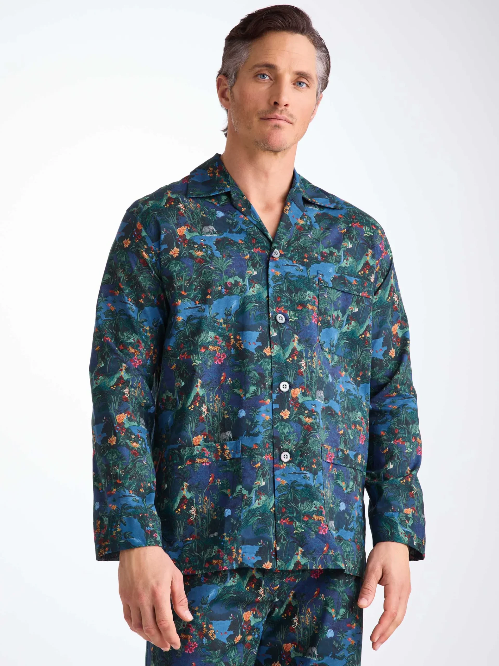 Our midnight jungle print has been created with a design hand painted in acrylic paint by our London design studio. This creation features an array of animals and tropical wildlife. Full of depth and hidden details, take a closer look and explore the midnight jungle. Made with a single breast pocket, classic flat collar, button-through top, and adjustable two-button elasticated waist, they’ll guarantee you drift off peacefully.