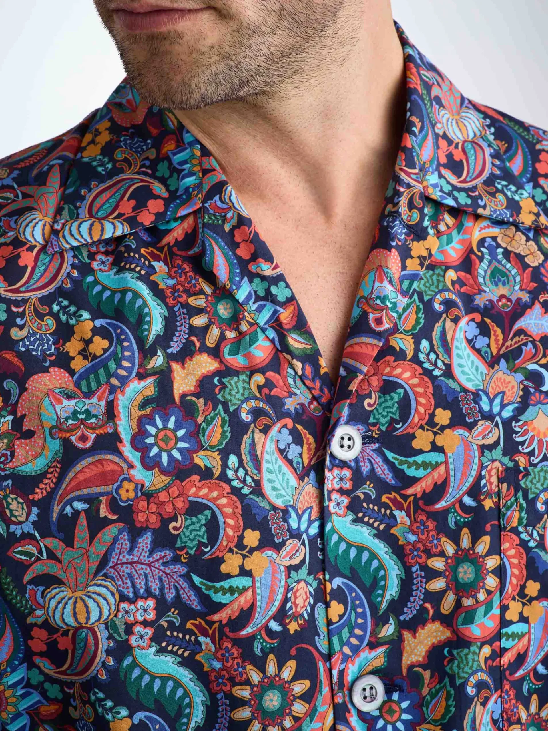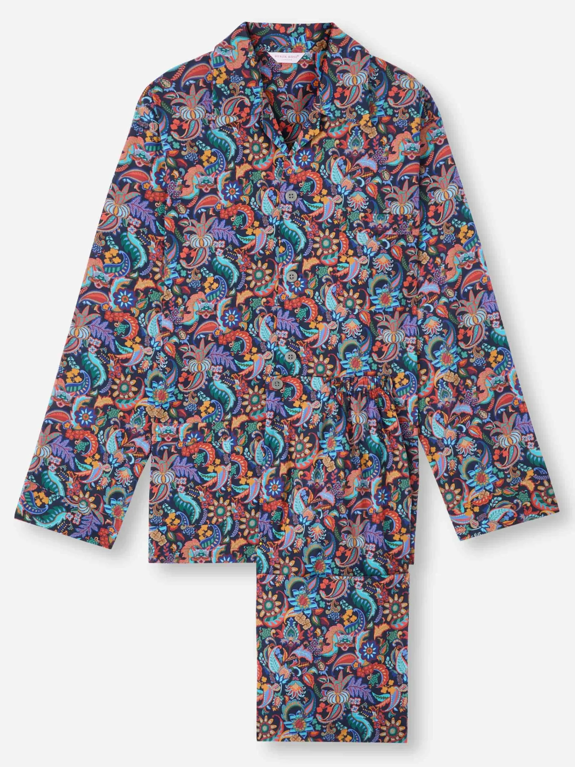 Our jungle paisley print combines classic ornamental paisleys with stylised jungle flowers, plant and hidden Derek Rose references. Find the Derek Rose cat, a Rose Star and even our signature stripes. Made with a single breast pocket, classic flat collar, button-through top, and adjustable two-button elasticated waist, they’ll guarantee you drift off peacefully.