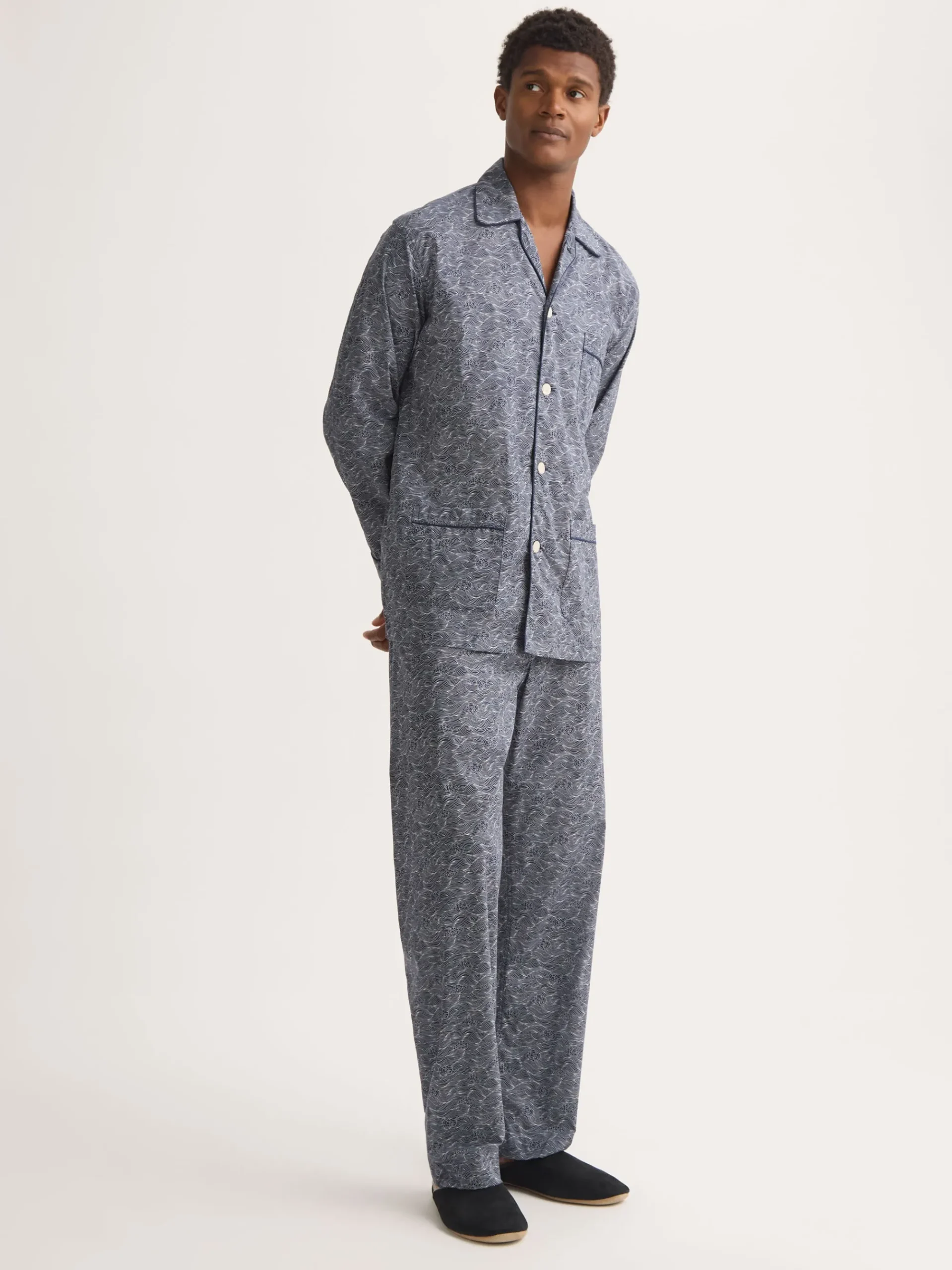 First developed by Mr Derek Rose and refined over decades, the classic fit pyjama is designed with sleep in mind. The pyjama top features a traditional collar and three-pocket design, while the trousers include an adjustable two-button fly and elasticated sides. This thoughtful construction allows the front and back to sit flat, ensuring ease of movement and uninterrupted comfort in bed.
