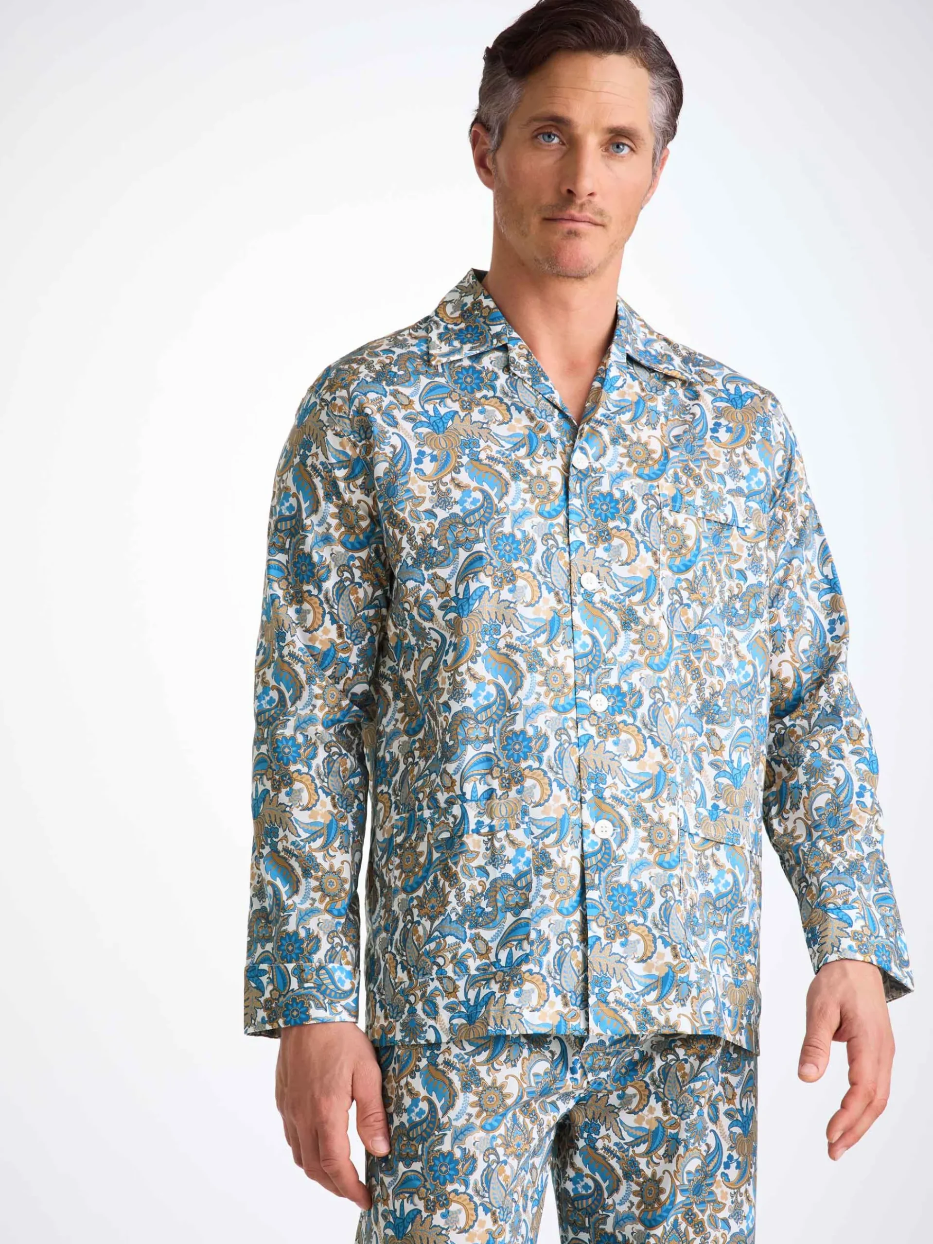 Our jungle paisley print combines classic ornamental paisleys with stylised jungle flowers, plant and hidden Derek Rose references. Find the Derek Rose cat, a Rose Star and even our signature stripes. Made with a single breast pocket, classic flat collar, button-through top, and adjustable two-button elasticated waist, they’ll guarantee you drift off peacefully.