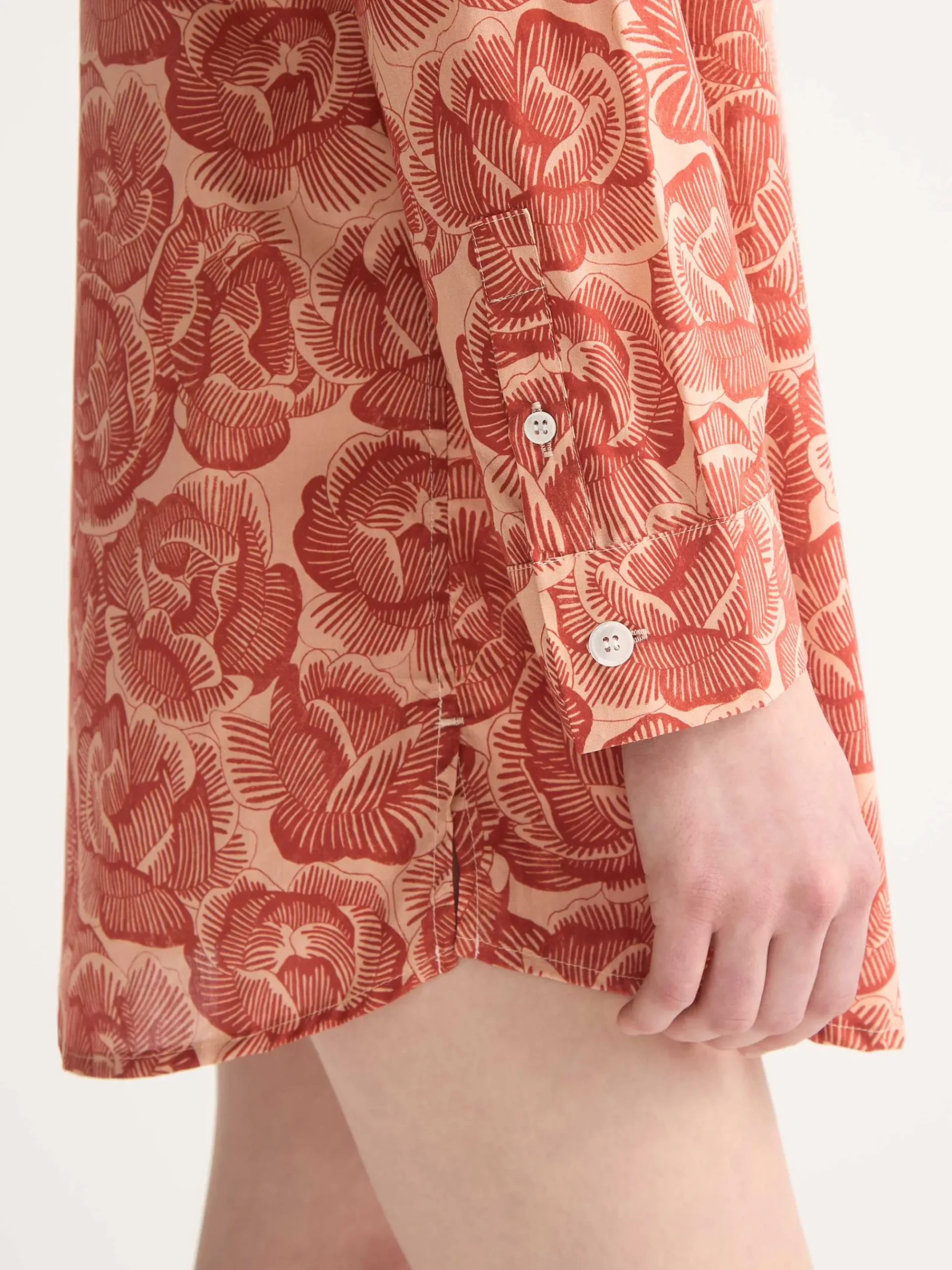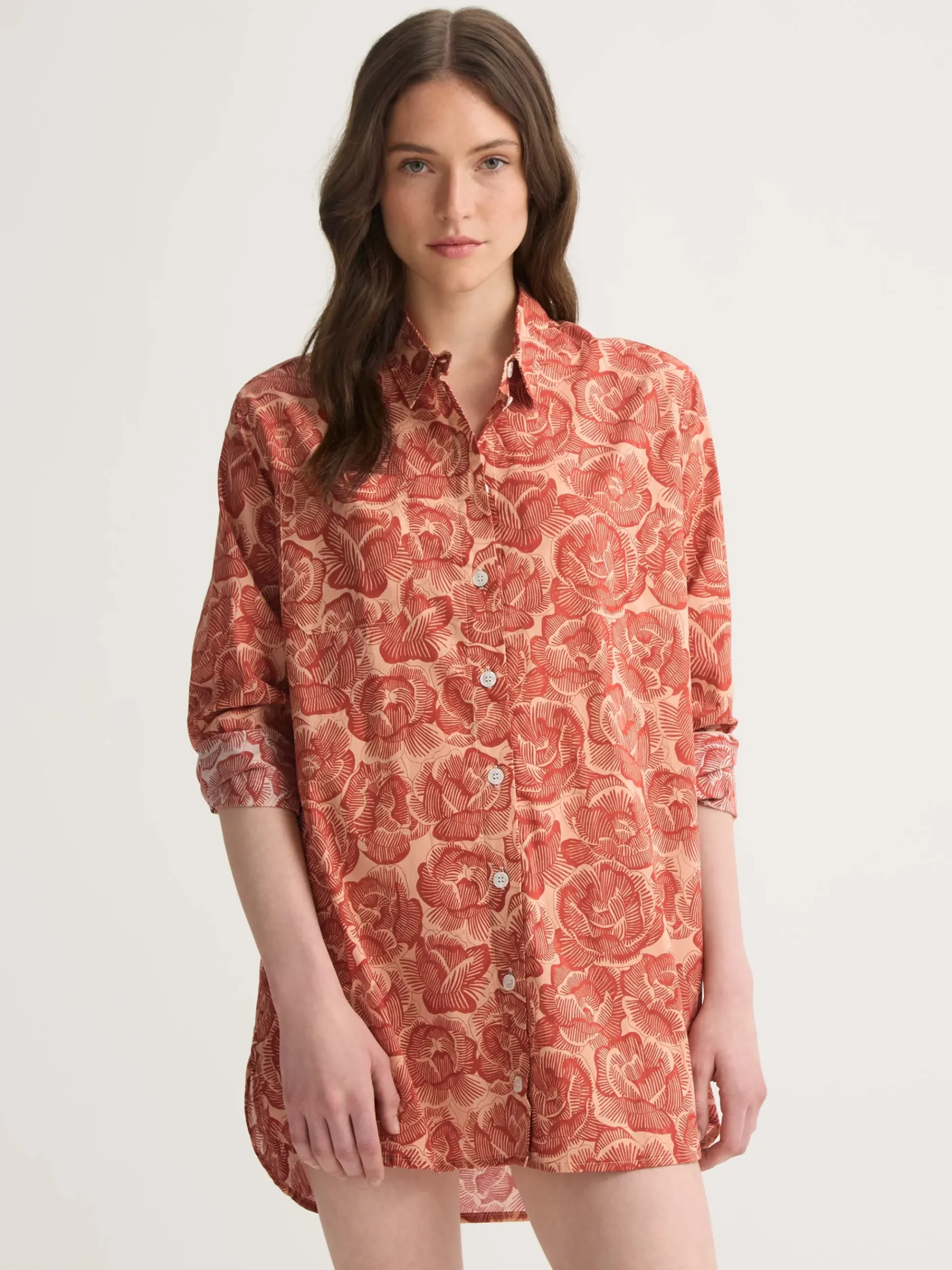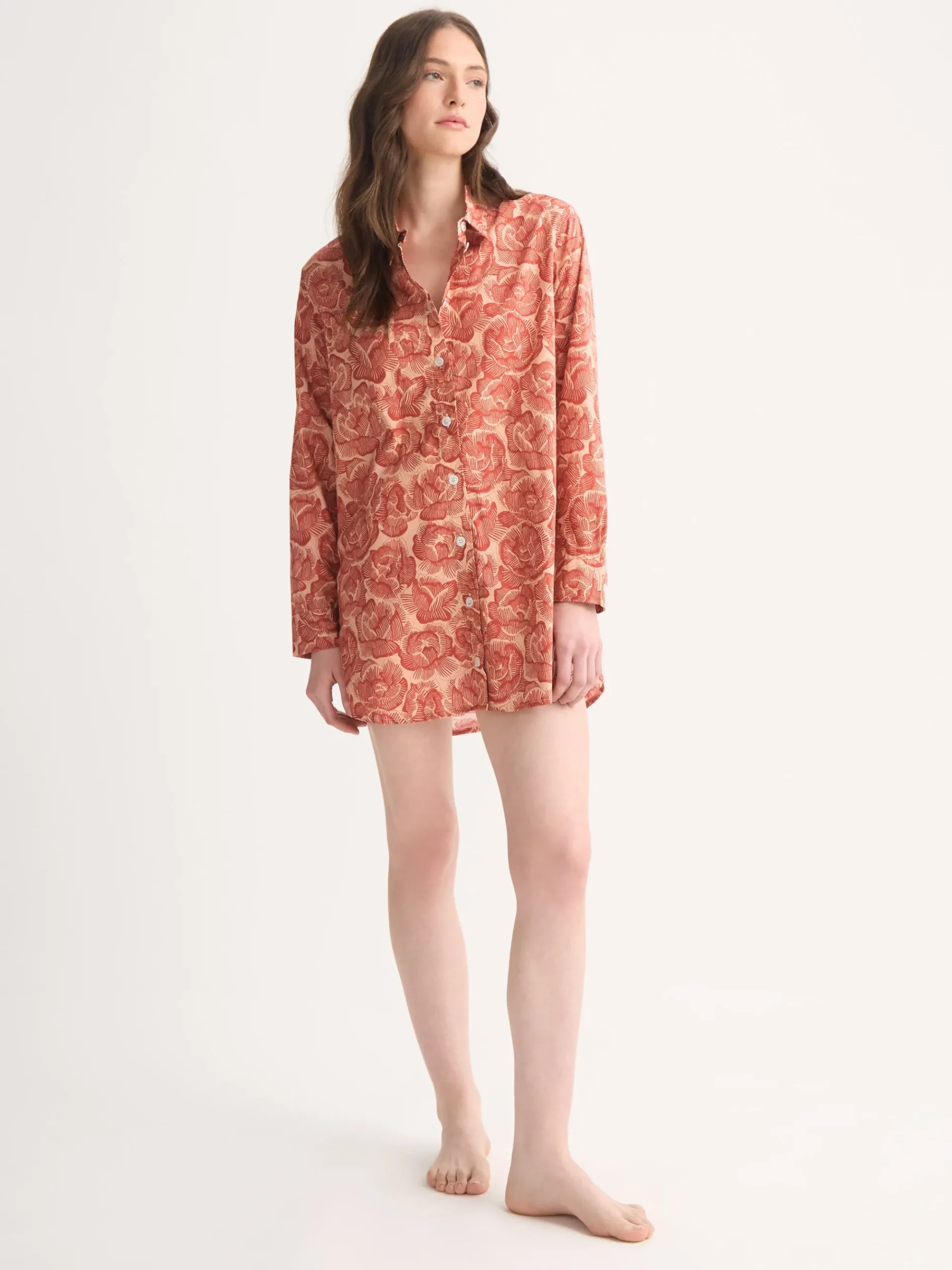 Inspired by the rose—an enduring Derek Rose symbol—this women’s nightshirt features a hand-drawn floral motif digitally reimagined in rustic red and peach tones. The two-tone design preserves the texture of the original artwork while playing with negative space, giving it a refined yet modern look.