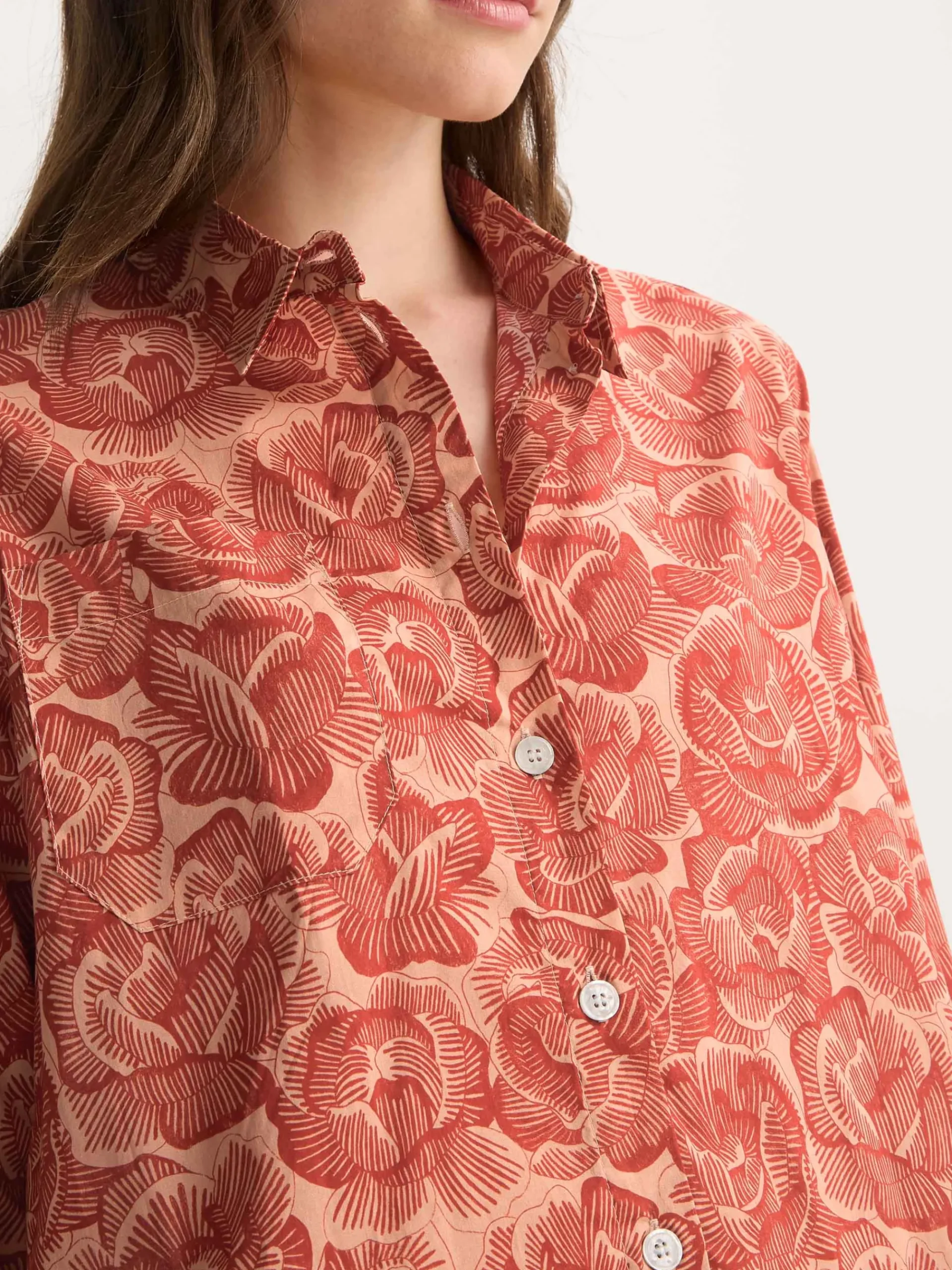 Cut in a relaxed fit, the design includes a button-through front and cuffs, a single chest pocket, and a back box pleat with a hanging loop for ease of movement and everyday practicality. Imitation mother-of-pearl buttons complete the look with a touch of elegance.