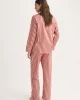 The button-through pyjama top features a revere collar, single chest pocket, and full white piping for a refined finish. The matching trousers have an elasticated waistband with self-fabric drawstring, side pockets, and a relaxed fit that drapes beautifully for easy movement and all-night comfort.