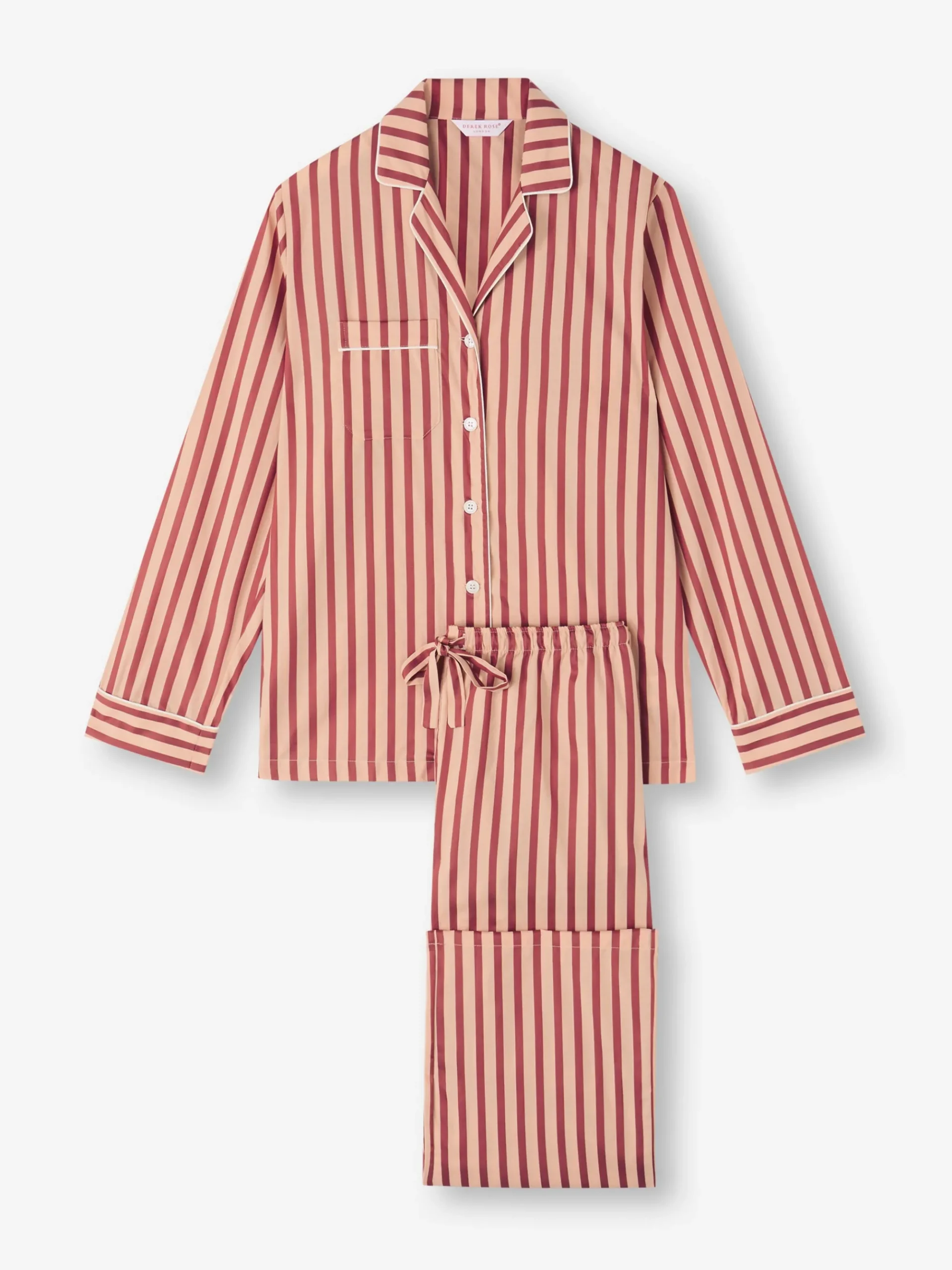 Designed for sleep, lounging, and laid-back mornings, our Capri pyjamas feature a part-satin woven stripe in peach and red — a vibrant yet elegant combination that brings a fresh feel to classic nightwear.
