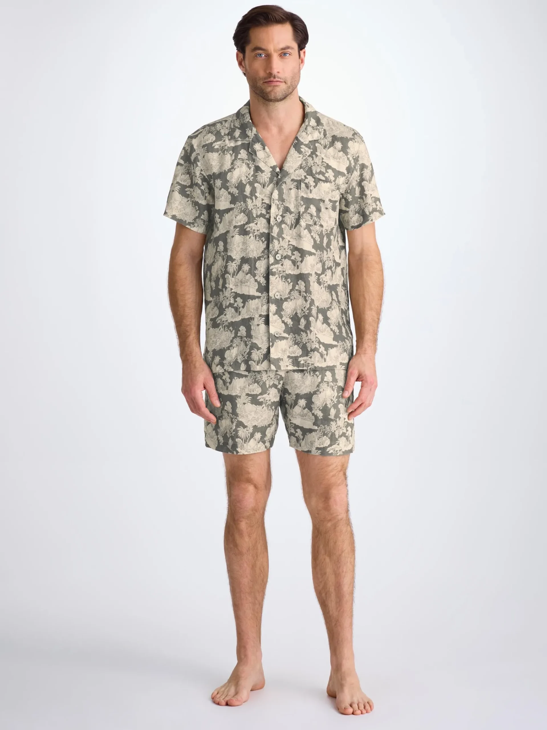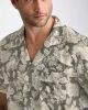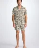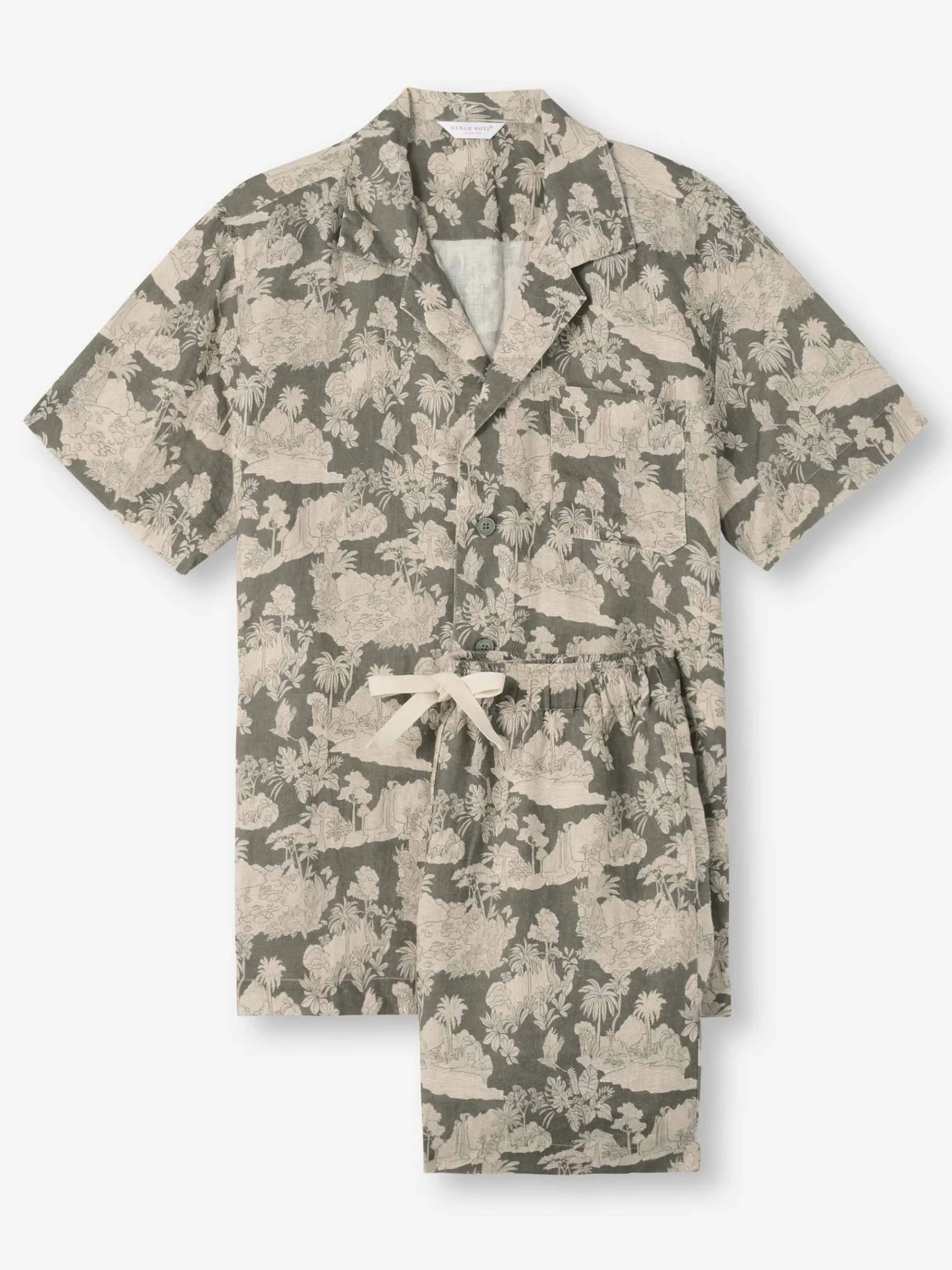 Designed with a comfortable relaxed fit and short sleeves, discover our island hopping print in khaki. A hand drawn modern interpretation of a toile de Jouy, find tropical trees and plant life.