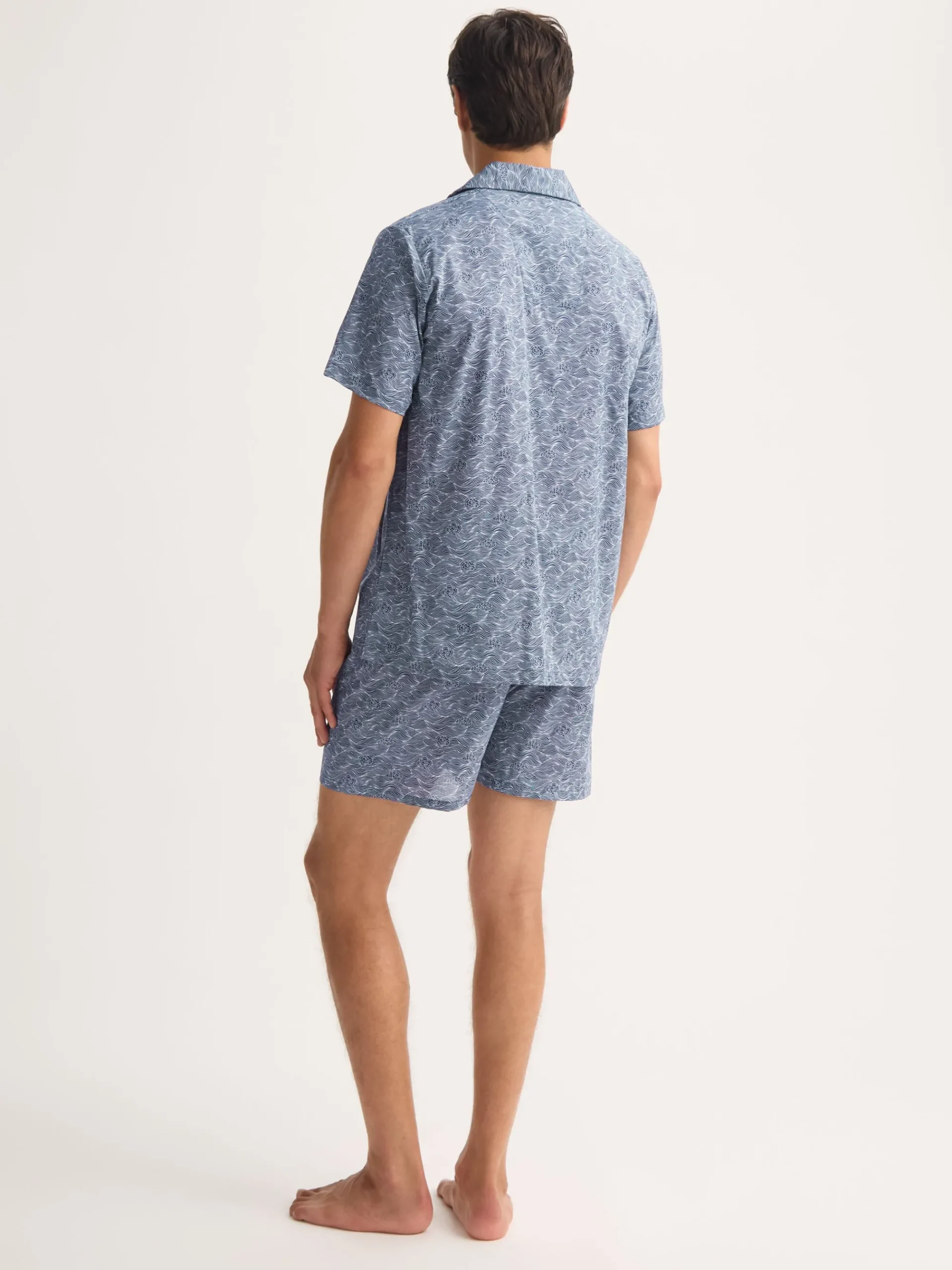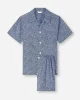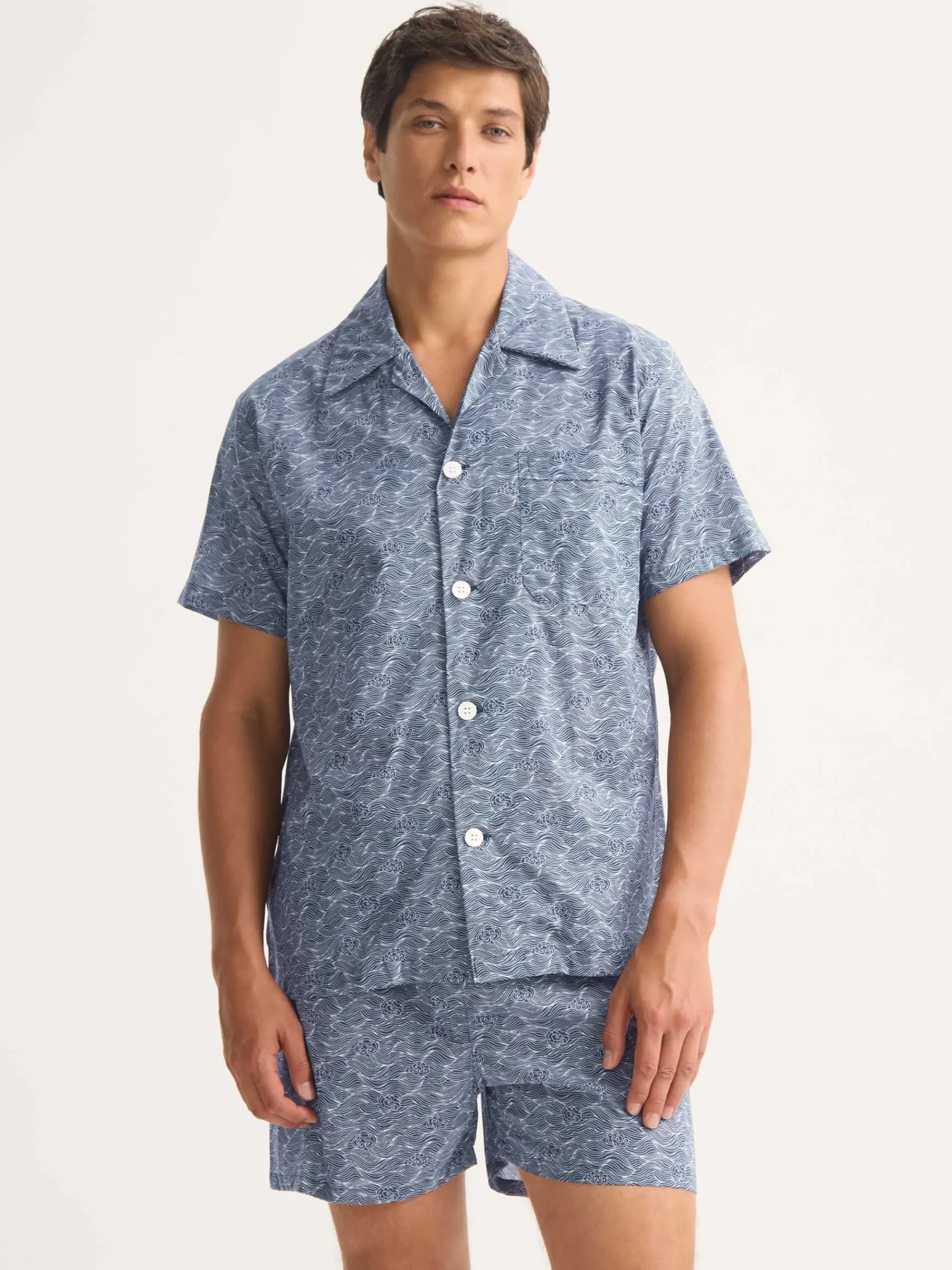 The short-sleeved pyjama top features a classic collar and a single breast pocket, while the matching shorts are finished with an adjustable two-button waistband and elasticated sides for ease of movement and overnight comfort.
