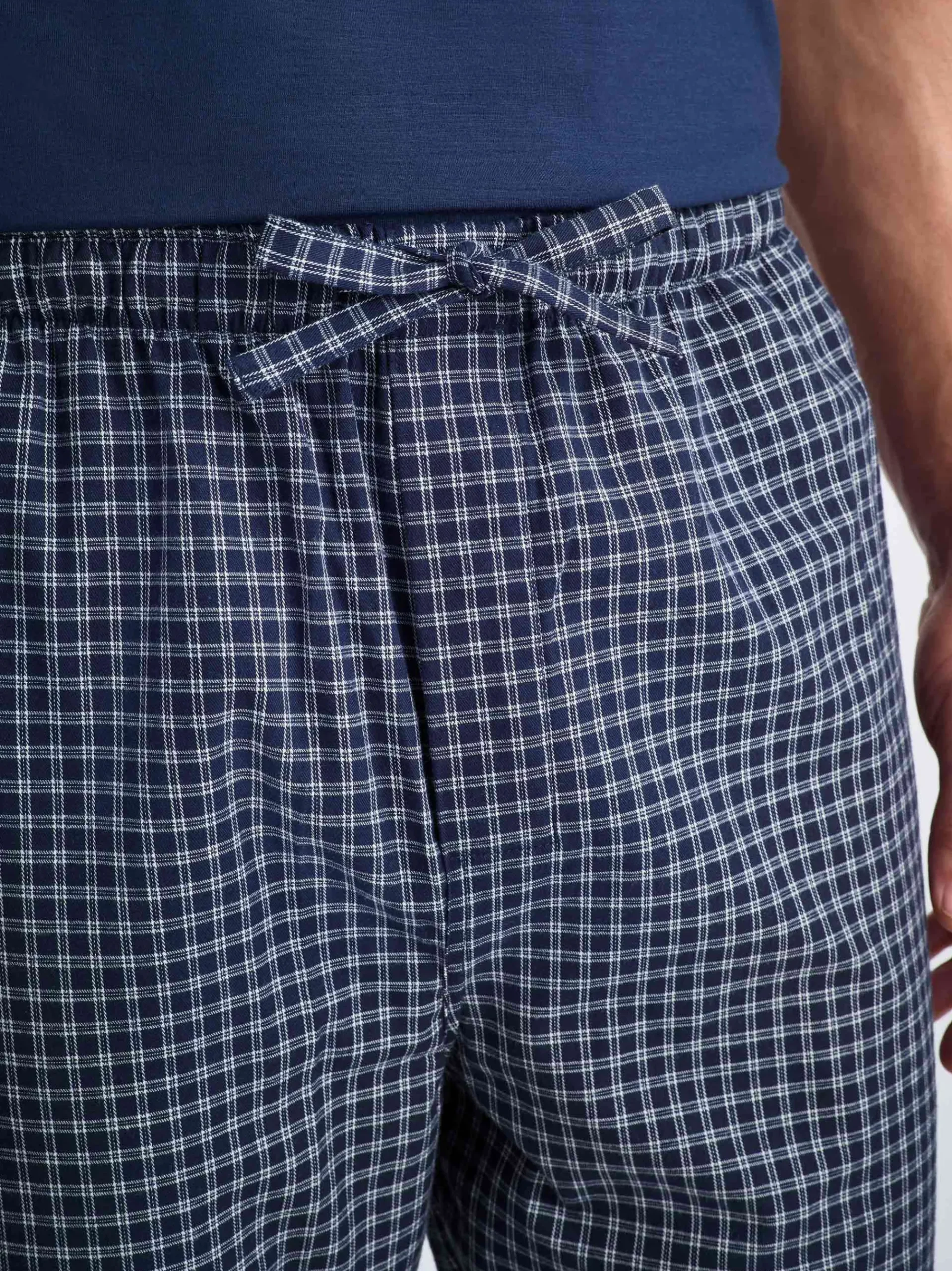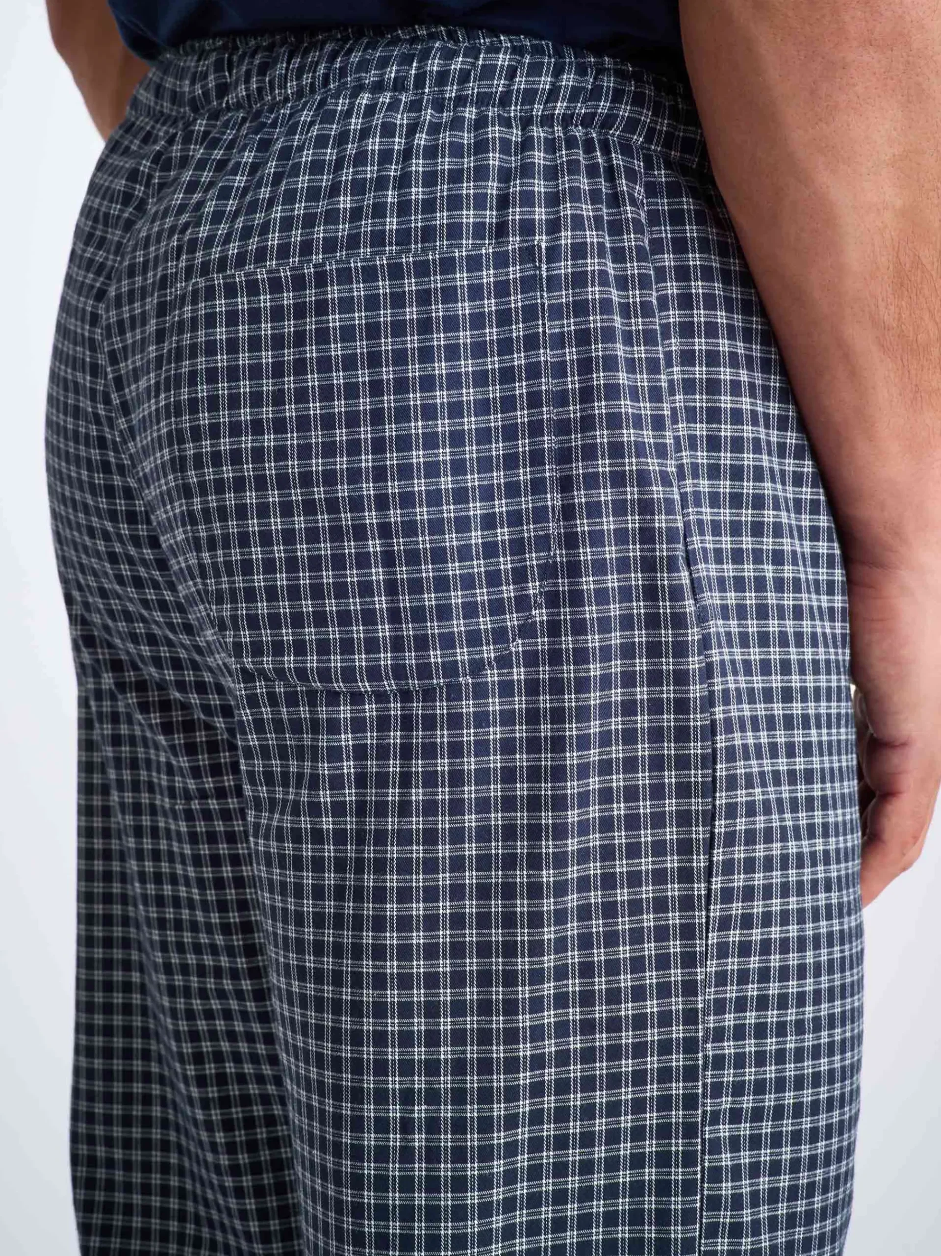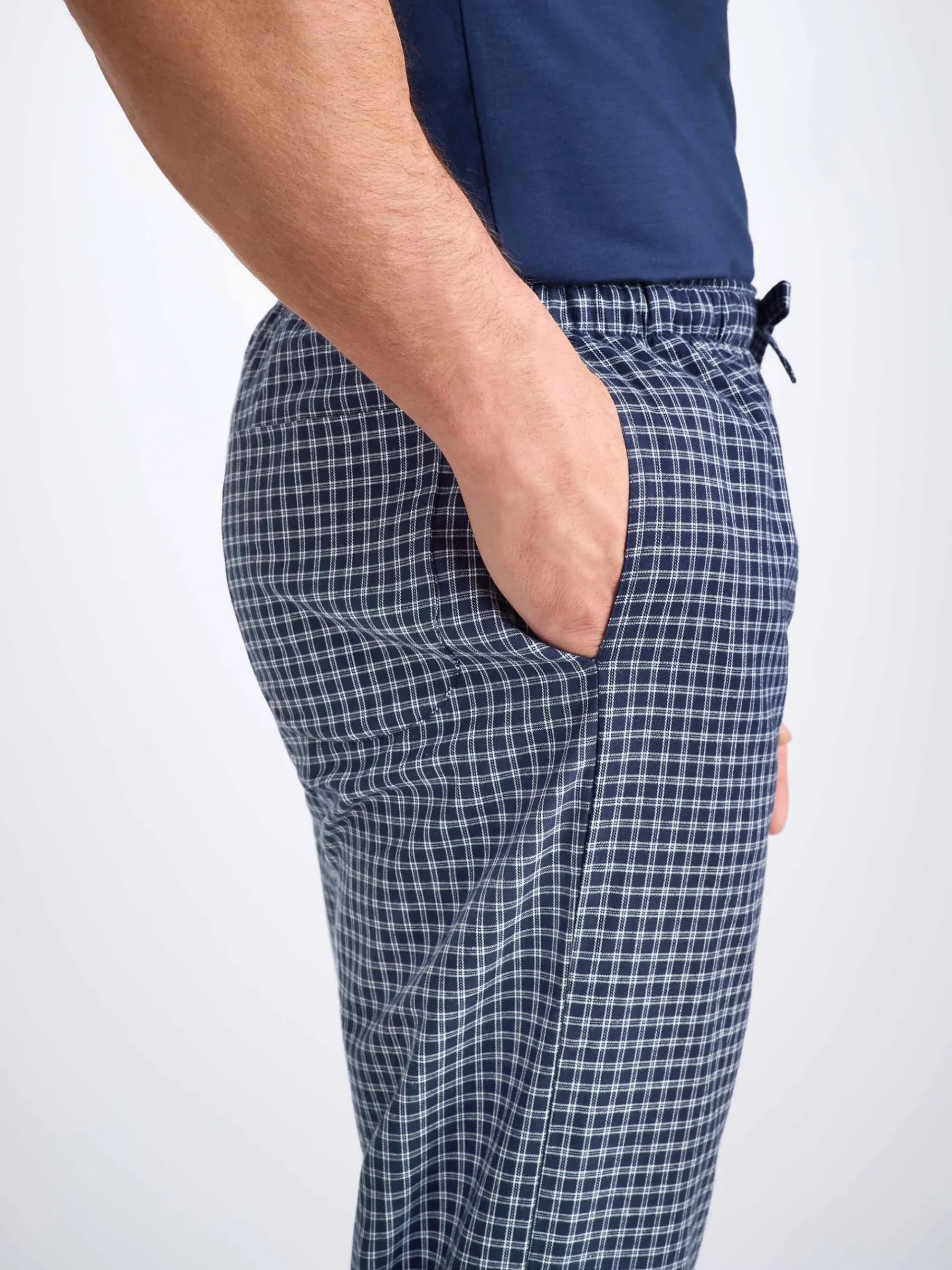 Our lounge trousers feature a combined elastic and self-fabric tied waist for a comfortable fit and two inset side pockets and a rear patch pocket to help keep your phone and other items close while you’re lounging.