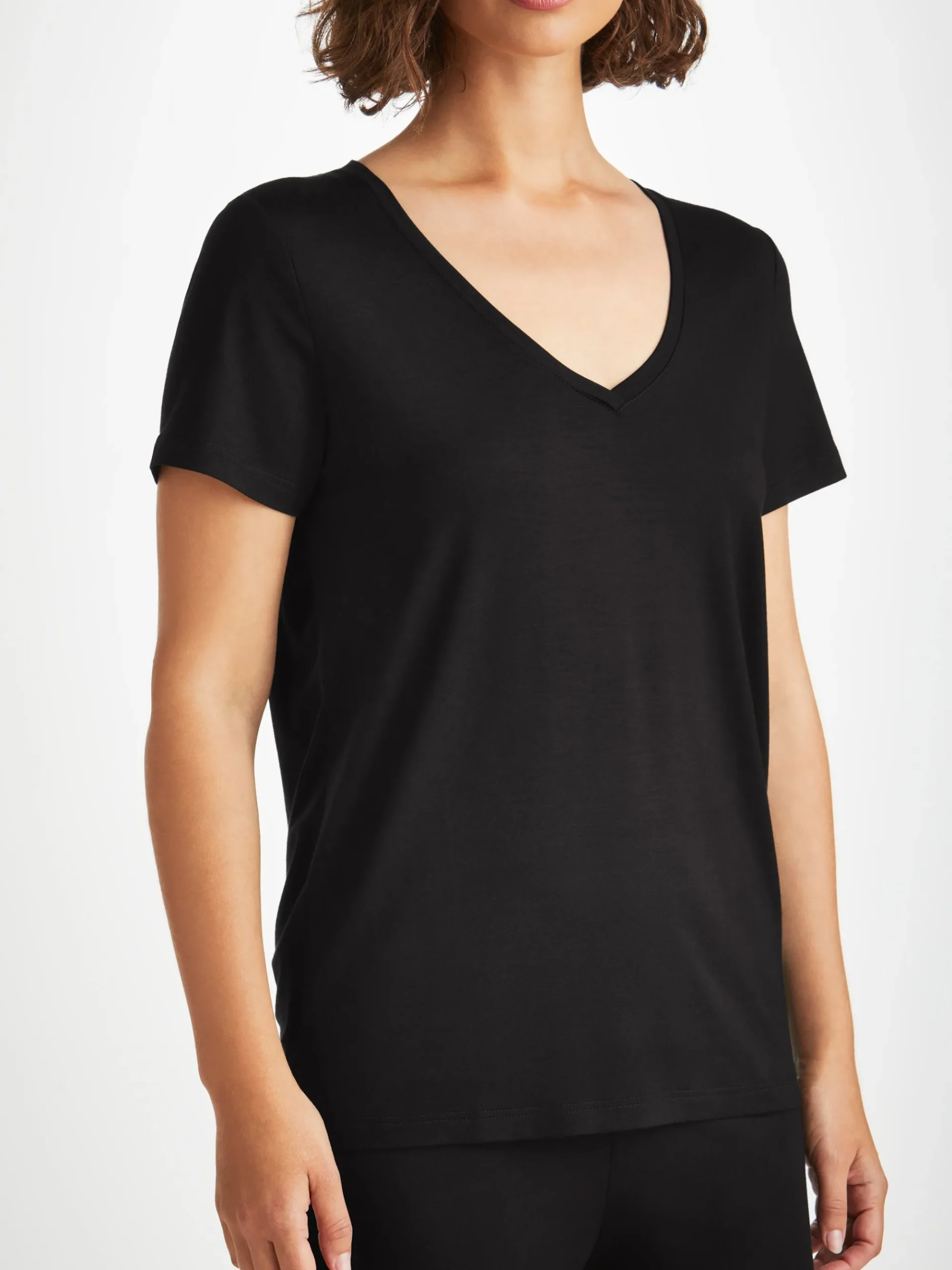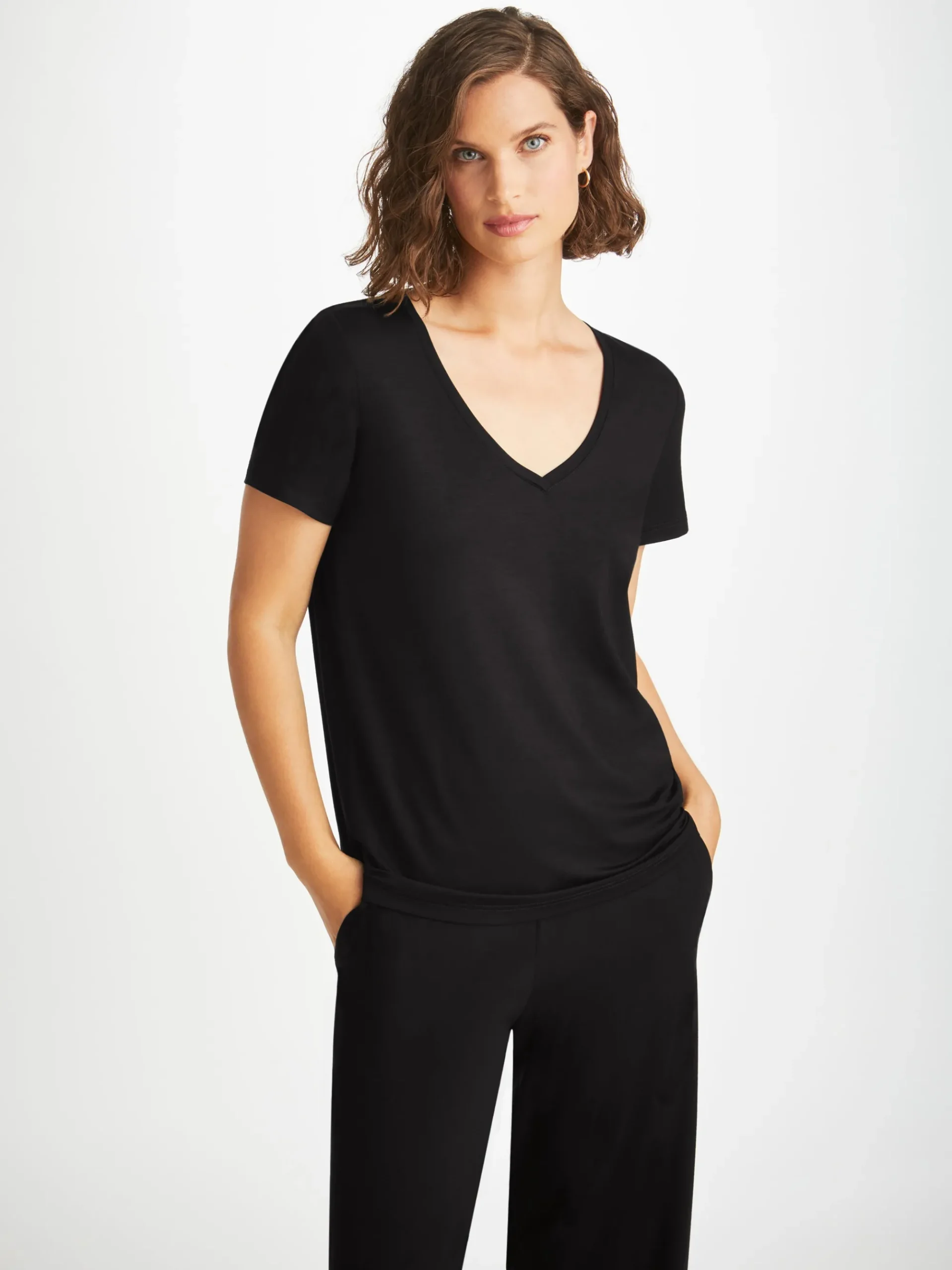 Our Lara t-shirt is a true wardrobe essential and perfect for layering. Seen here in black, it offers a relaxed fit, a soft v-neck and twin needle sleeves and has been designed to sit perfectly underneath all our sweaters and hoodies.