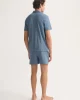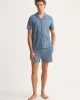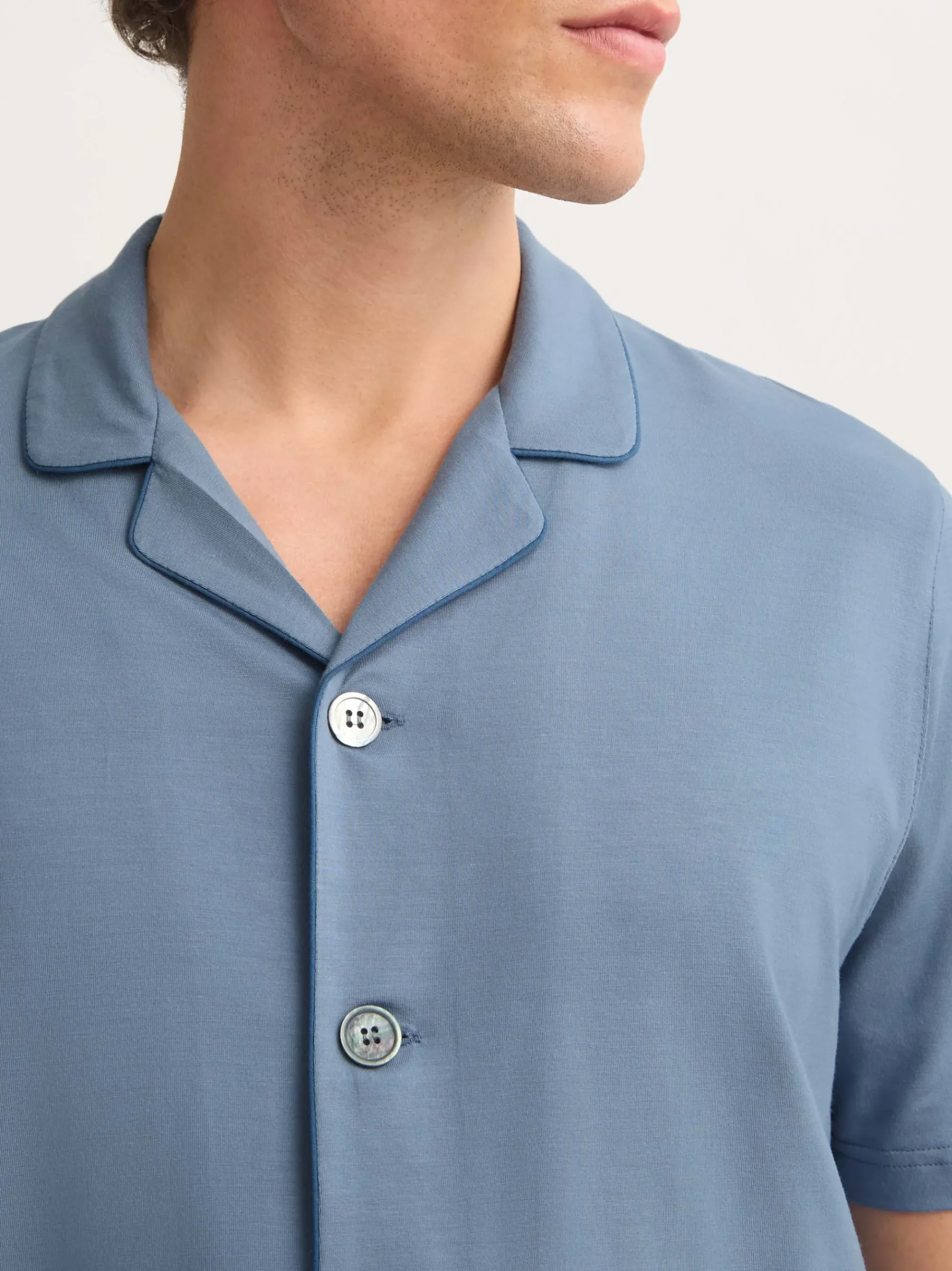 The pyjama top features blue piping, a flat open collar and imitation mother-of-pearl buttons for a refined finish. The matching shorts include a self-seeking magnetic fly for effortless ease, alongside a relaxed cut for comfort.
