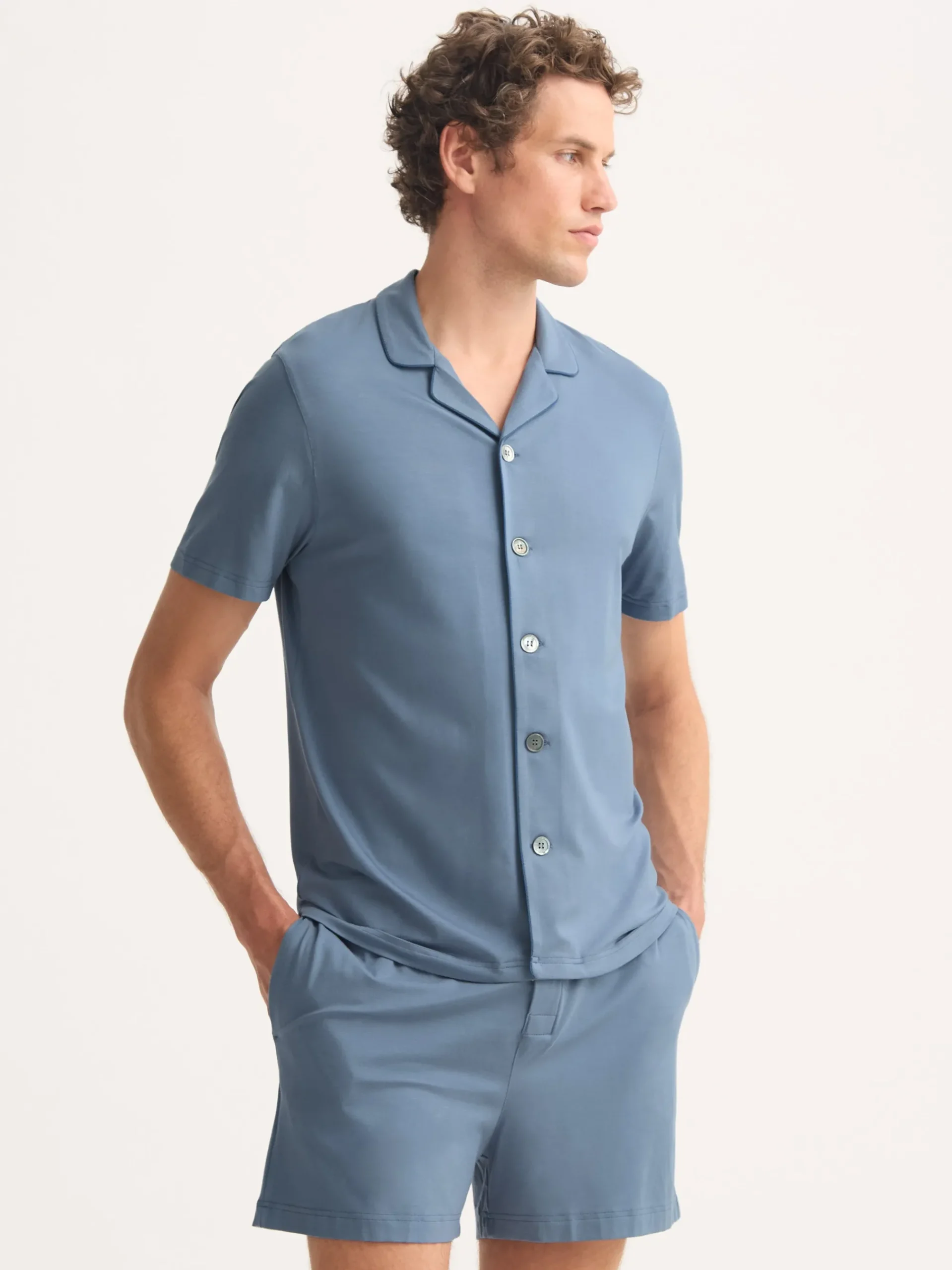 Our men’s Basel short pyjamas in a timeless storm blue are crafted from our signature micro modal stretch, offering unparalleled softness and a naturally breathable feel against the skin. With temperature-regulating fibres that adapt to your body, they keep you cool in the heat and warm when it’s cooler—making them perfect for year-round wear.