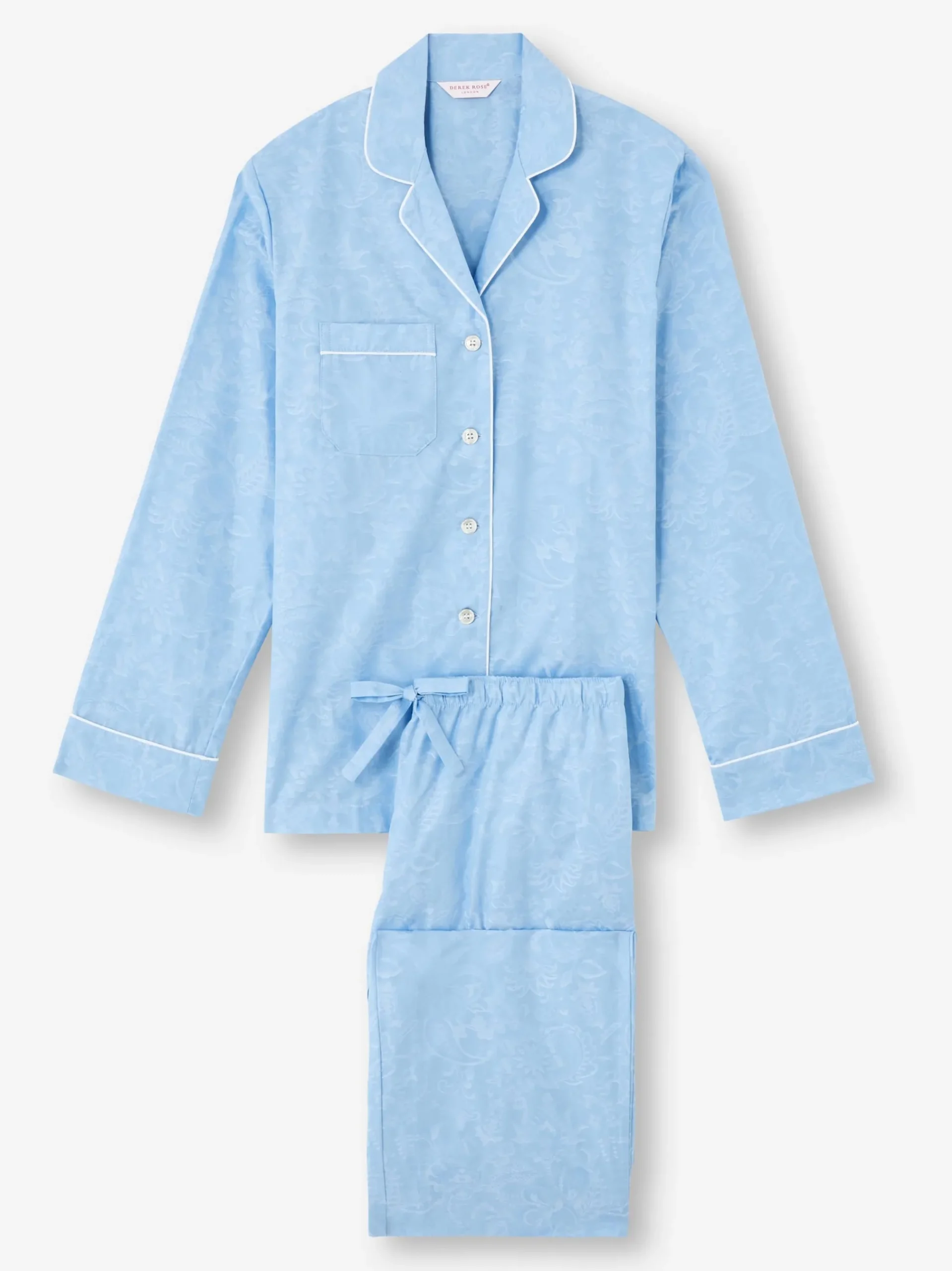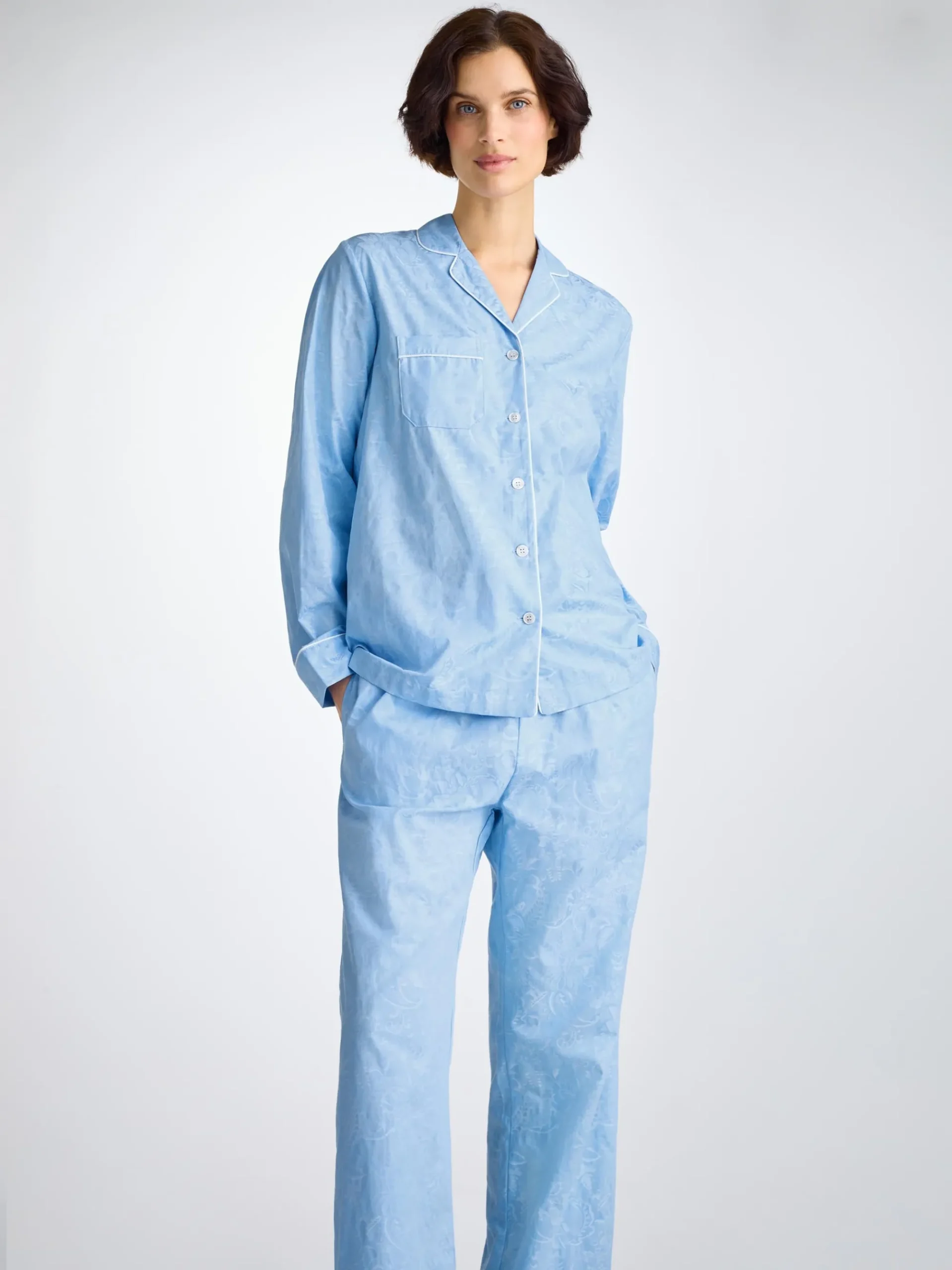 Made from our cotton jacquard – a luxuriously soft fabric, often mistaken for silk the jacket features a fully piped finish in white, a single patch pocket and buttons. The quality of craftsmanship continues with the trousers and their elasticated waist with drawstrings for added comfort, whilst slip-in side pockets add a practical place to keep hands warm.