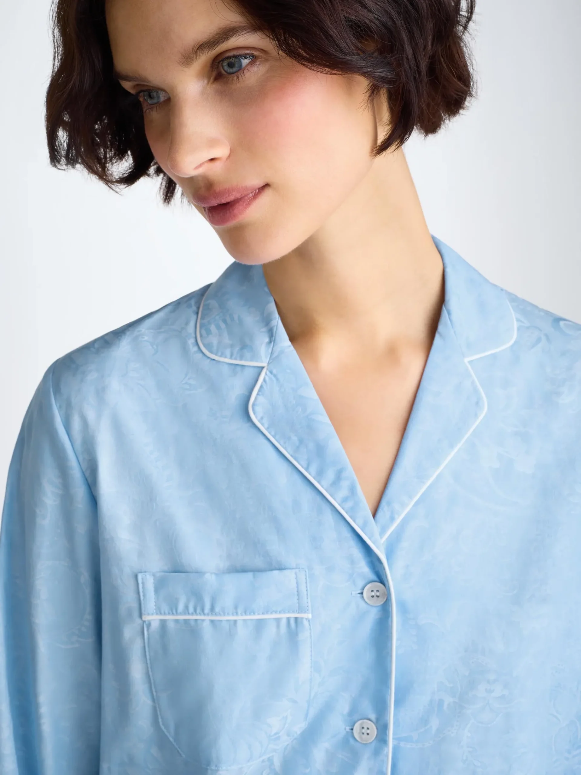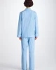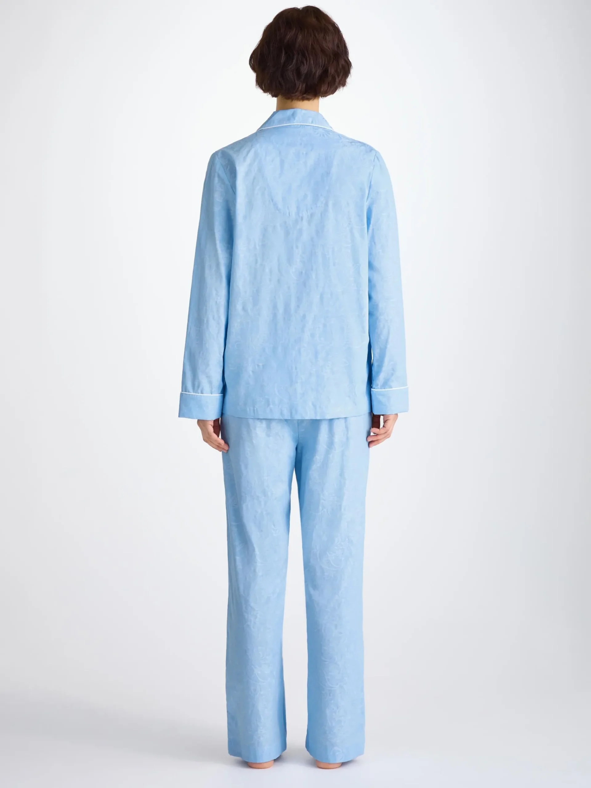 This pyjama features a light blue jungle paisley pattern, subtly woven into the cotton fabric for a lustrous and silky soft touch, making this PJ a dream to lounge or sleep in.