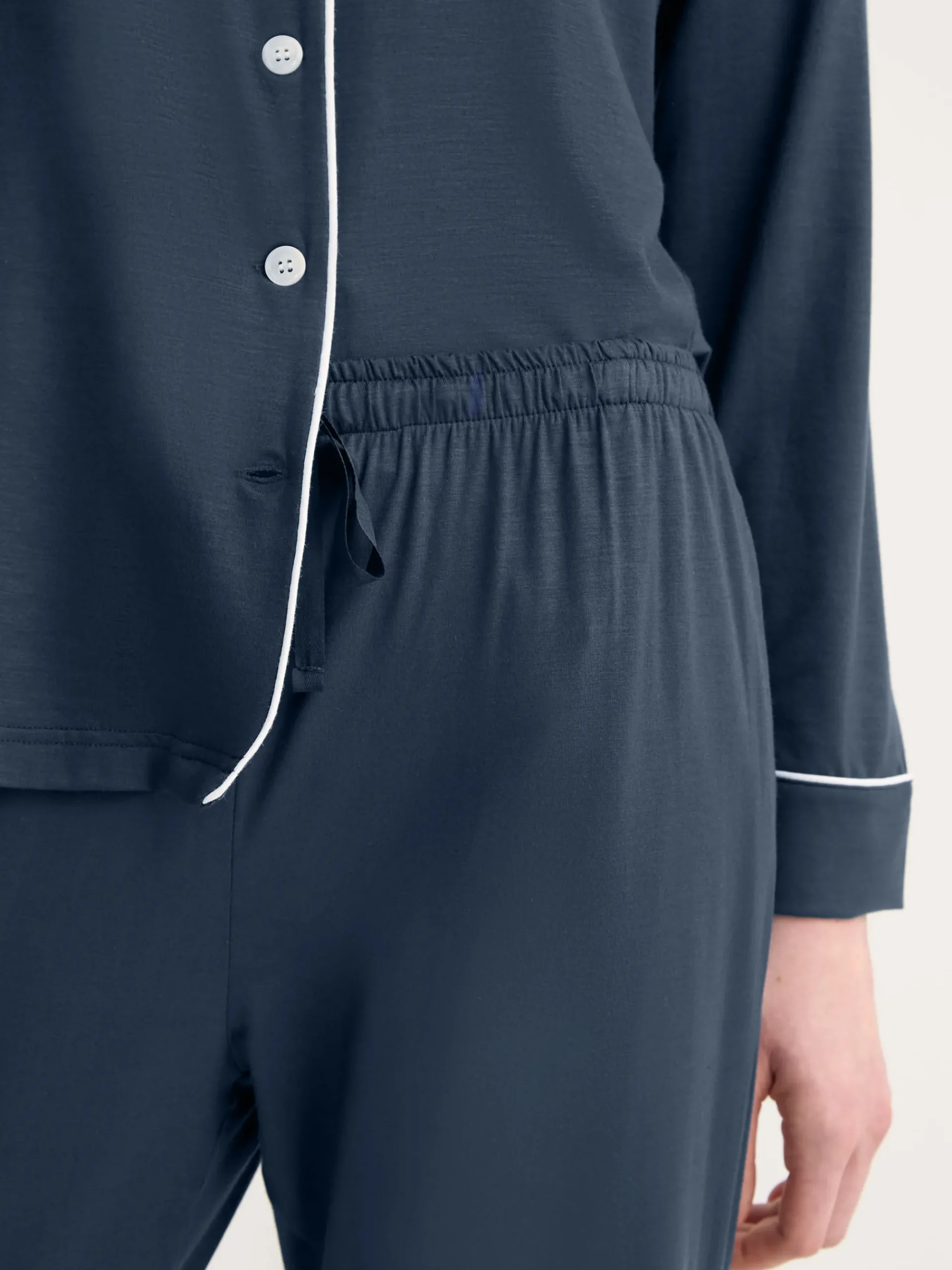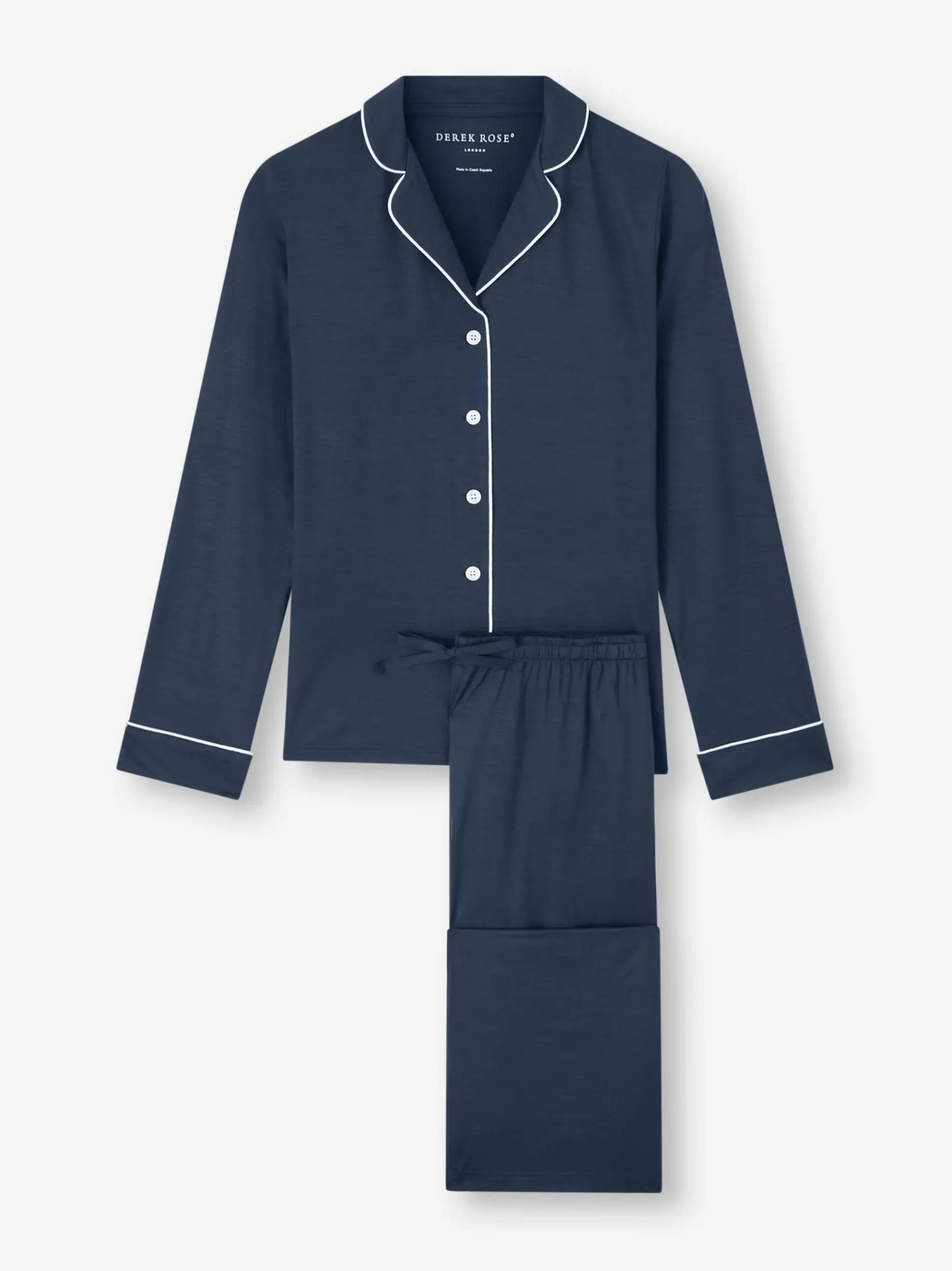 The pyjama top features a fully piped finish in contrasting white for a stylish appearance and the trousers have an elasticated drawstring waist for practicality.