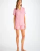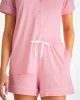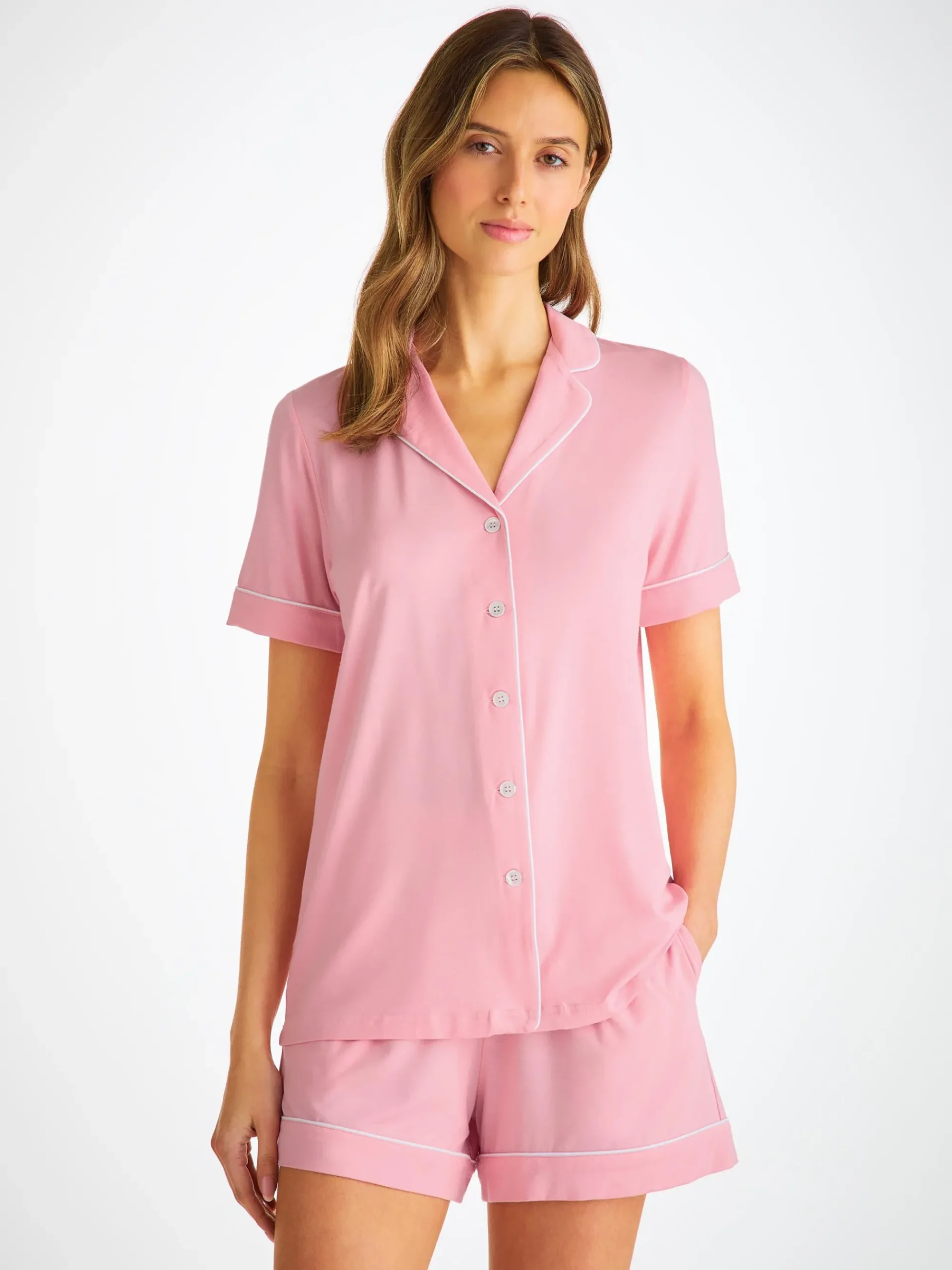 Designed for a flattering but comfortable shape, our women’s shortie pyjamas in ballet pink will keep you looking great and feeling comfortable throughout the seasons. The short-sleeve jacket top features a fully piped finish in contrasting white piping for a stylish appearance and the shorts have piped cuffs with an elasticated and drawstring waist for practicality. The Lara also has a higher waist for a more natural fit and improved comfort, and the most important addition? Pockets!