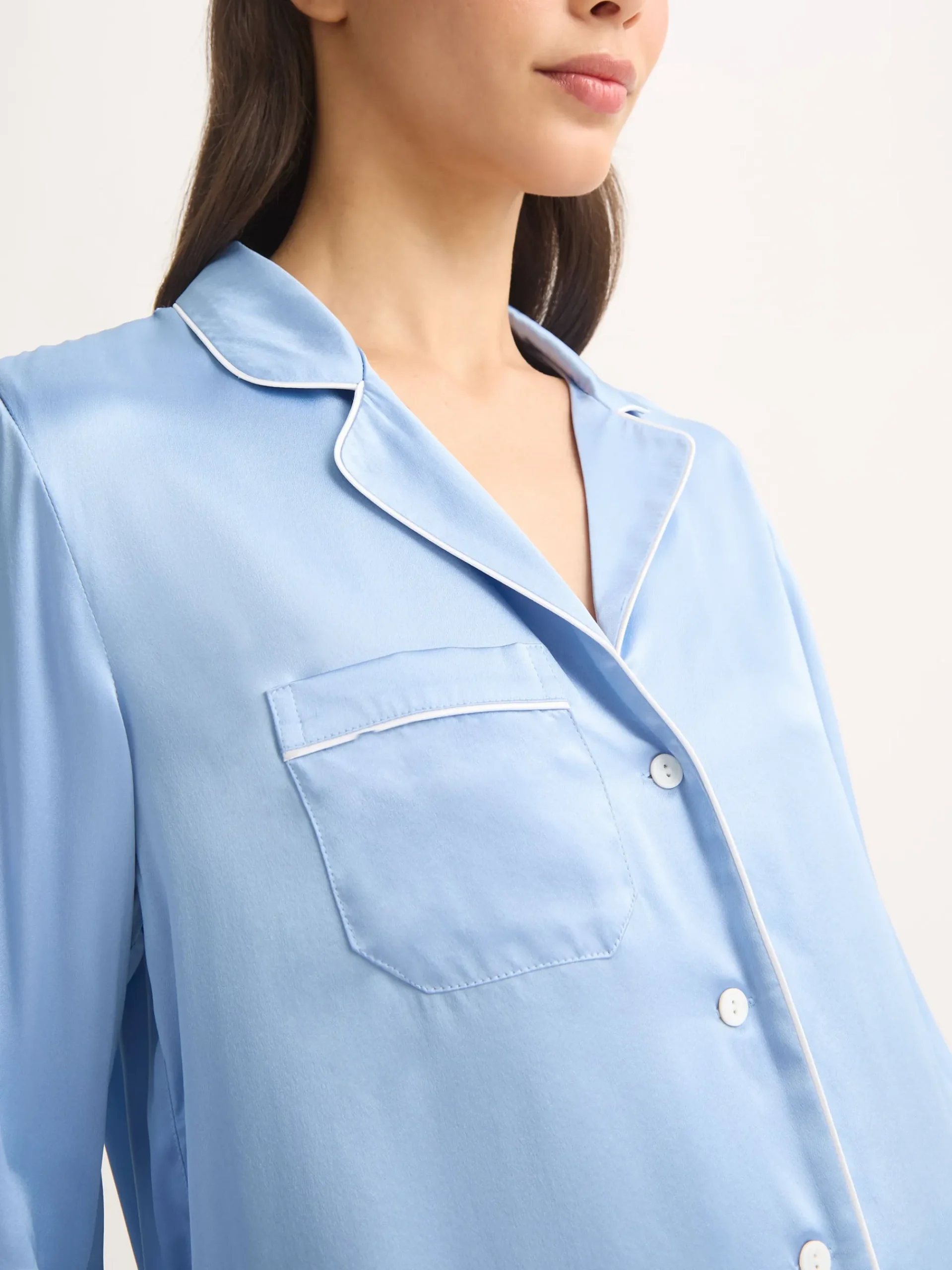Crafted from 100% silk in a serene cloud blue, the women’s Bailey pyjamas are delicately cut by hand in our Cheshire workshop. Produced in limited quantities, each set reflects hours of expert craftsmanship to preserve the fabric’s supremely soft and smooth satin finish.