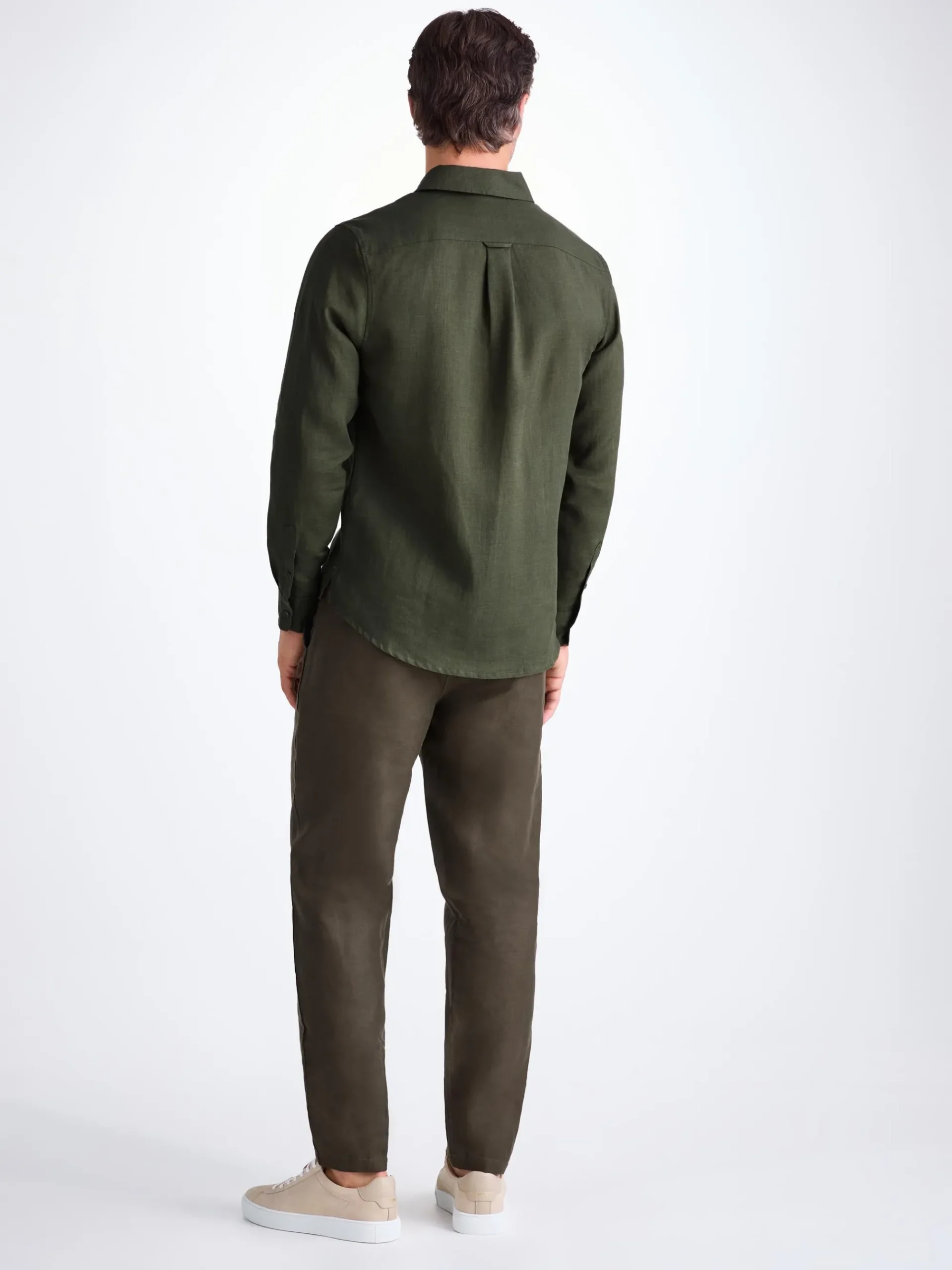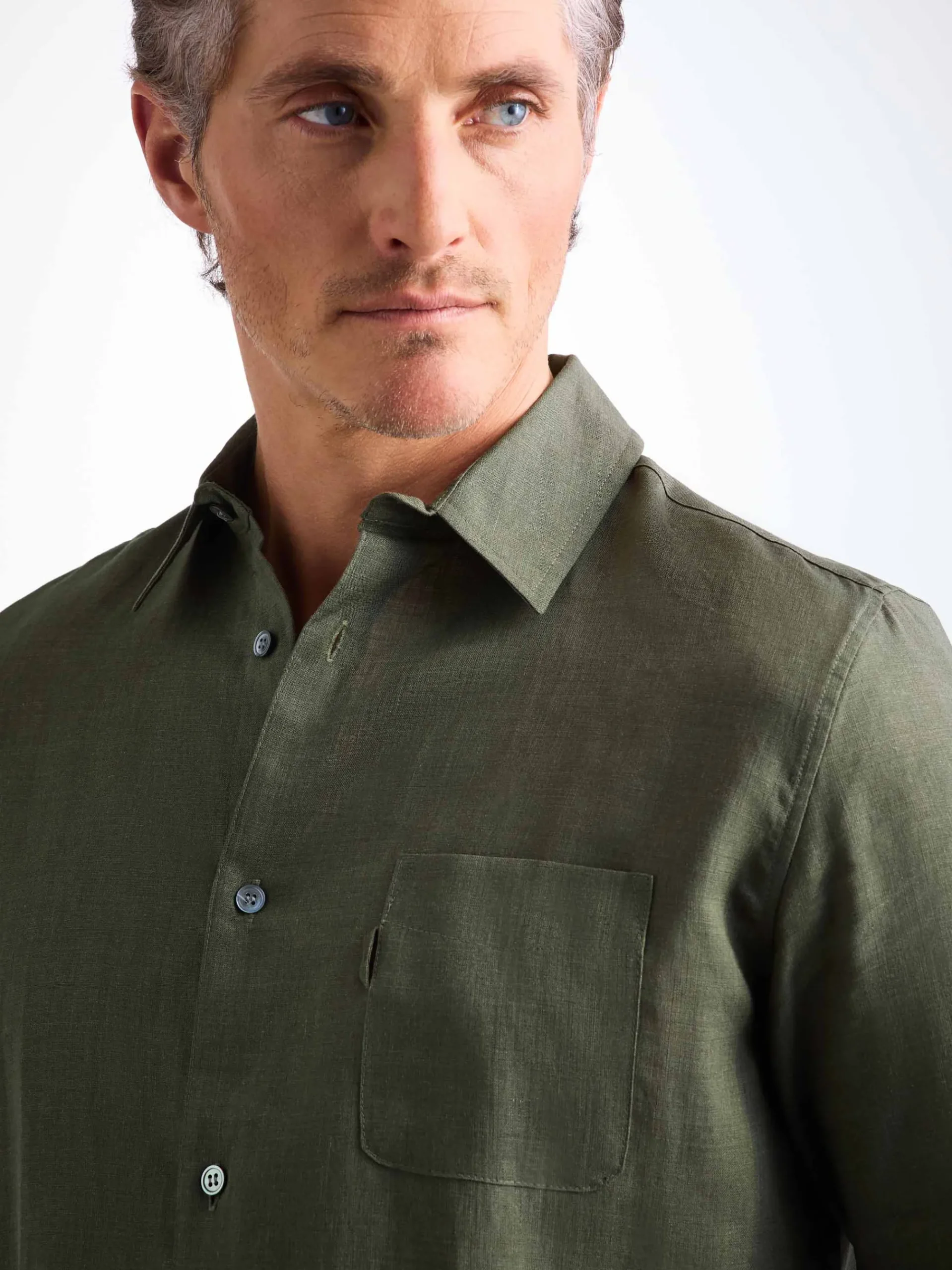 The Monaco shirt in khaki green features a curved back yoke with a box-pleat for comfort and a curved hem with side vents for ease of movement. We’ve used the classic styling of a button-through front and cuffs, a 2-piece collar and for a modern addition, we’ve added a U-shaped breast pocket with a handy sunglass loop for effortless summer chic.