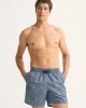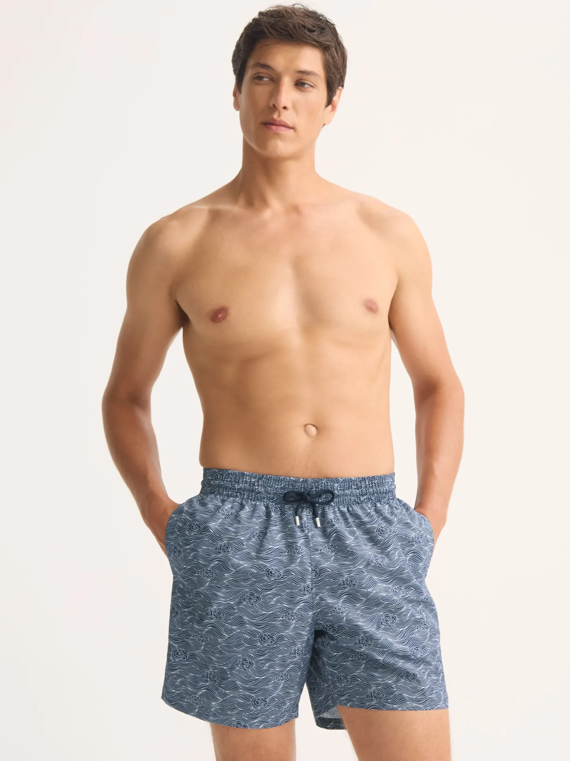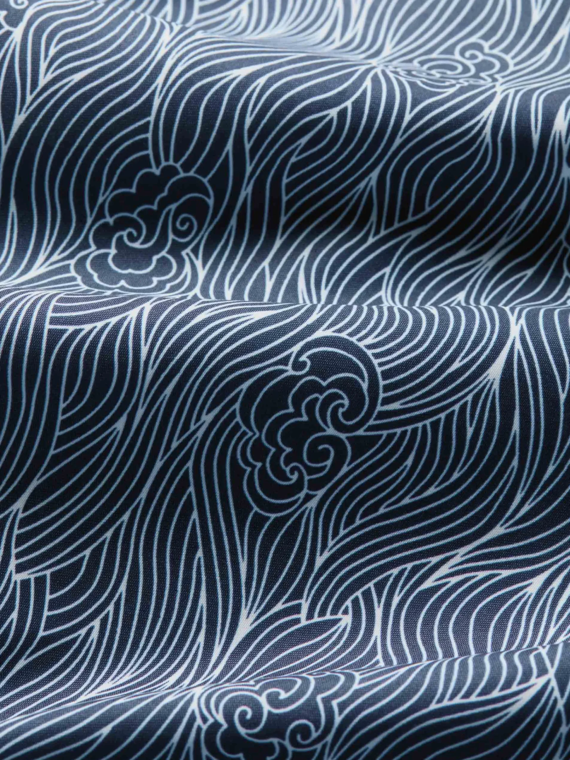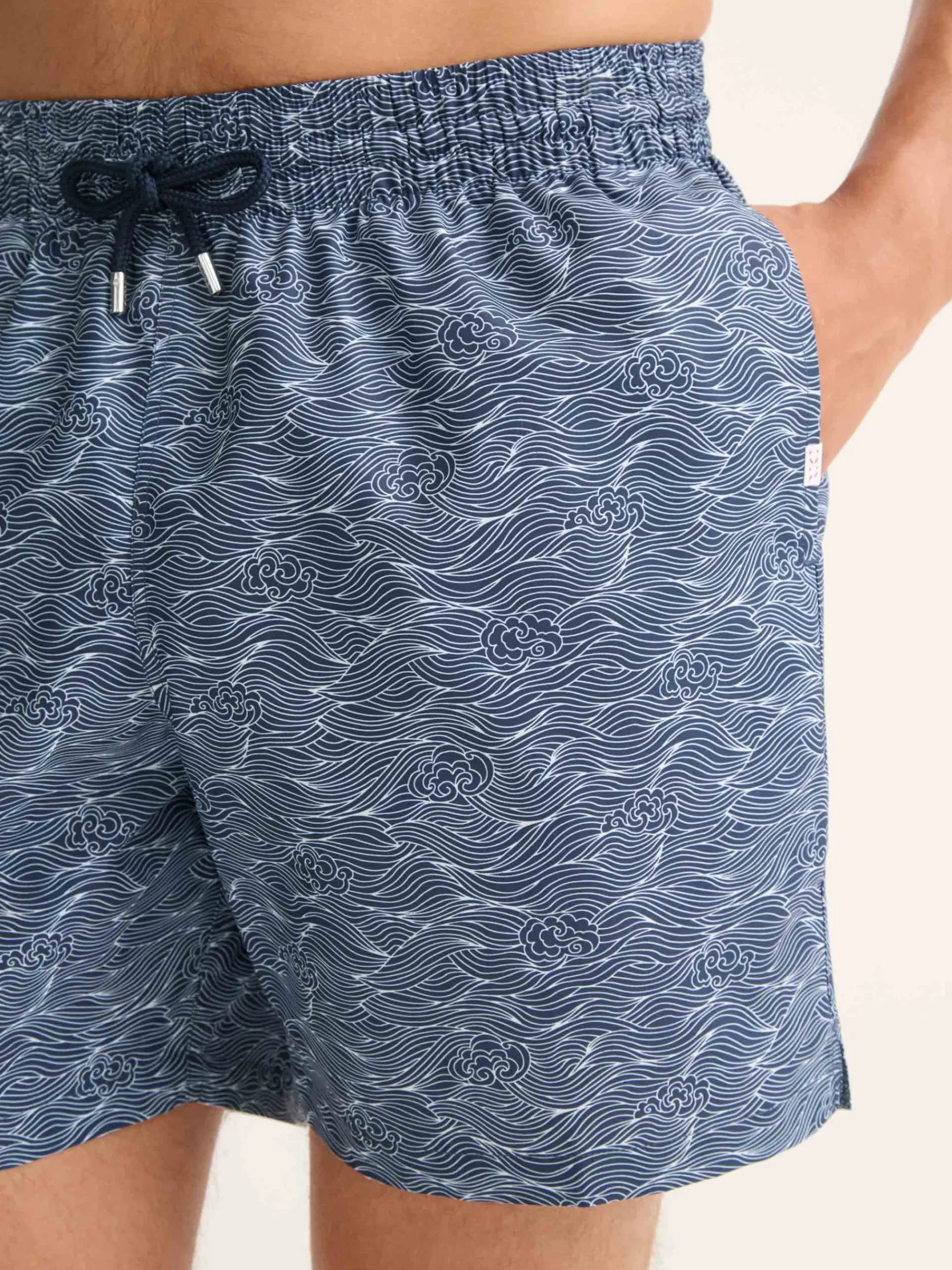 The men’s Maui swim shorts feature a flowing linear print inspired by the night sky, with stylised clouds drifting across a deep navy background. Refined and versatile, they bring a touch of artistry to a swimwear essential.