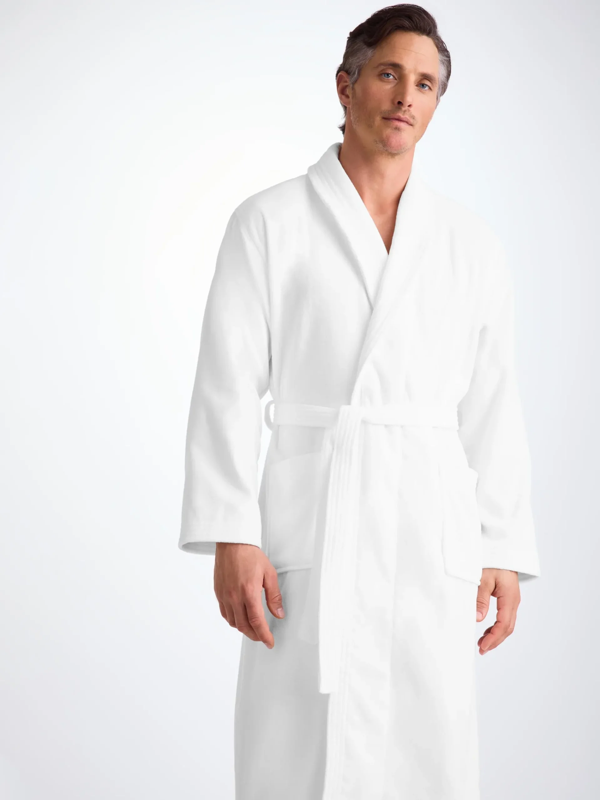 Our Triton bathrobe is a customer favourite, it features a classic shawl collar and two side pockets for practicality while around the house. It’s fastened with a fabric tie belt for the perfect fit.