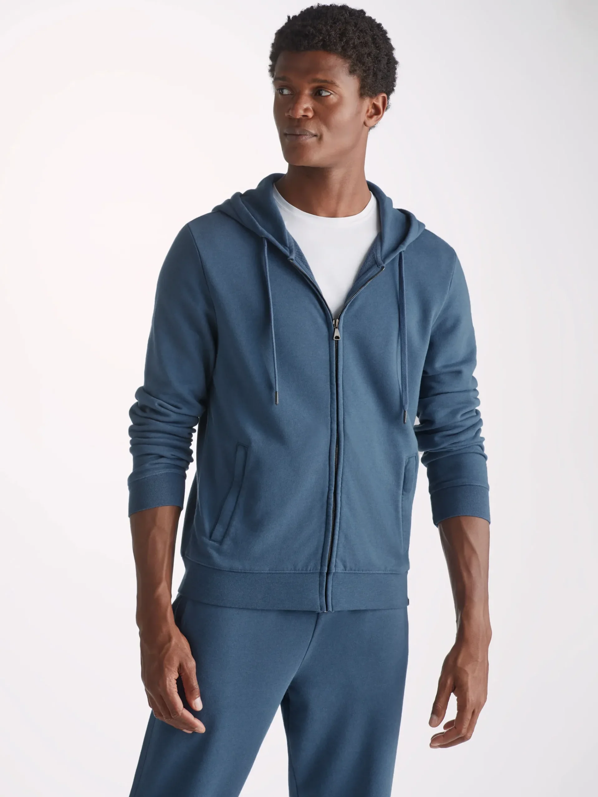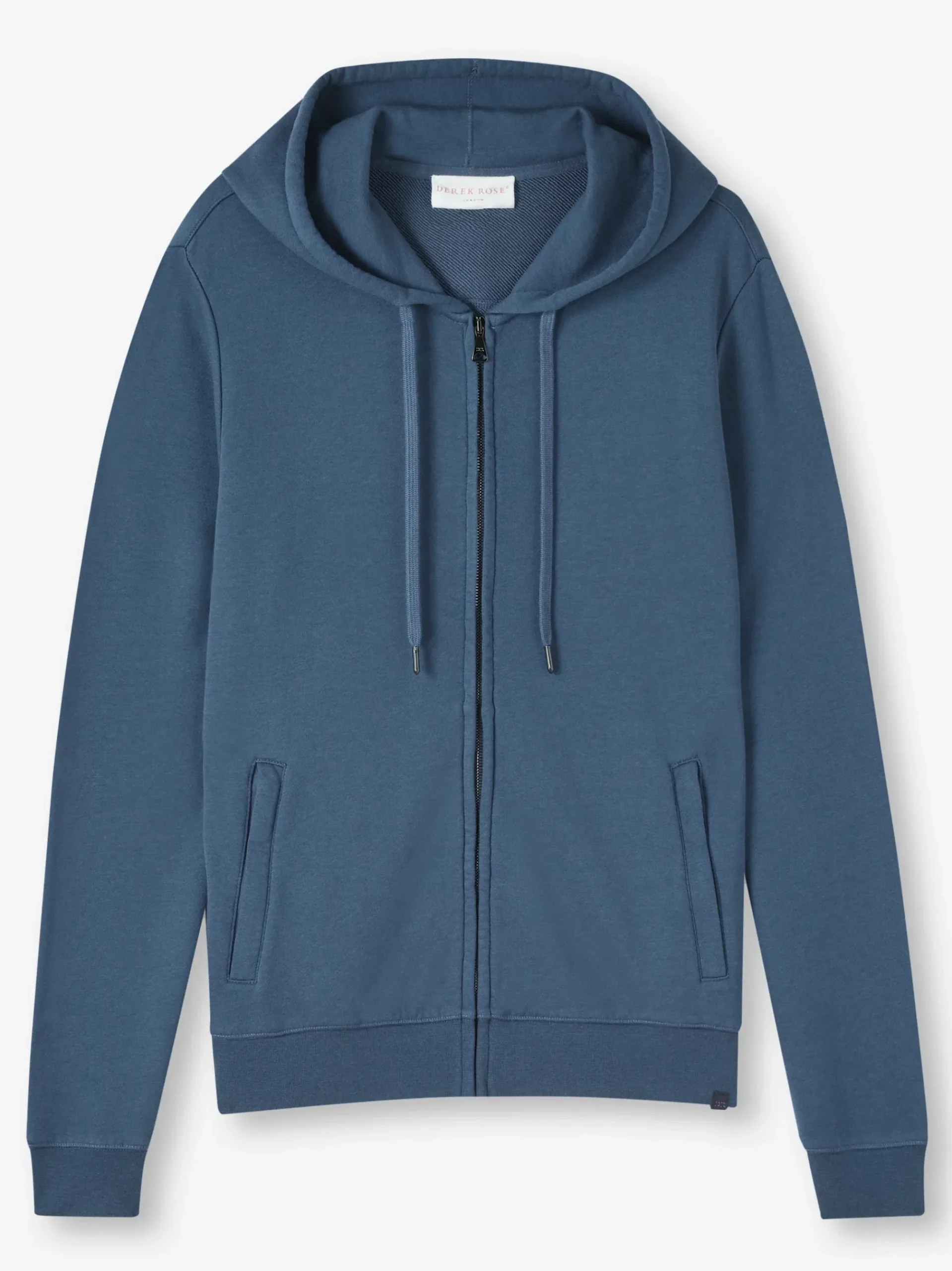 Our Quinn hoodie in denim blue is stylish, yet practical. Featuring zipped front pockets with welts and with ribbed cuffs and neck trim, this hoodie is designed to hold its shape wash after wash.