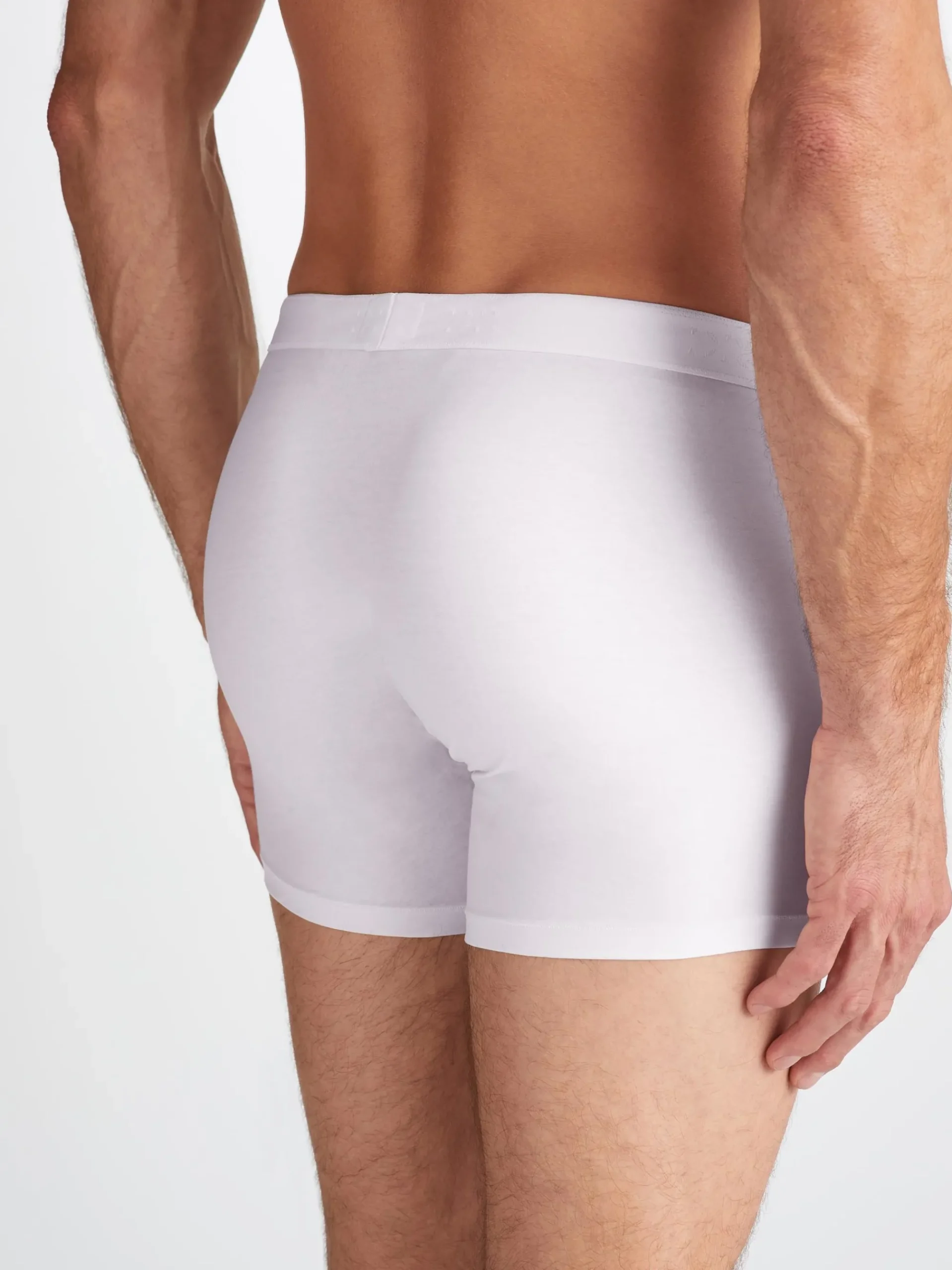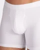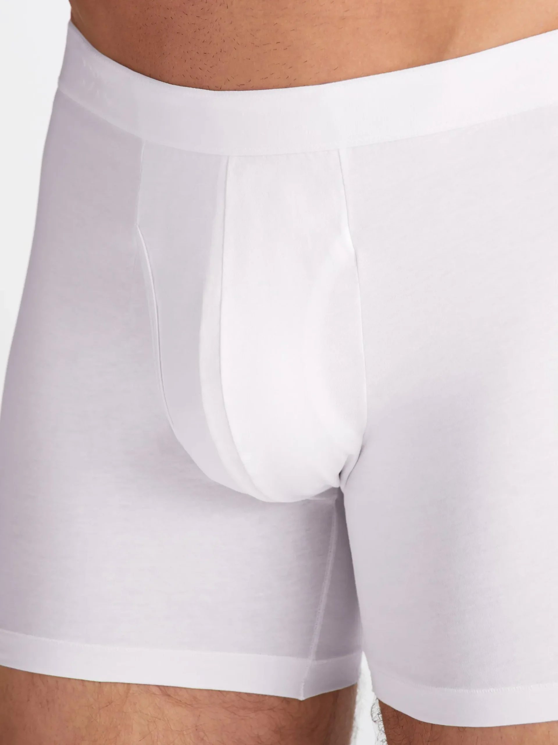 Our Jack trunks in white are cut for a streamlined, classic look with a fitted shape, classic fly open front and a longer leg. A fabric-covered waistband provides gentle skin contact.