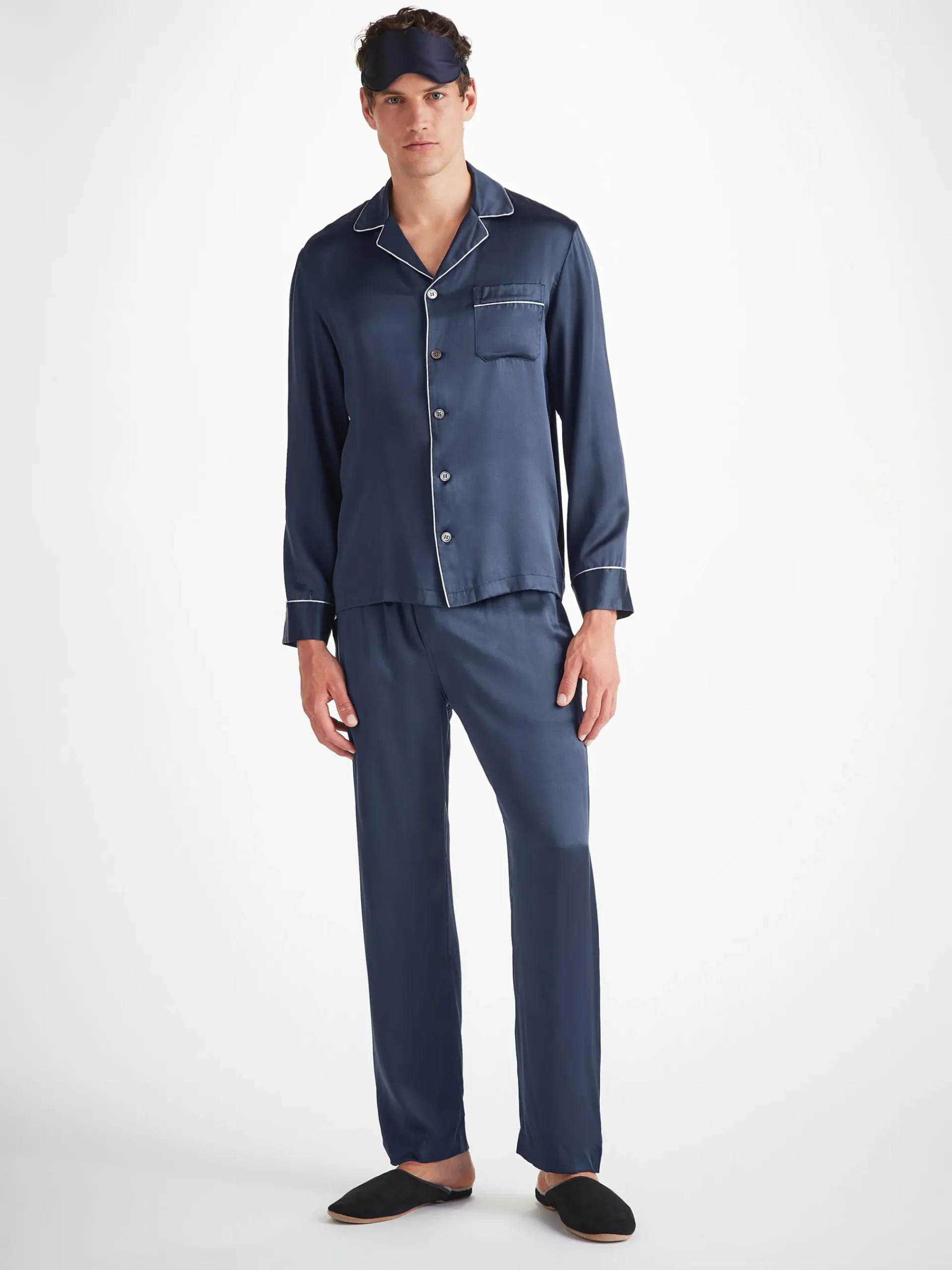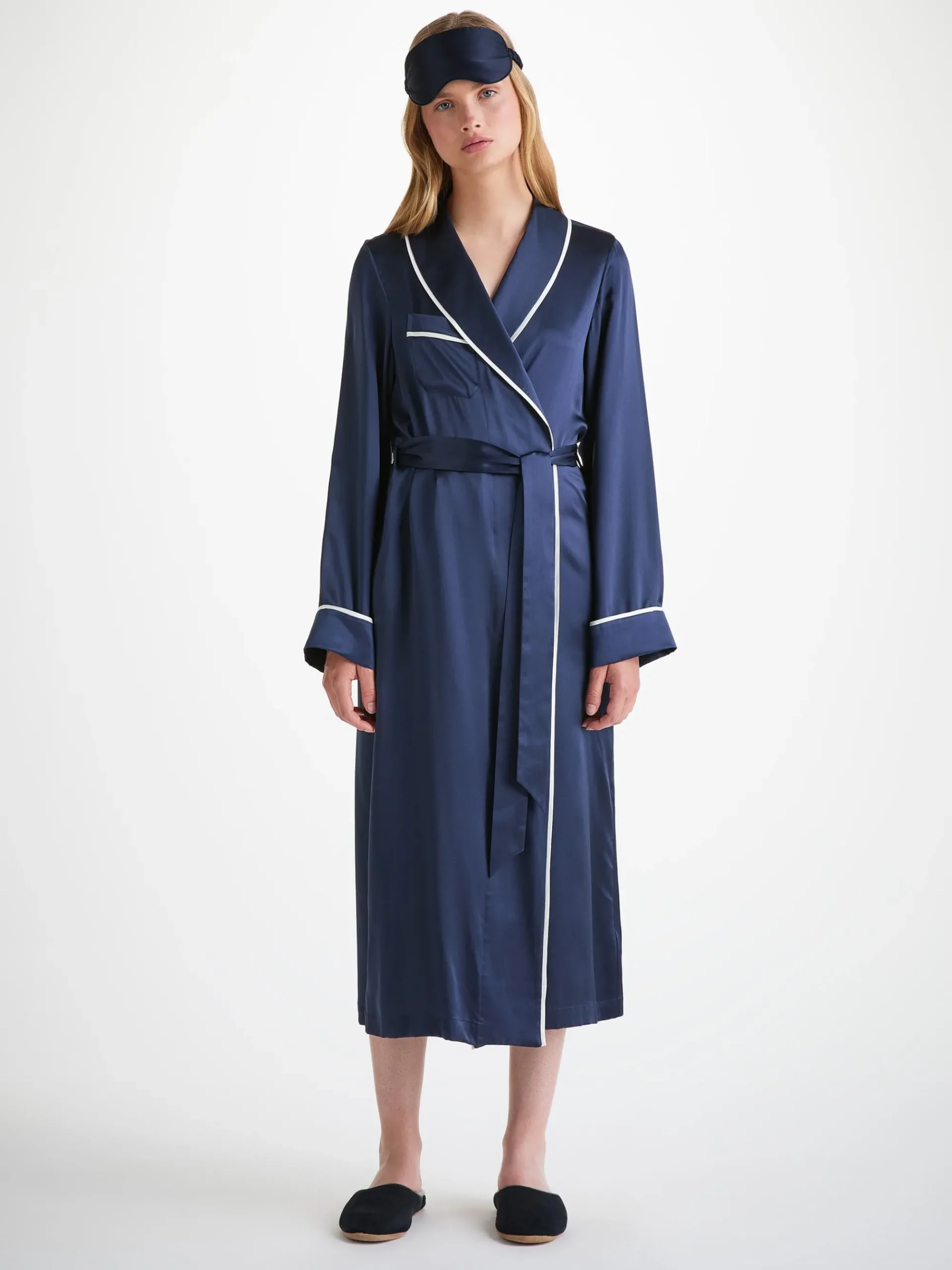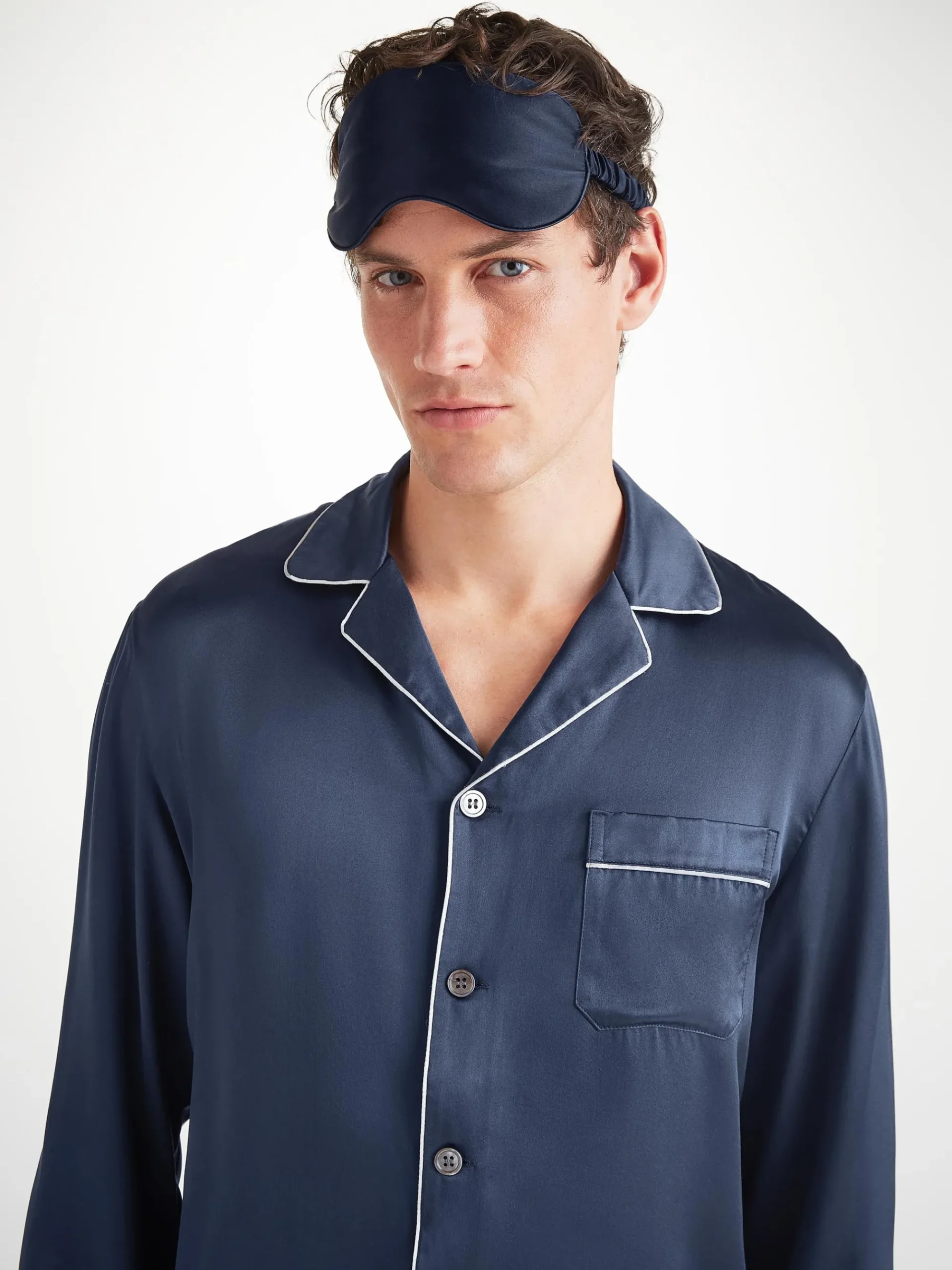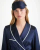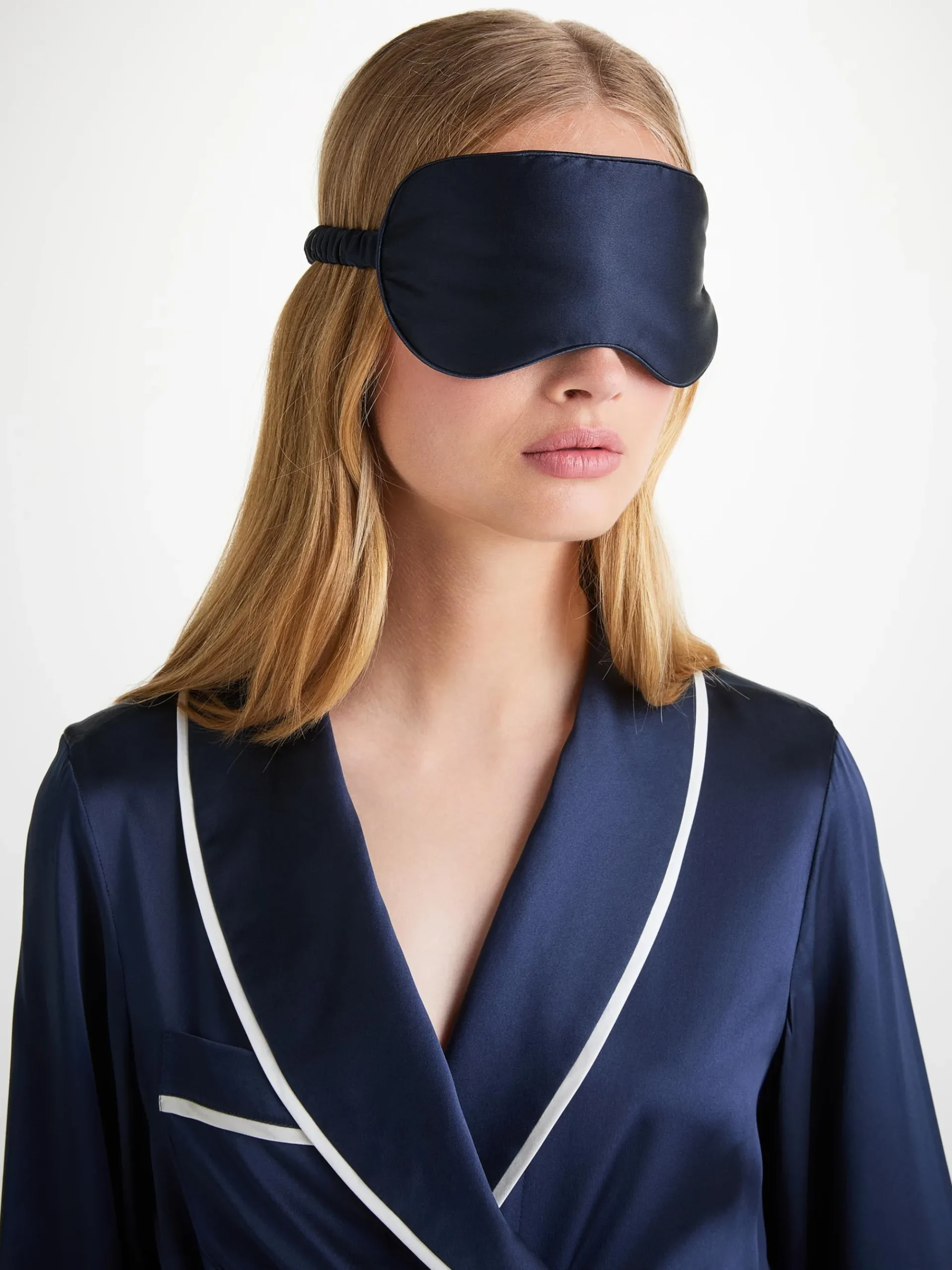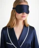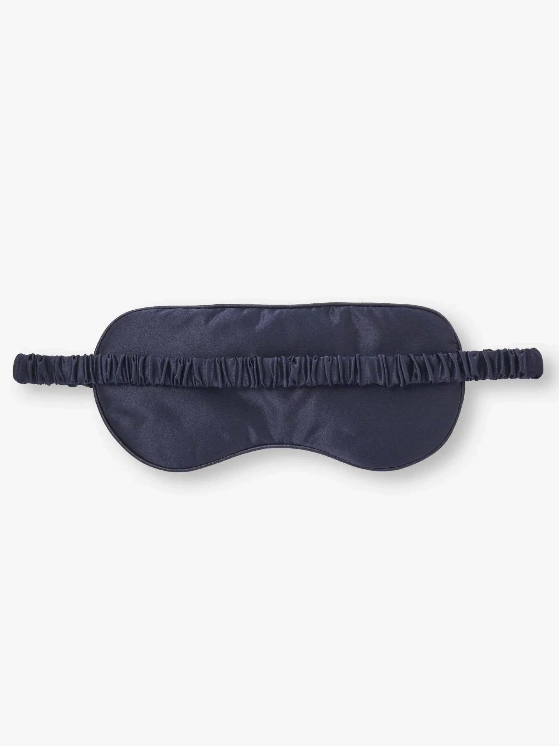 Piped in a complementary navy, the inside is gently padded for a soft and comforting feel, whilst a matching elasticated navy silk strap ensures a secure fit without being constricting on the skin. No more waking up wondering where your mask has disappeared to.r