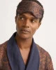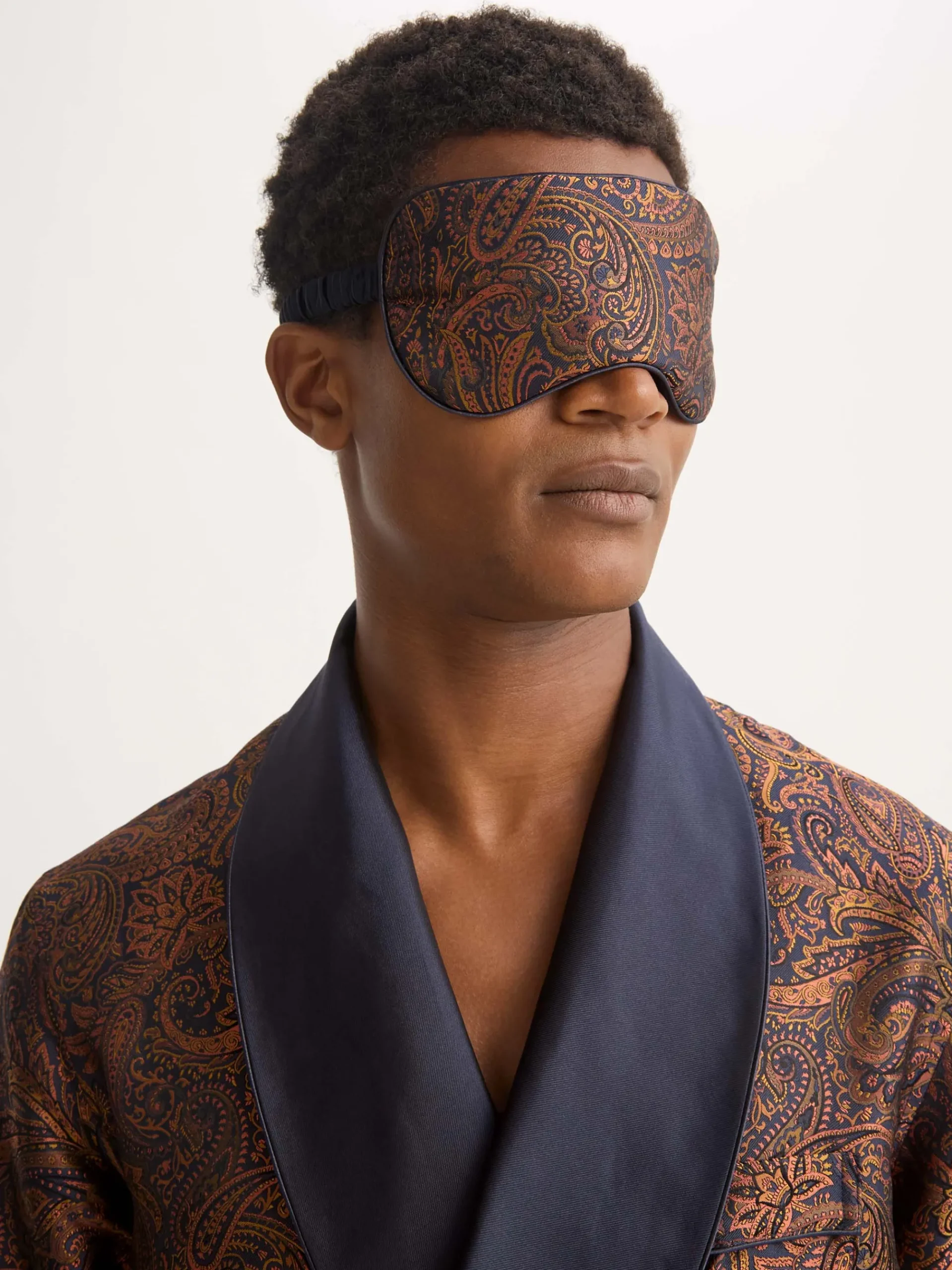 Adorned with a rich jacquard paisley weave in navy and antique gold, this silk eye mask is piped in complementary navy and finished with a silk-covered elastic strap for a secure yet gentle fit. Reversible for comfort, it ensures you stay cocooned in softness throughout the night.