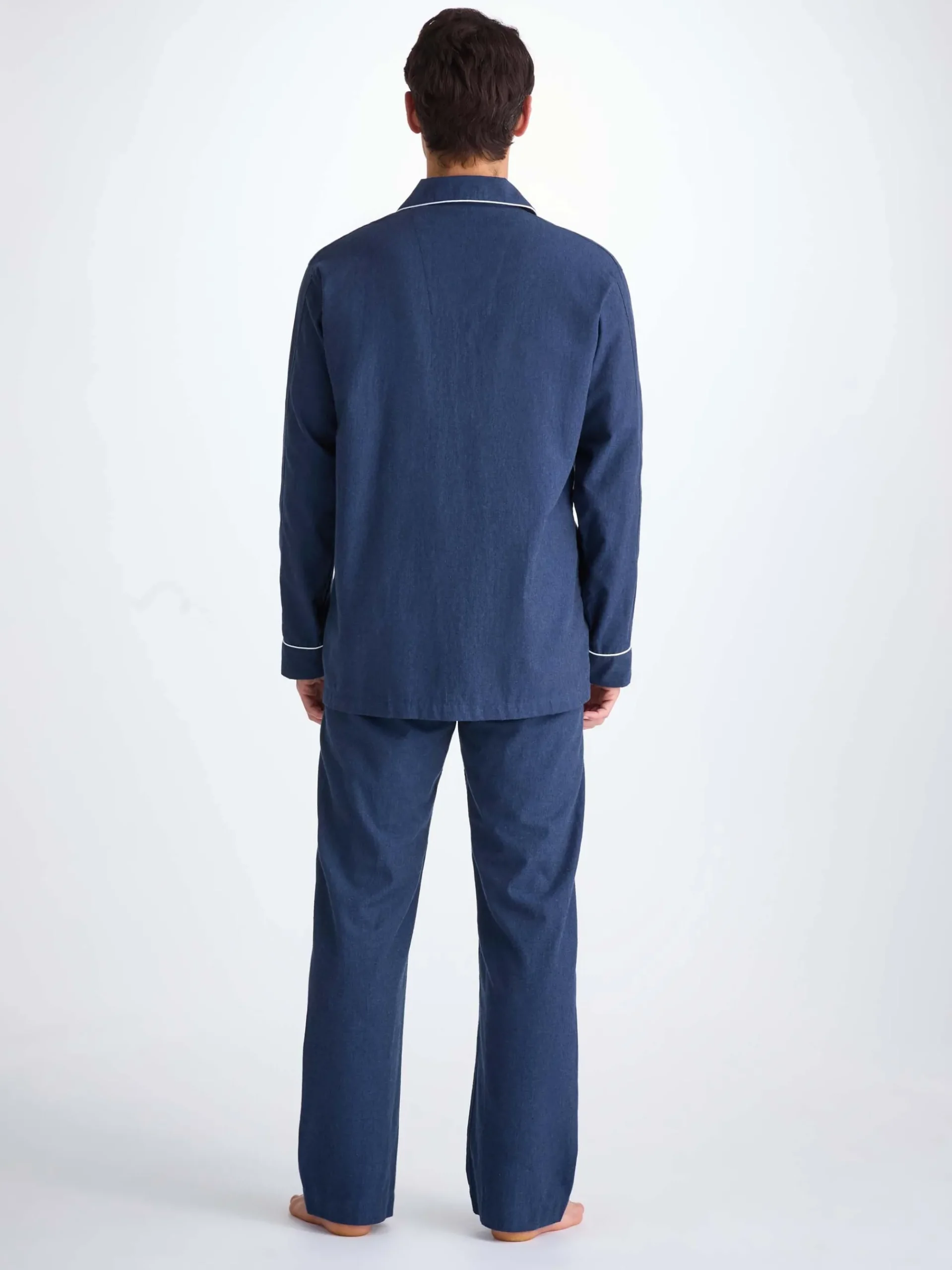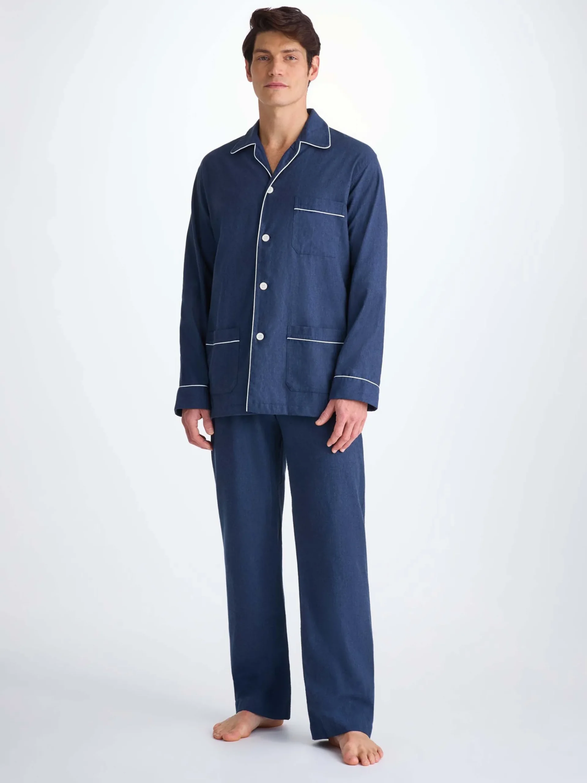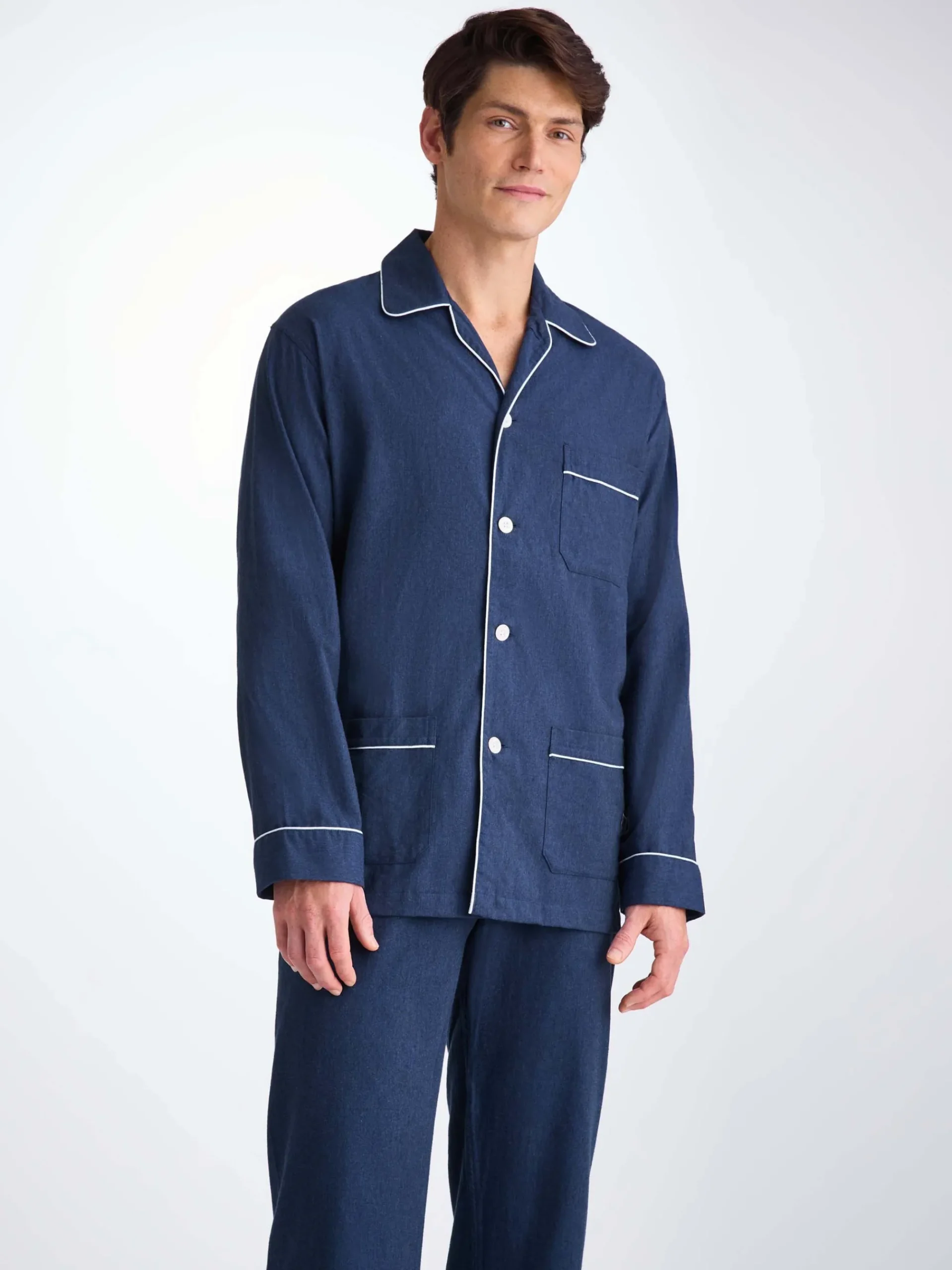 Featuring a three pyjama top, classic collar and adjustable two button traditional fly, this classic fit pyjama has a relaxed cut and elasticated sides on the trousers, meaning the front and back are flat for your comfort. Furthermore, the rest of the jacket is piped throughout with a complementary white piping.