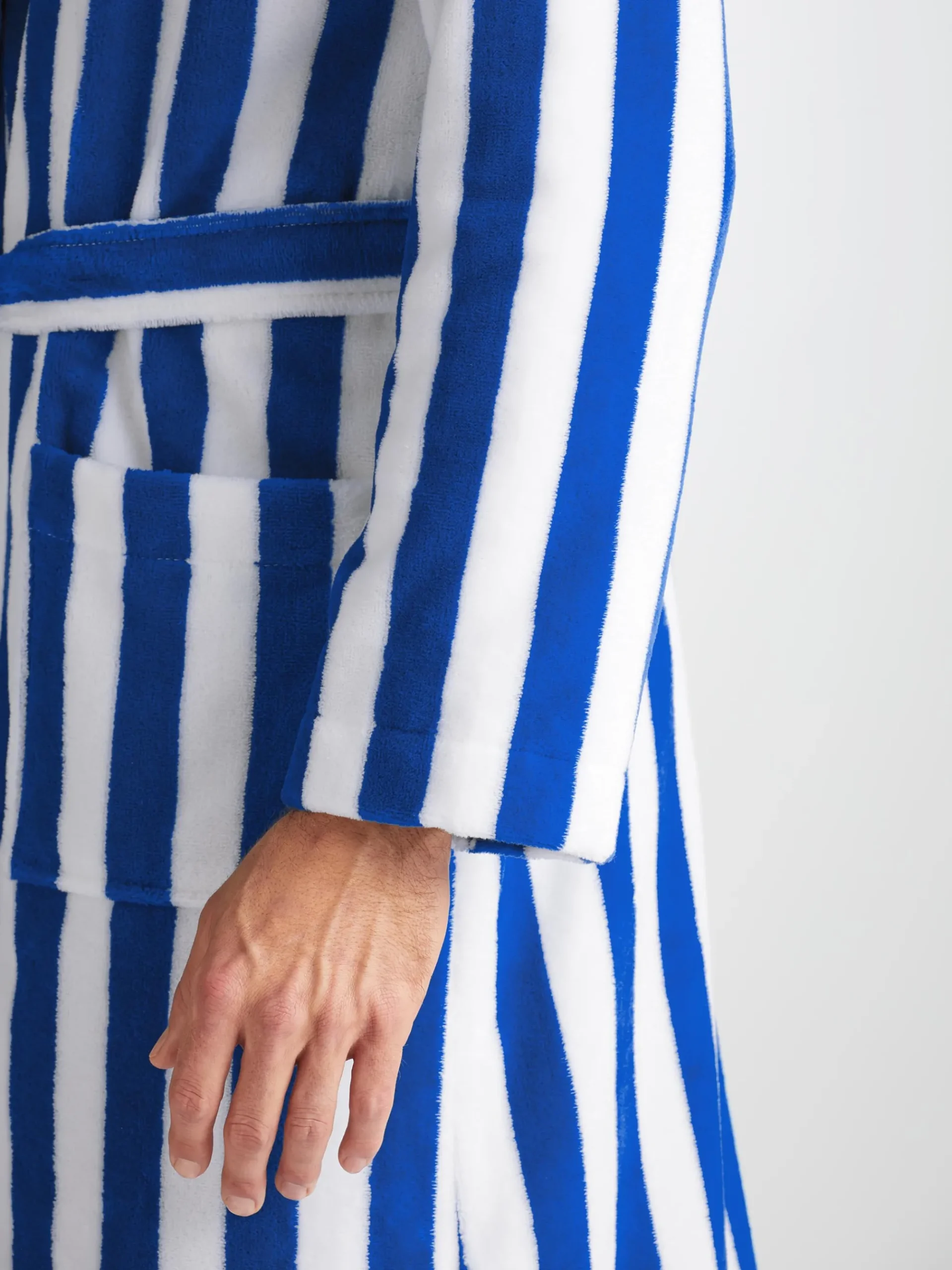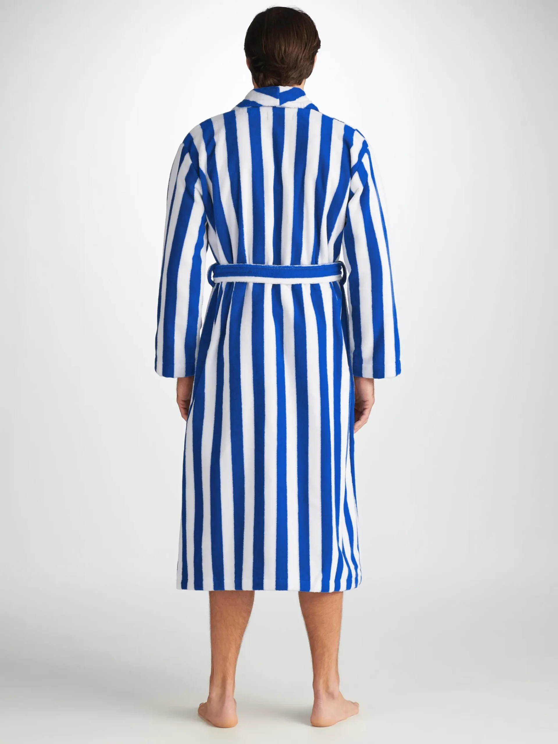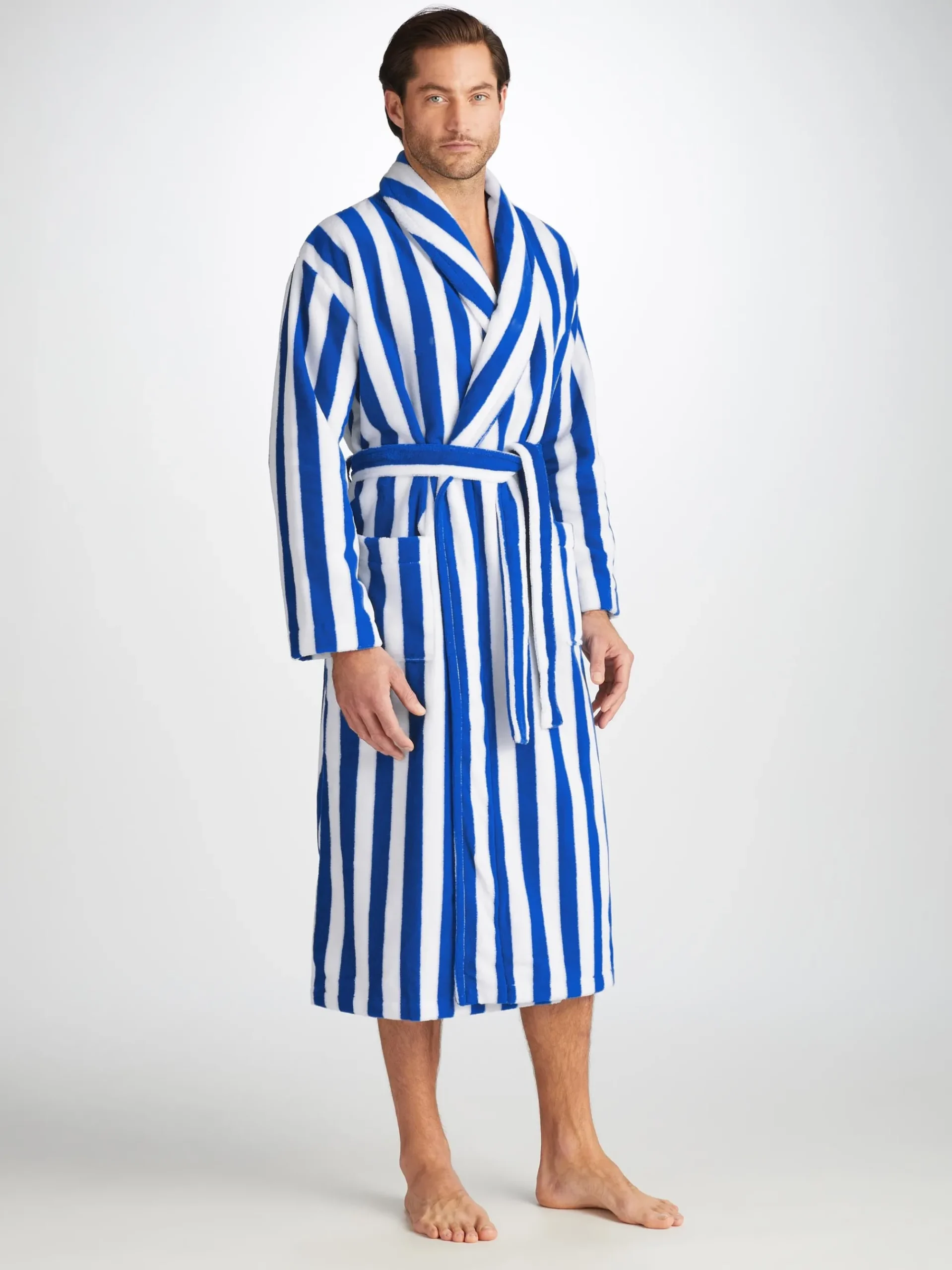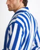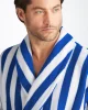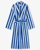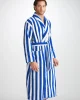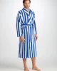 Our Aston bathrobe is a customer favourite, seen here with classic blue and white stripes, it features a classic shawl collar and two side pockets for practicality while around the house. It’s fastened with a fabric tie belt for the perfect fit.