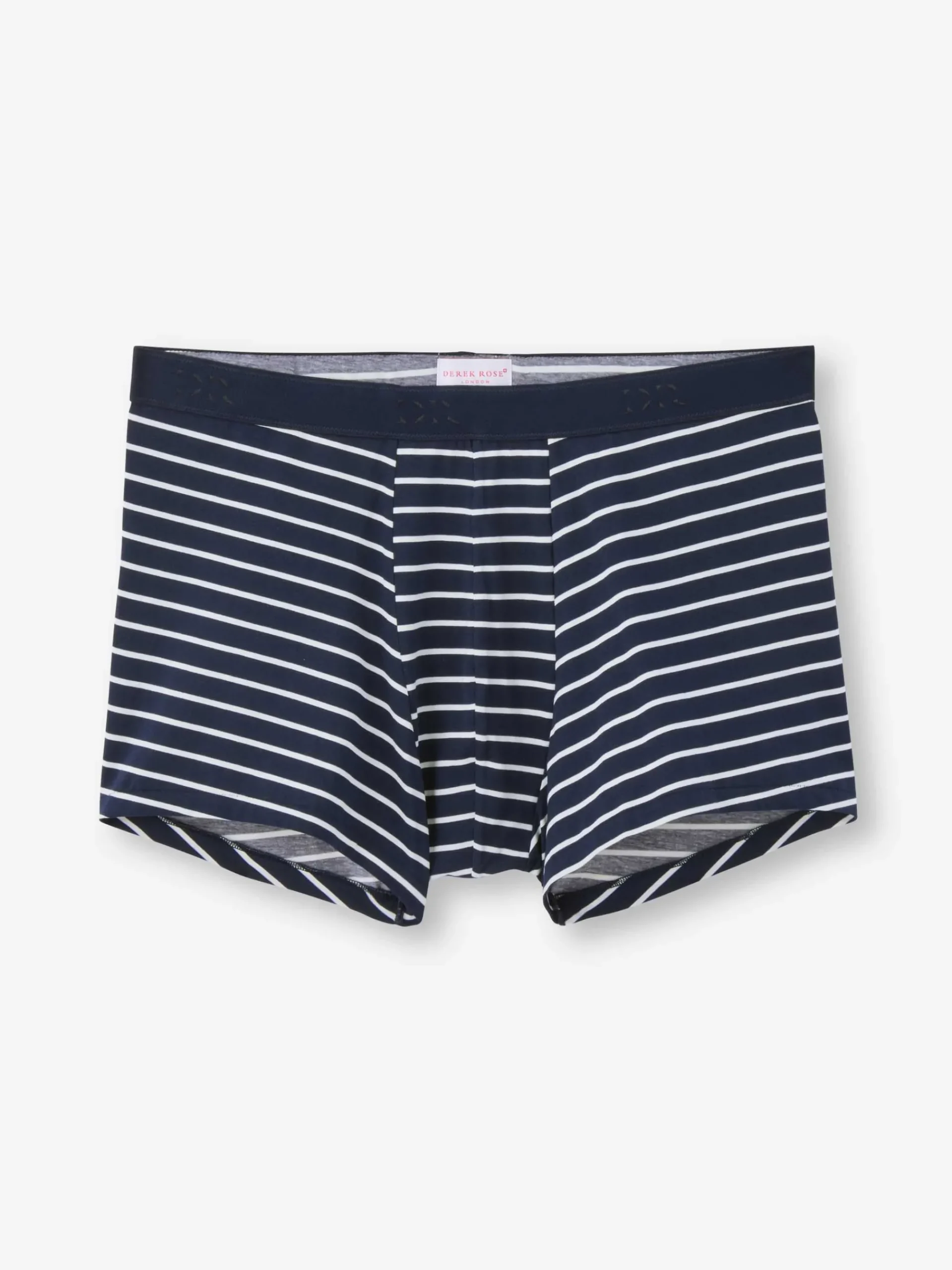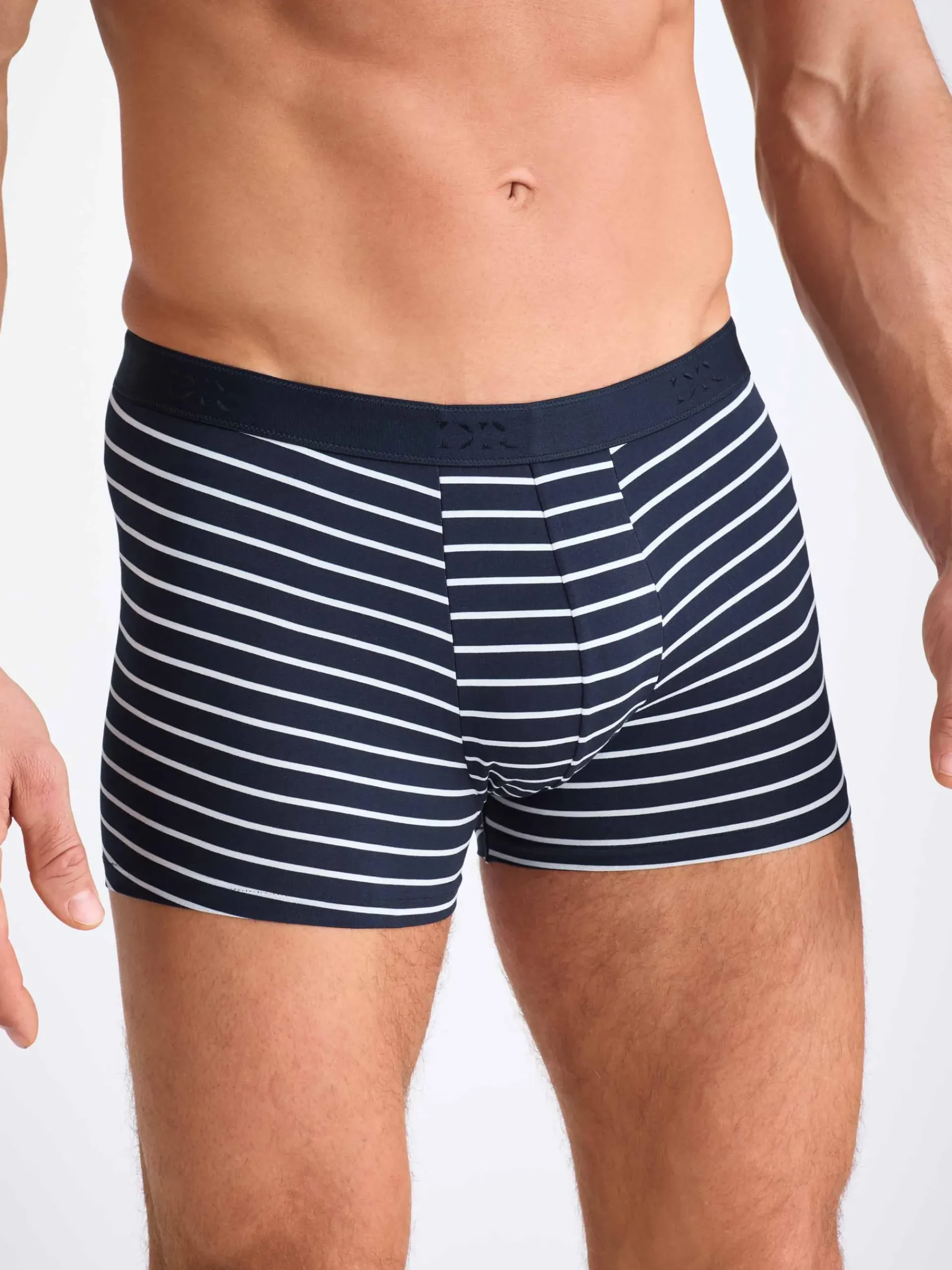 For those who prefer their boxer briefs with shorter legs, our cotton stretch boxer briefs combines a closed front with a streamlined, shorter leg. Featuring a classic navy and white toned stripe print.