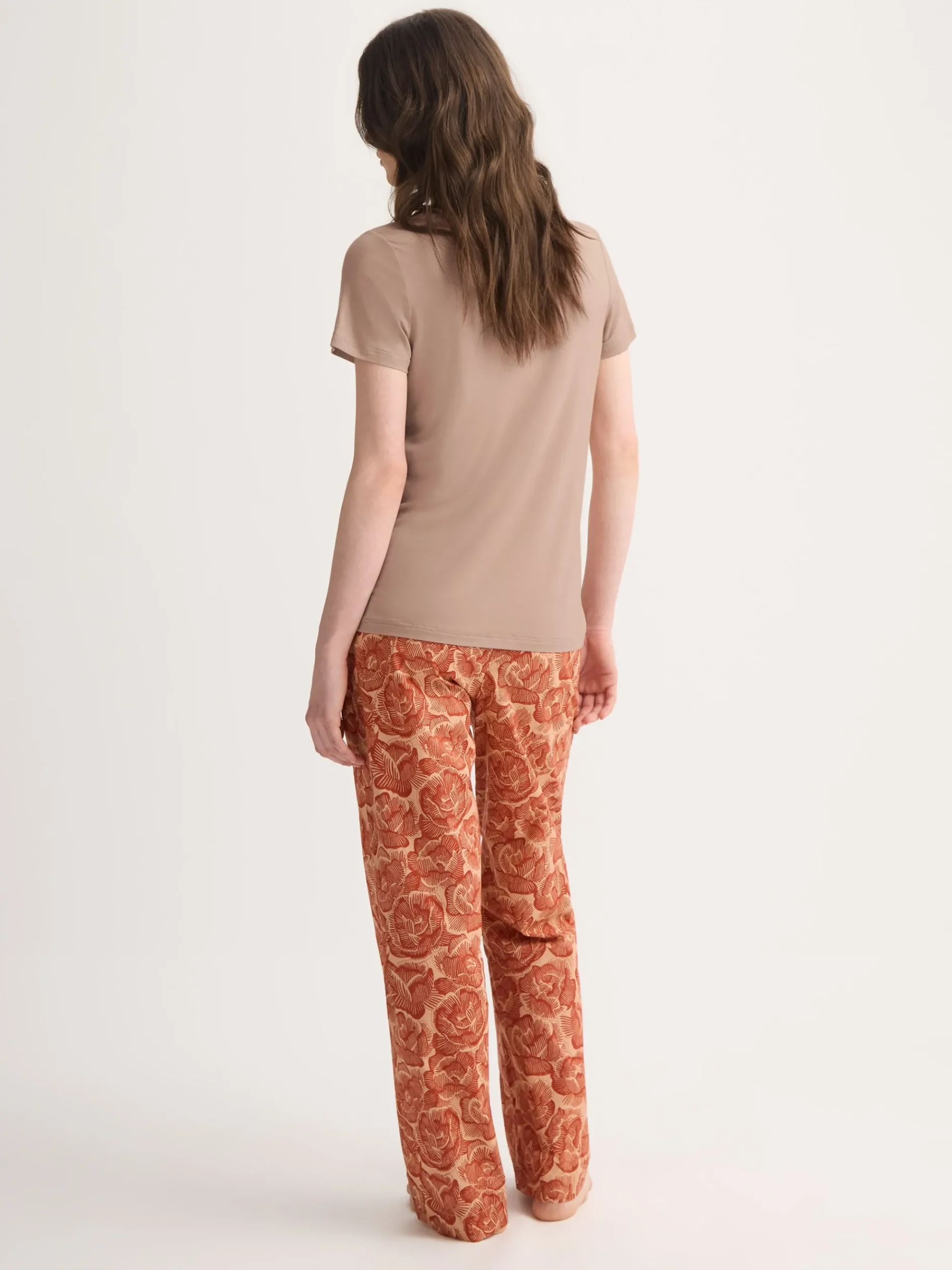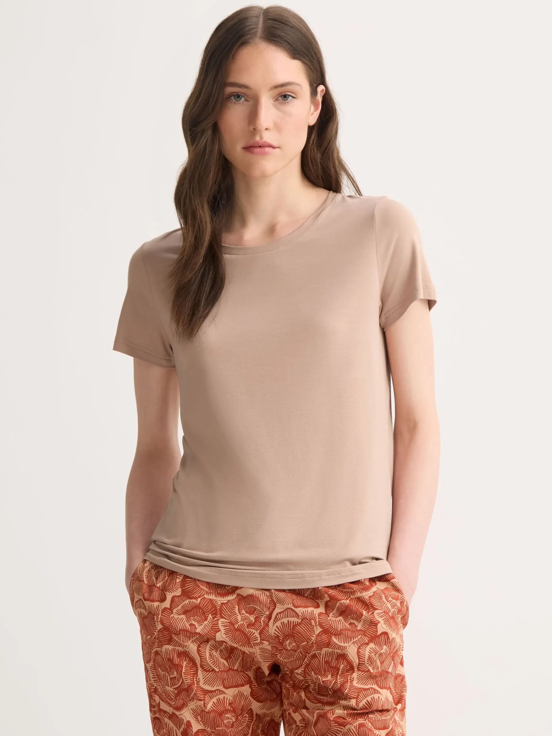 Soft, breathable, and effortlessly comfortable, the Lara t-shirt in almond is a wardrobe favourite that transitions seamlessly from daywear to nighttime. With its classic crew neckline and gently flattering modern silhouette, it’s a versatile piece that works beautifully on its own, layered under a blazer, or with matching pyjamas.