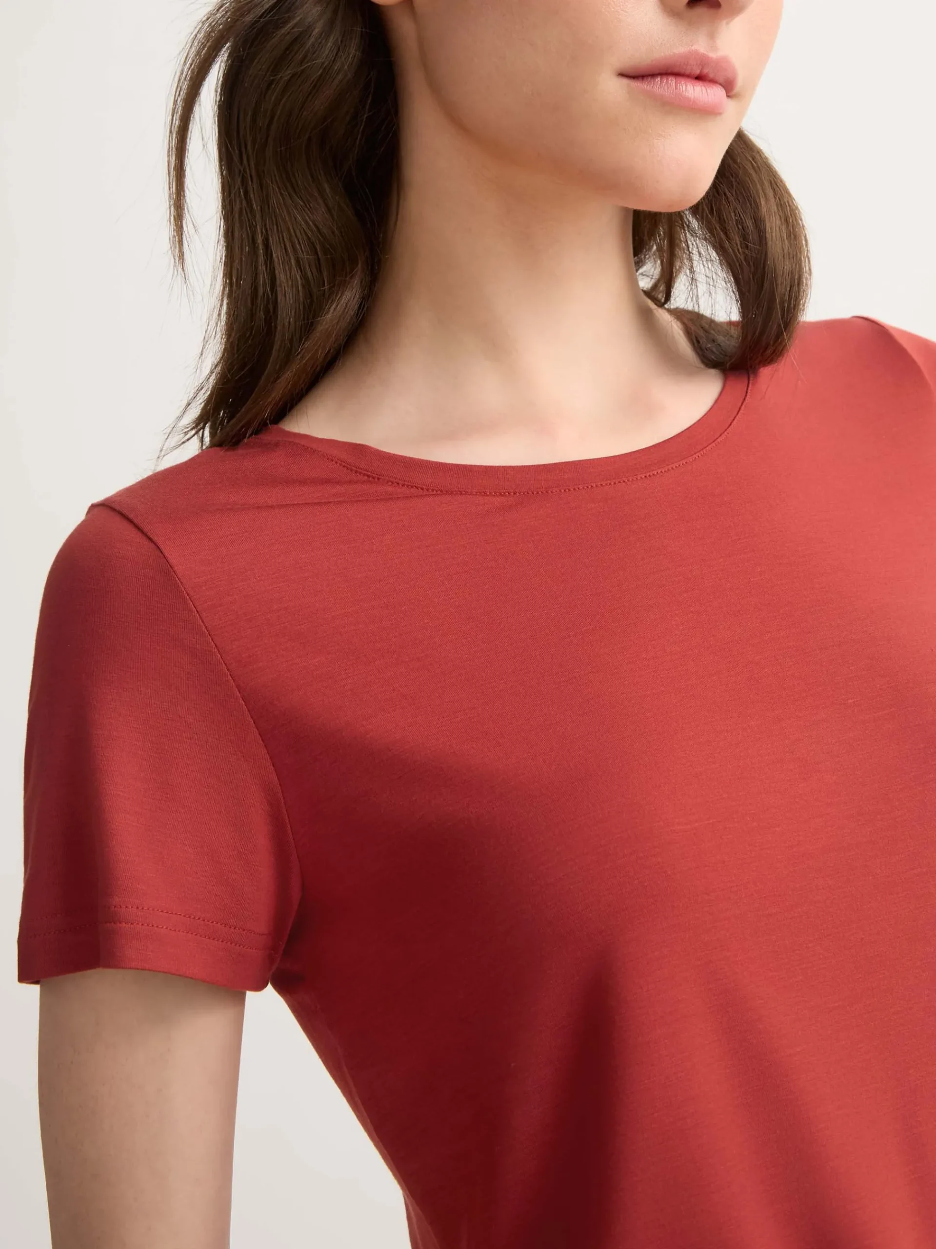 Soft, breathable and effortlessly comfortable, the women’s Lara t-shirt in rose red is a wardrobe favourite that transitions seamlessly from daywear to nighttime. With its classic crew neckline and gently flattering modern silhouette, it’s a versatile piece that works beautifully on its own, layered under a blazer, or with matching pyjamas.