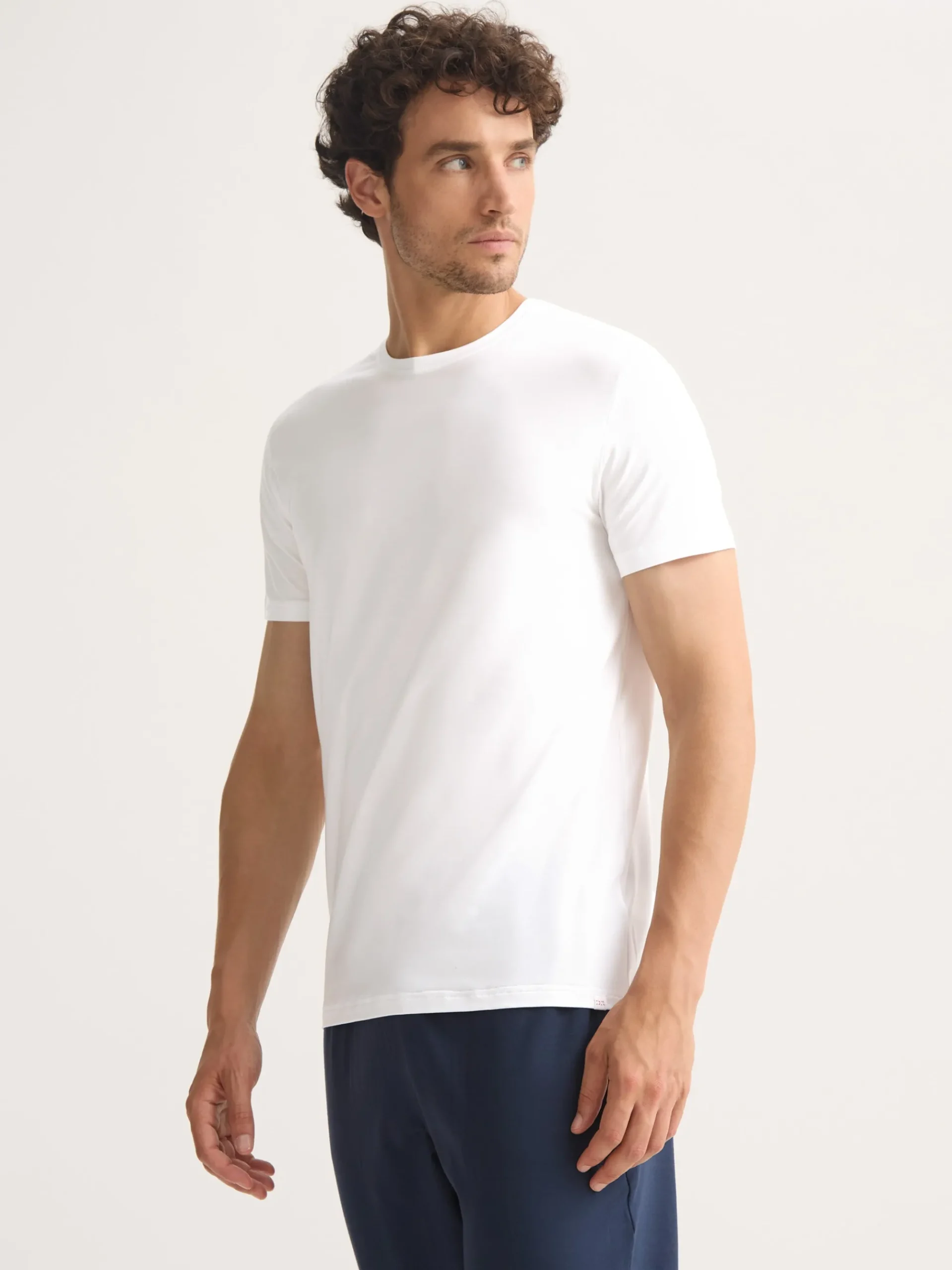 Our Basel menβs T-shirt in white brings crisp simplicity together with exceptional softness. Cut from our stretch micro modal, it offers a smooth, breathable feel that makes it a natural choice for sleeping, lounging or travelling in comfort.