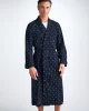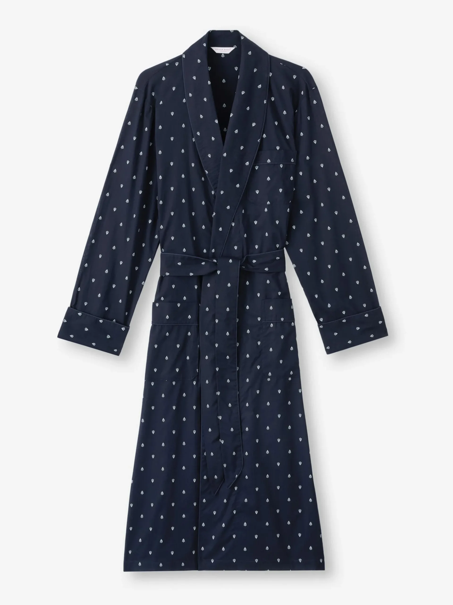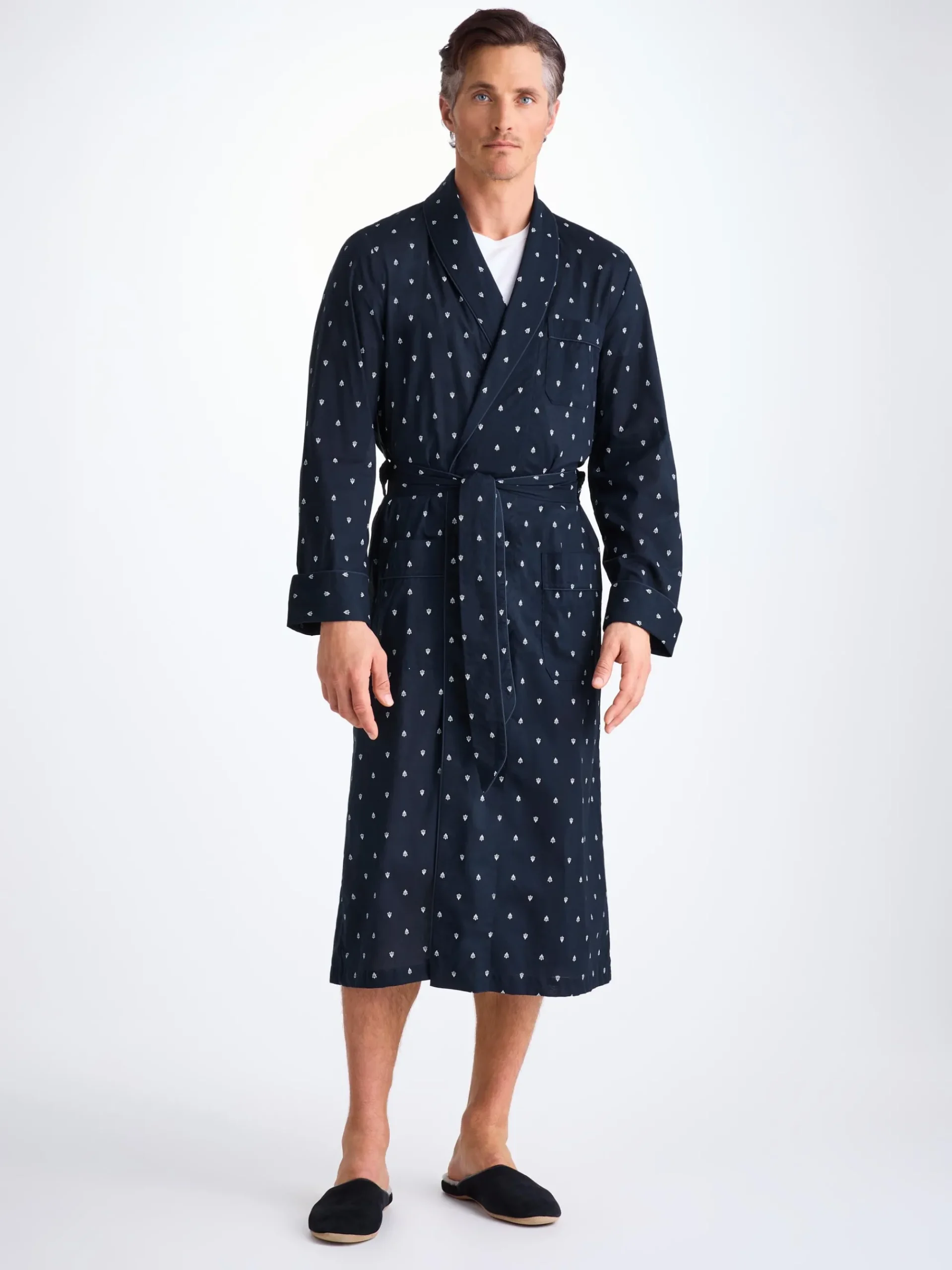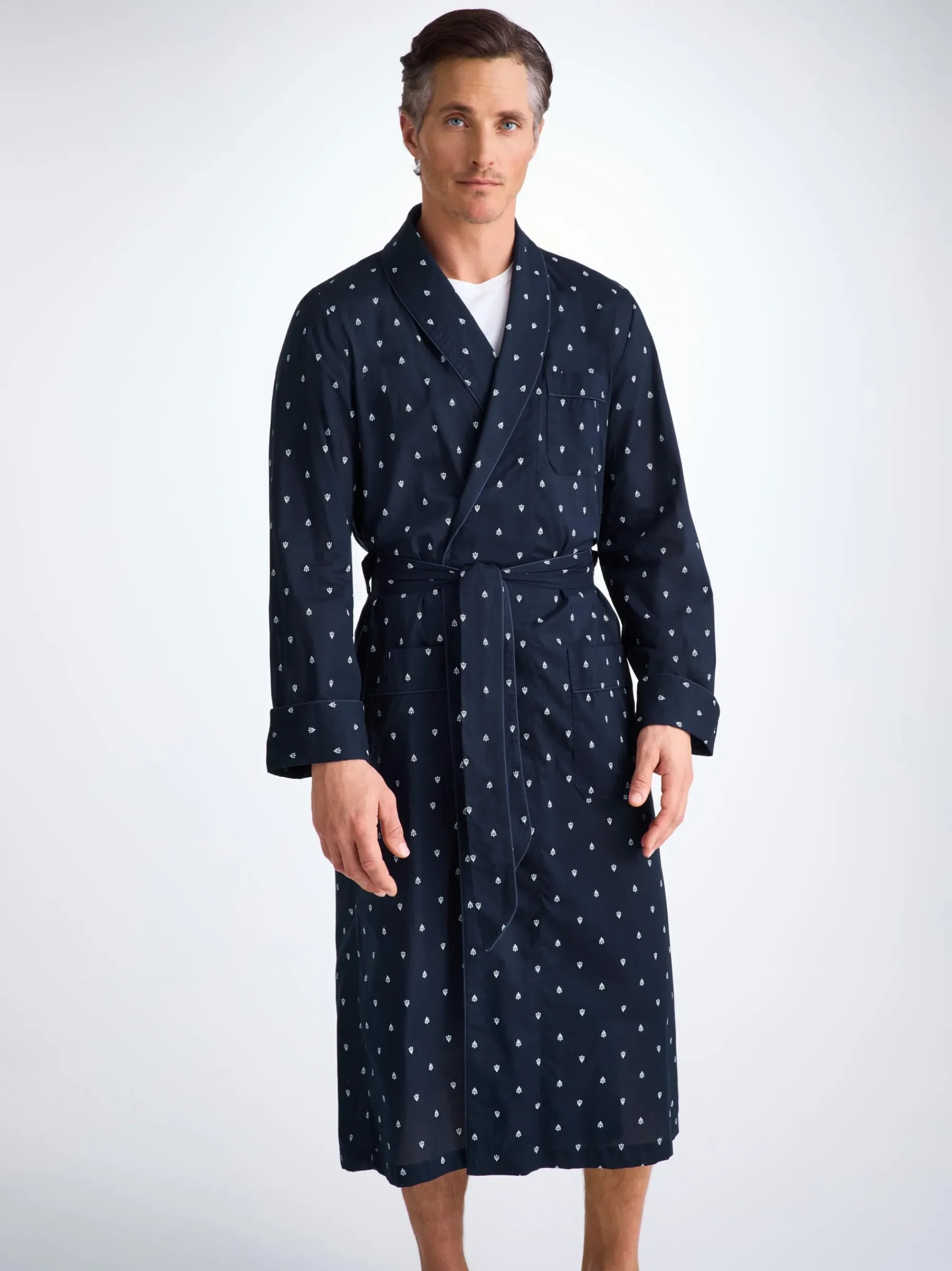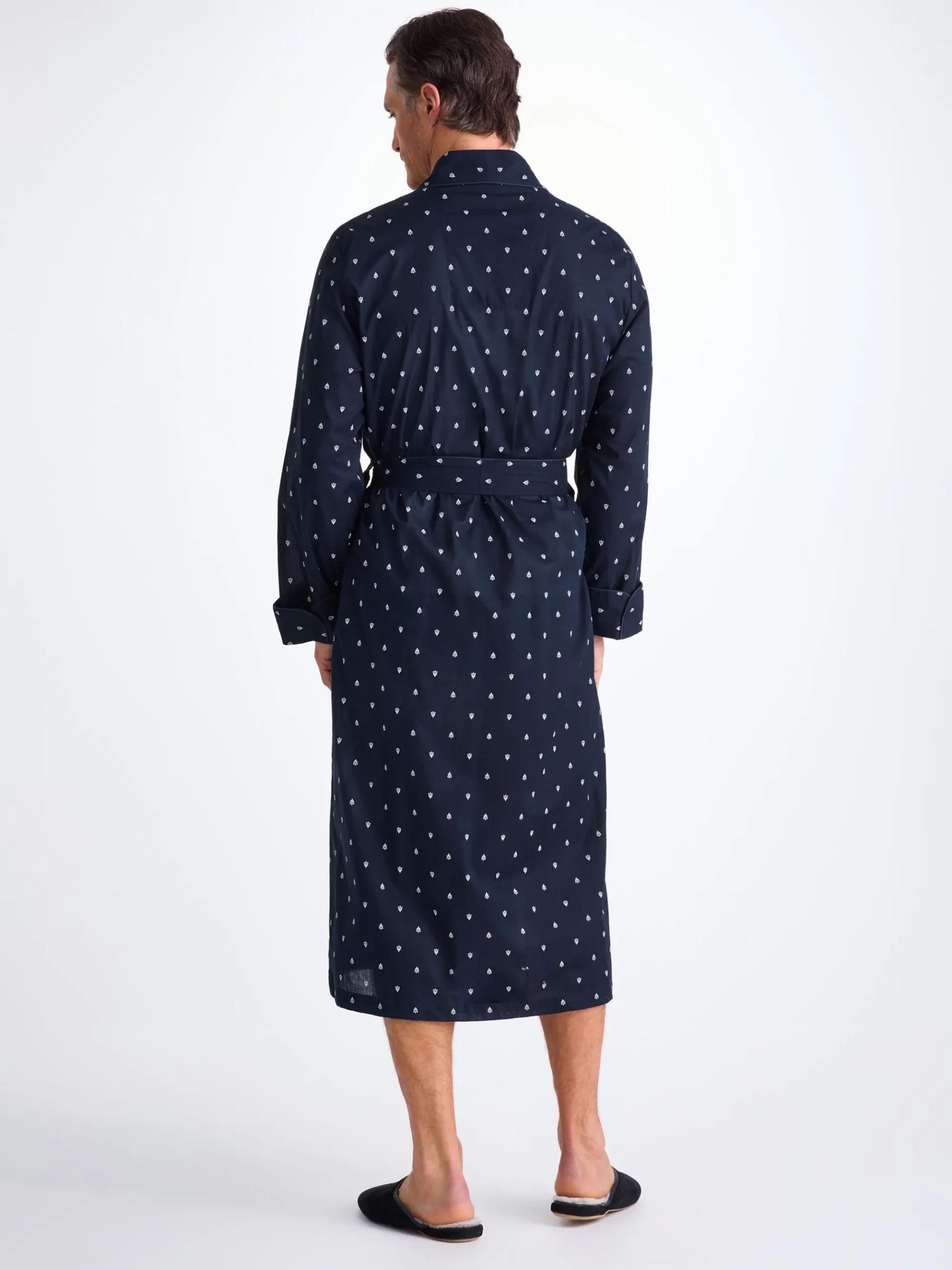 Made from our signature cotton batiste, a light and soft fabric that excels in warmer conditions, the paisley motif dressing gown features a classic shawl collar design with a breast pocket and two front pockets for practicality while around the house. The gown is also complemented with navy piping, a print inspired by traditional woodblock printing and a self-fabric tie-waist for an added touch of luxe.