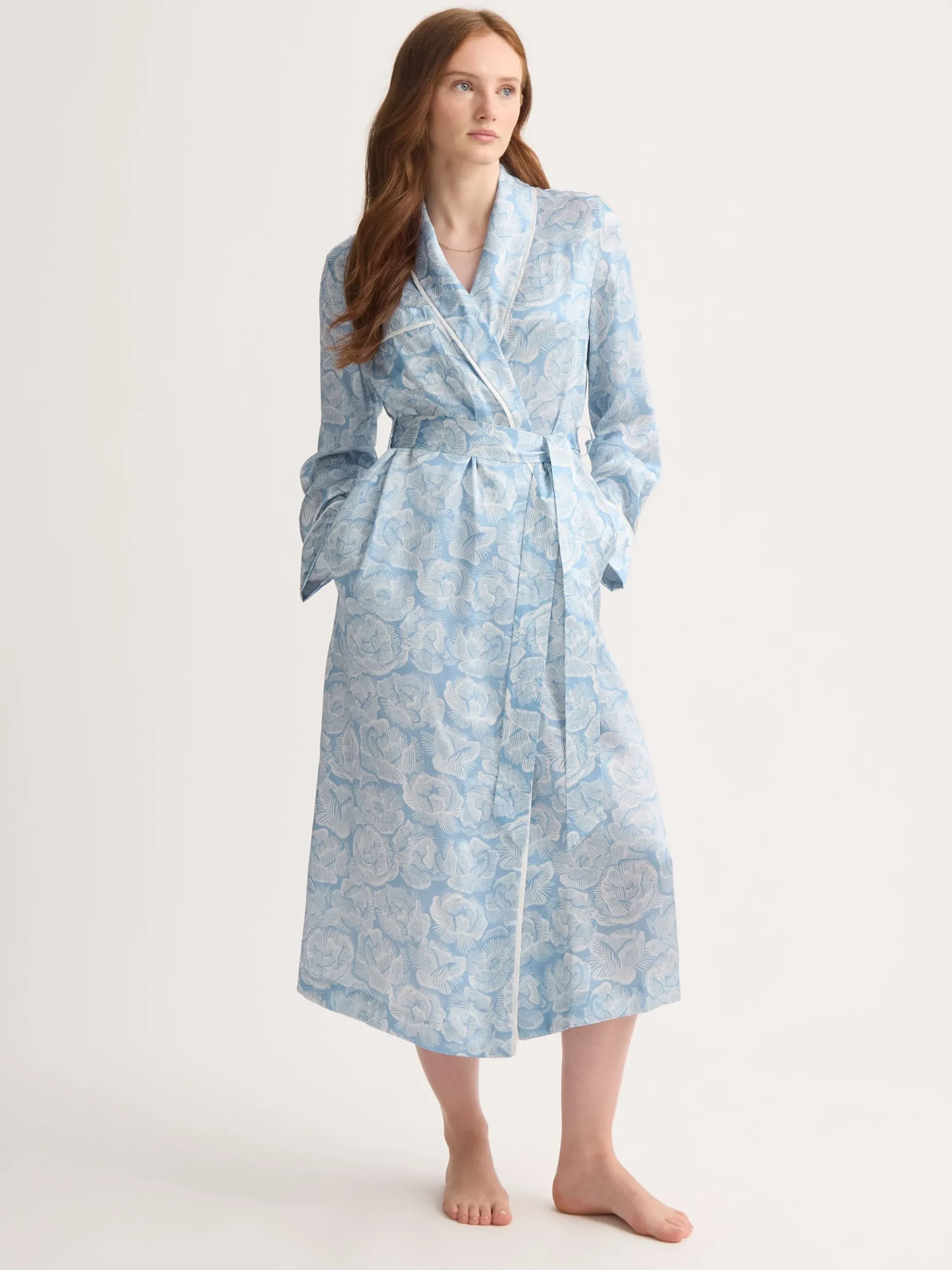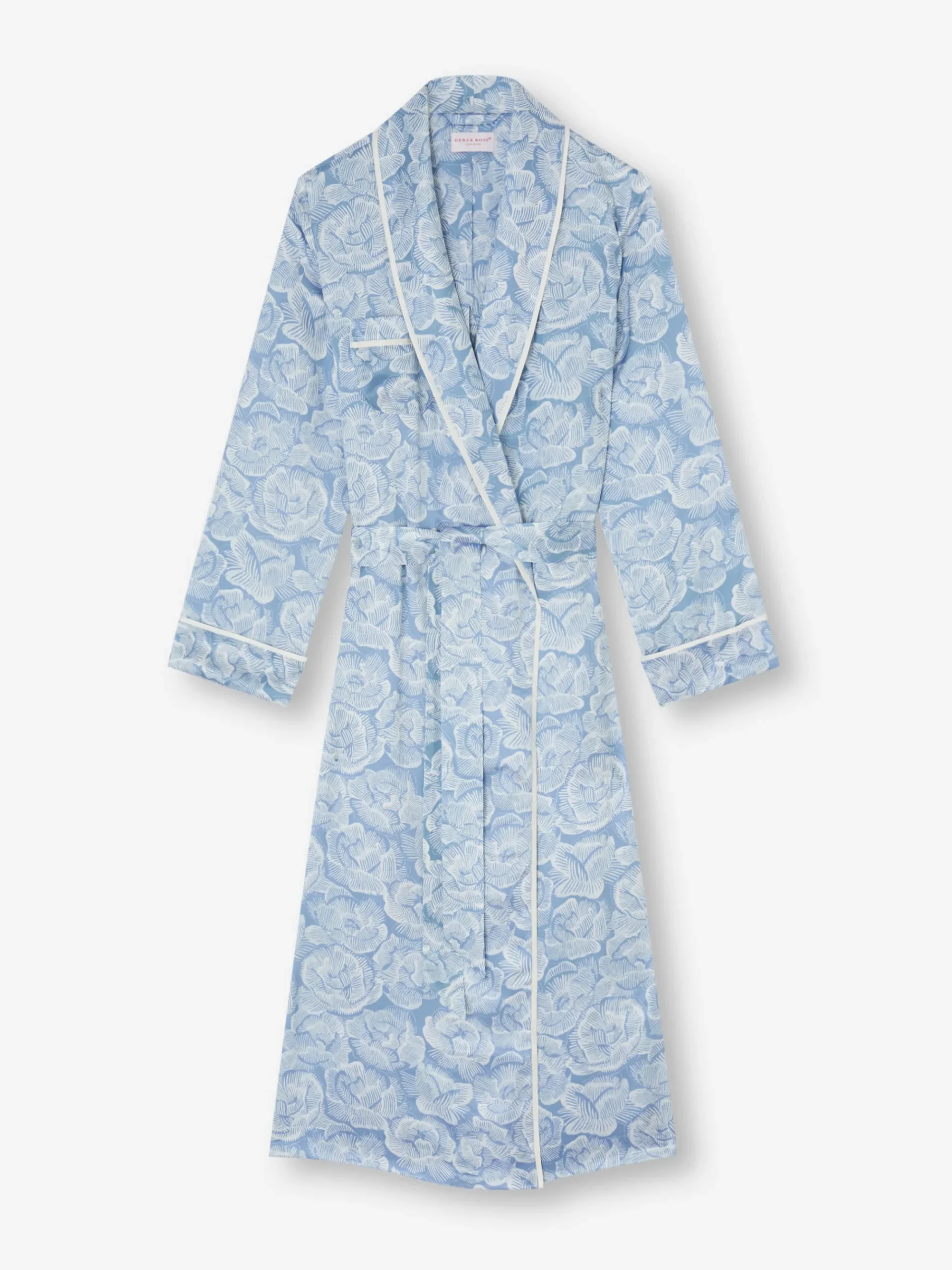 Crafted from the finest 100% Mulberry silk, this long dressing gown combines timeless elegance with exceptional comfort. The delicate light blue and white rose print celebrates the heritage of Derek Rose, reimagined in a soft, romantic palette that feels as serene as it looks.