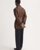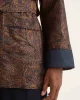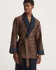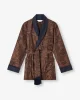From its origins as a practical cover-up to its status as an icon of gentlemanly style, the men’s smoking jacket remains the epitome of elegant loungewear. Our version honours this heritage with a modern, minimalist cut while showcasing a luxurious silk jacquard in navy blue and antique gold paisley.