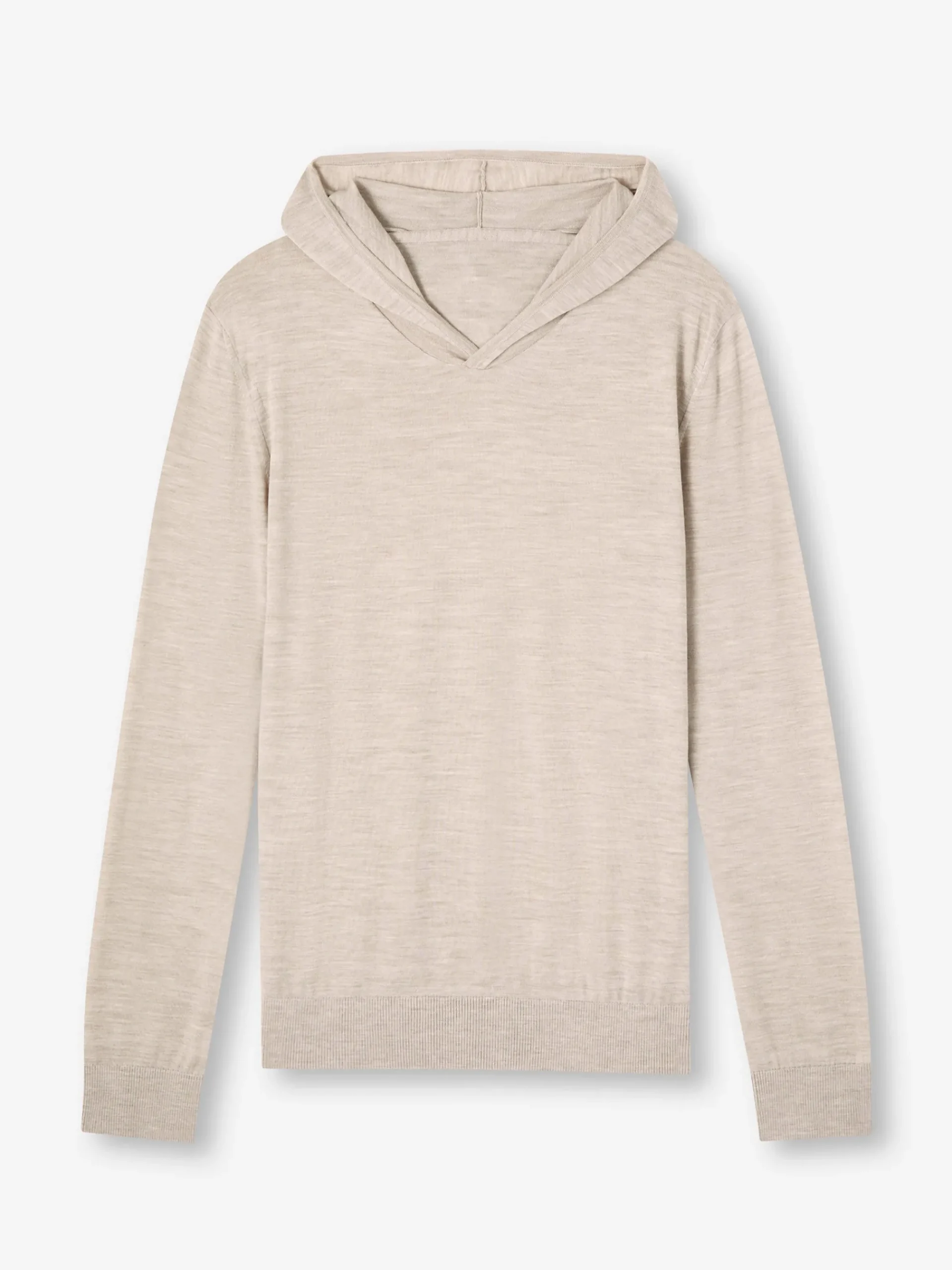 Designed with 100% merino wool, our Orson oat hoodie has been created with a ribbed neckline and cuffs as well as a practical hood.