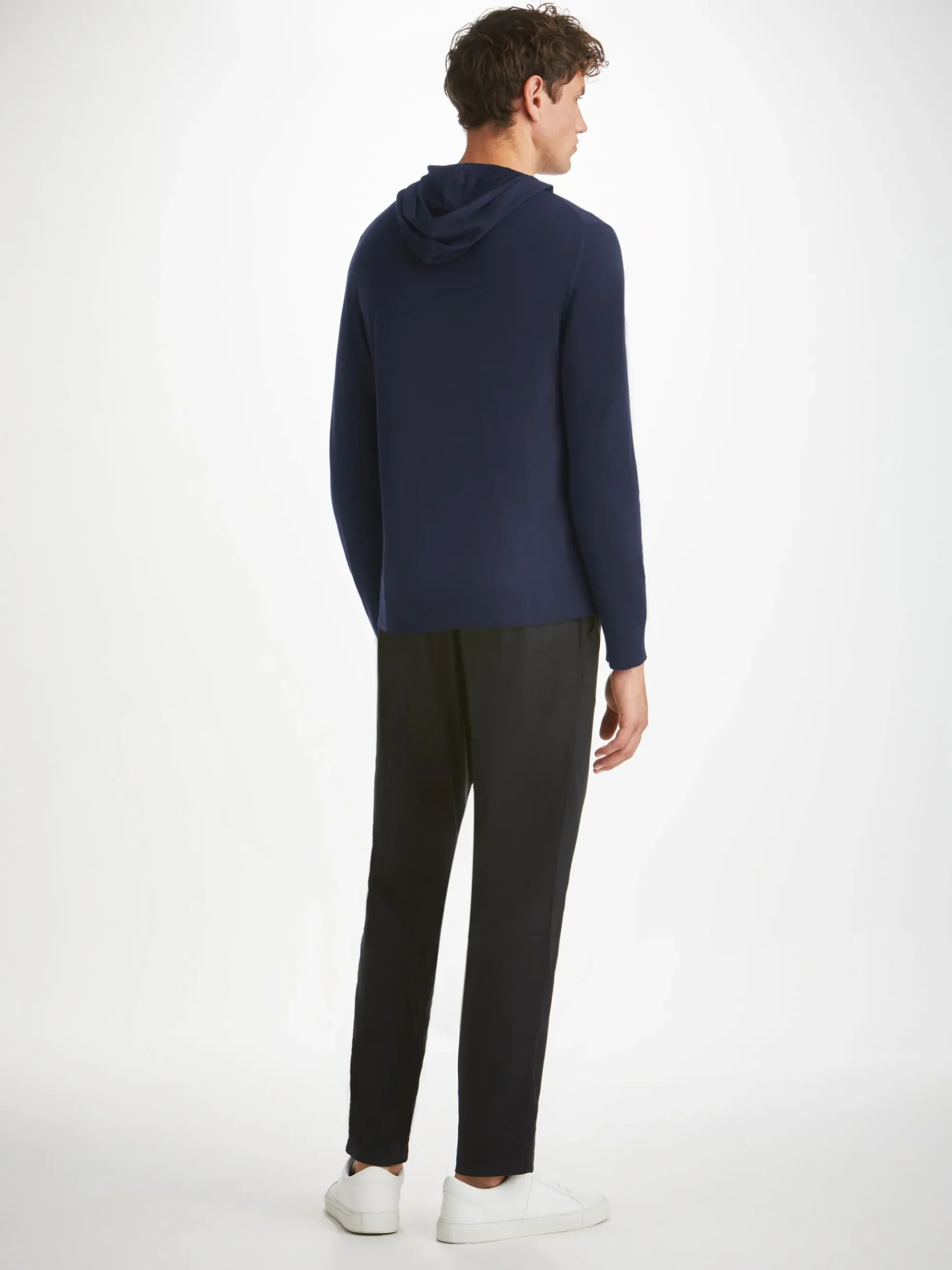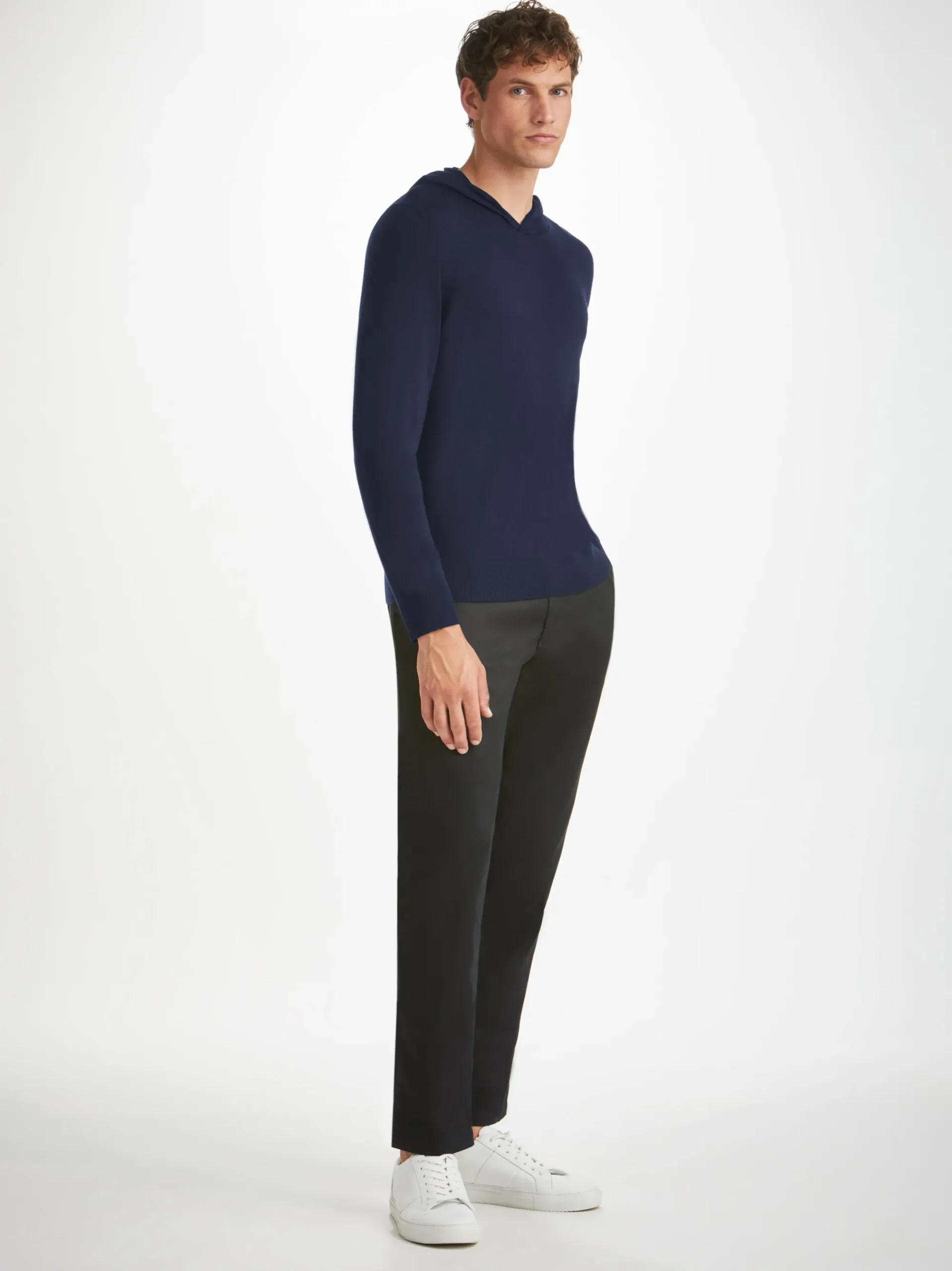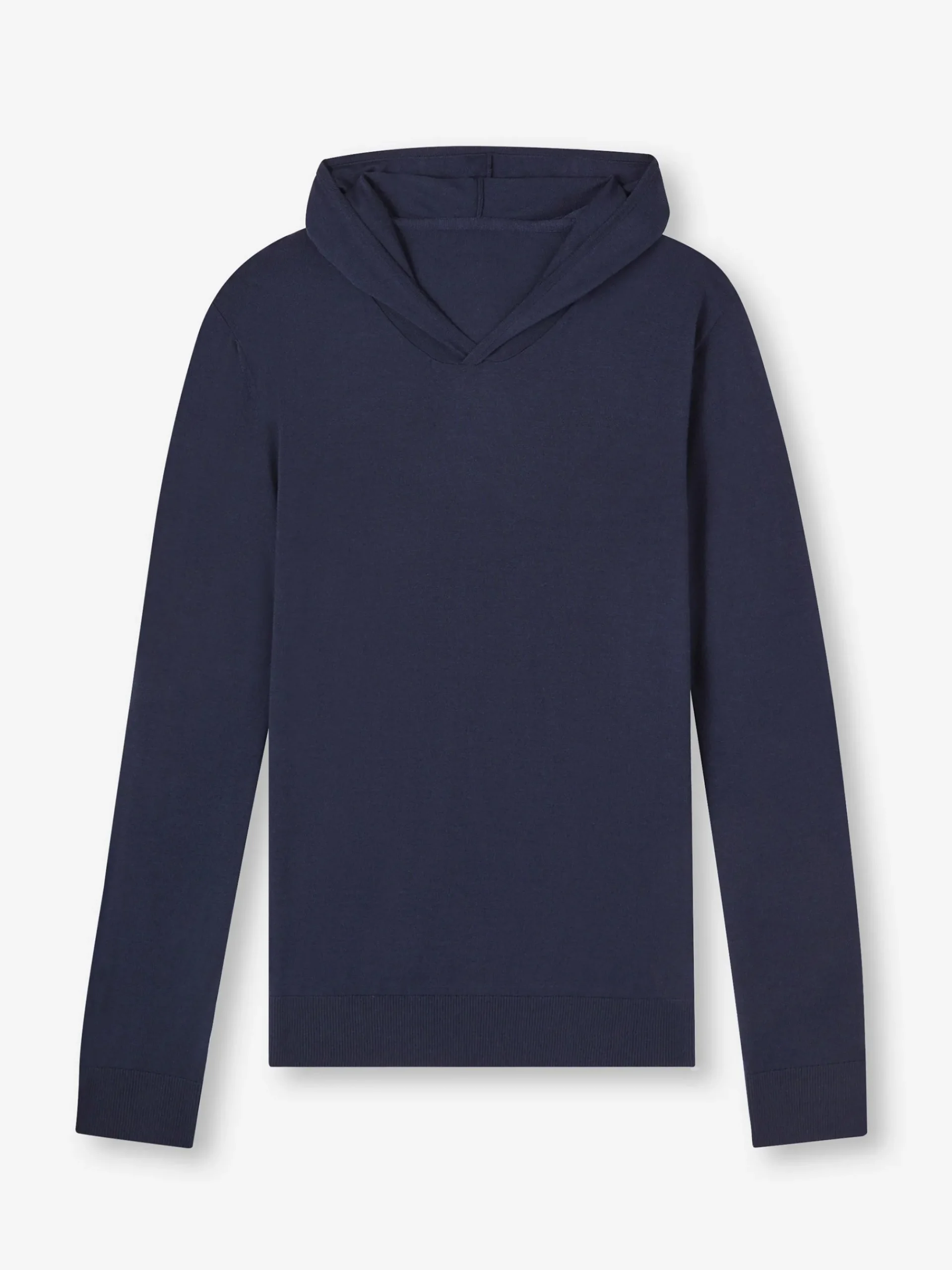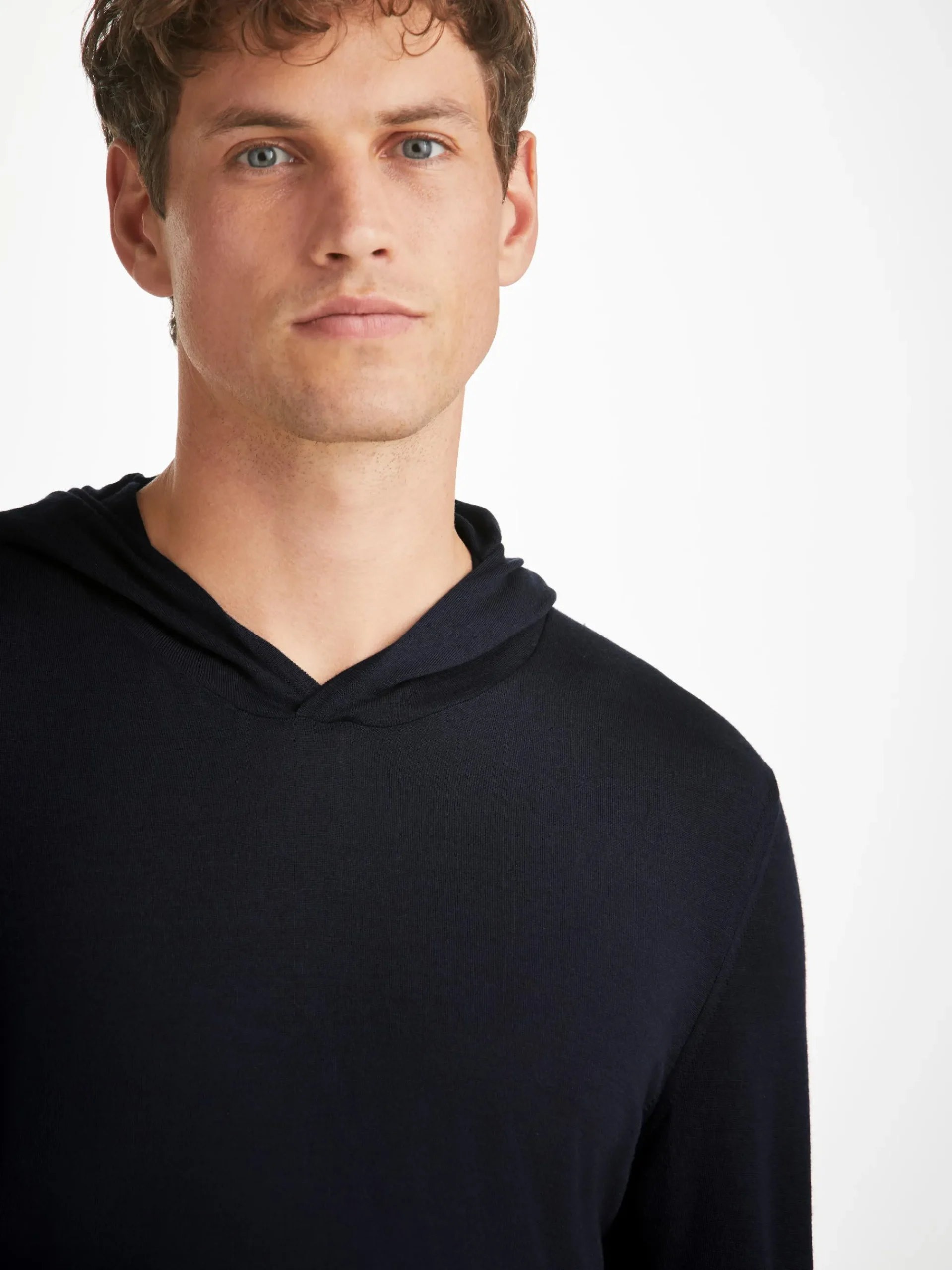 Designed with 100% merino wool, our Orson navy hoodie has been created with a ribbed neckline and cuffs as well as a practical hood.