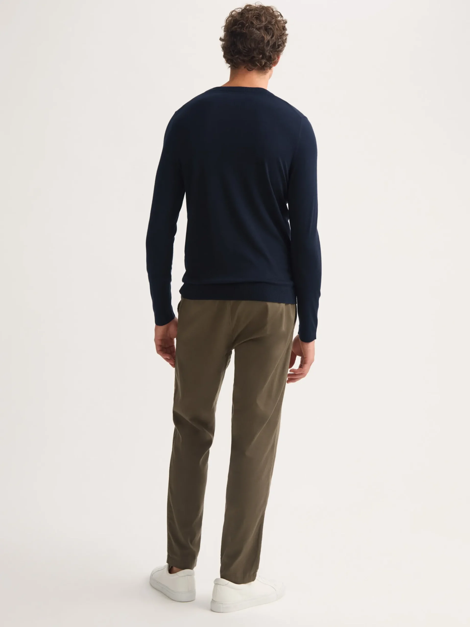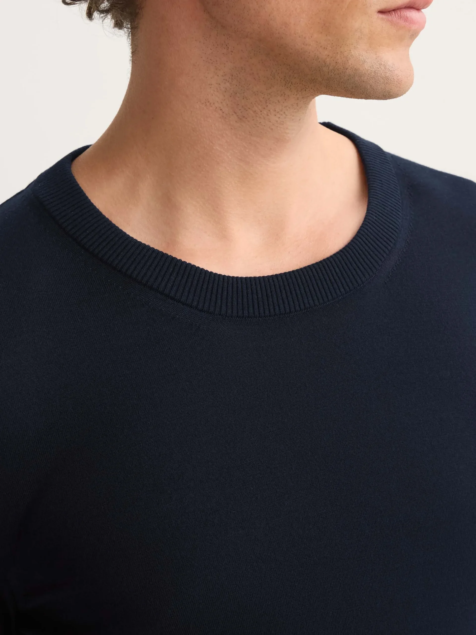 Designed with 100% merino wool, our Orson navy sweater has been created with a ribbed neckline and cuffs.