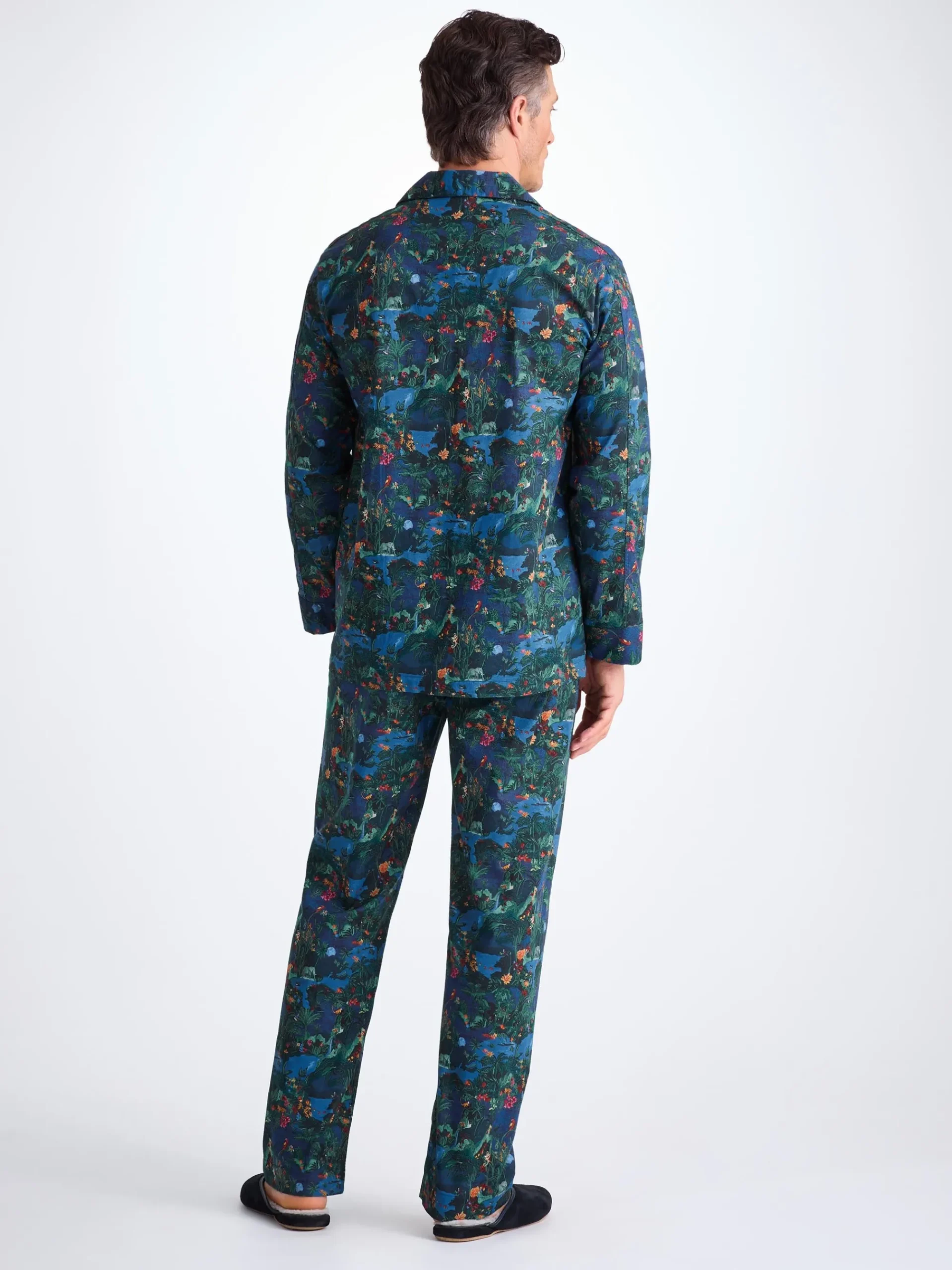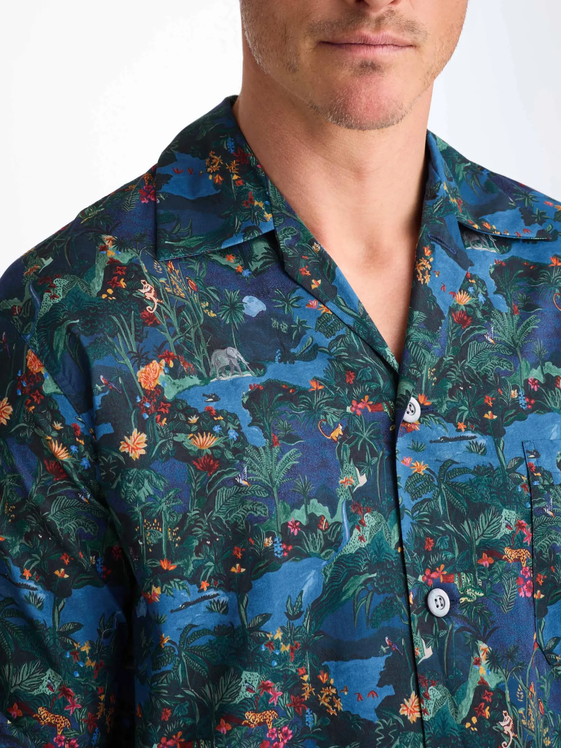 Our midnight jungle print has been created with a design hand painted in acrylic paint by our London design studio. This creation features an array of animals and tropical wildlife. Full of depth and hidden details, take a closer look and explore the midnight jungle. Made with a single breast pocket, classic flat collar, button-through top, and adjustable two-button elasticated waist, they’ll guarantee you drift off peacefully.